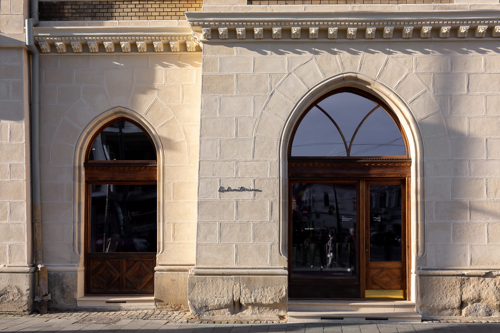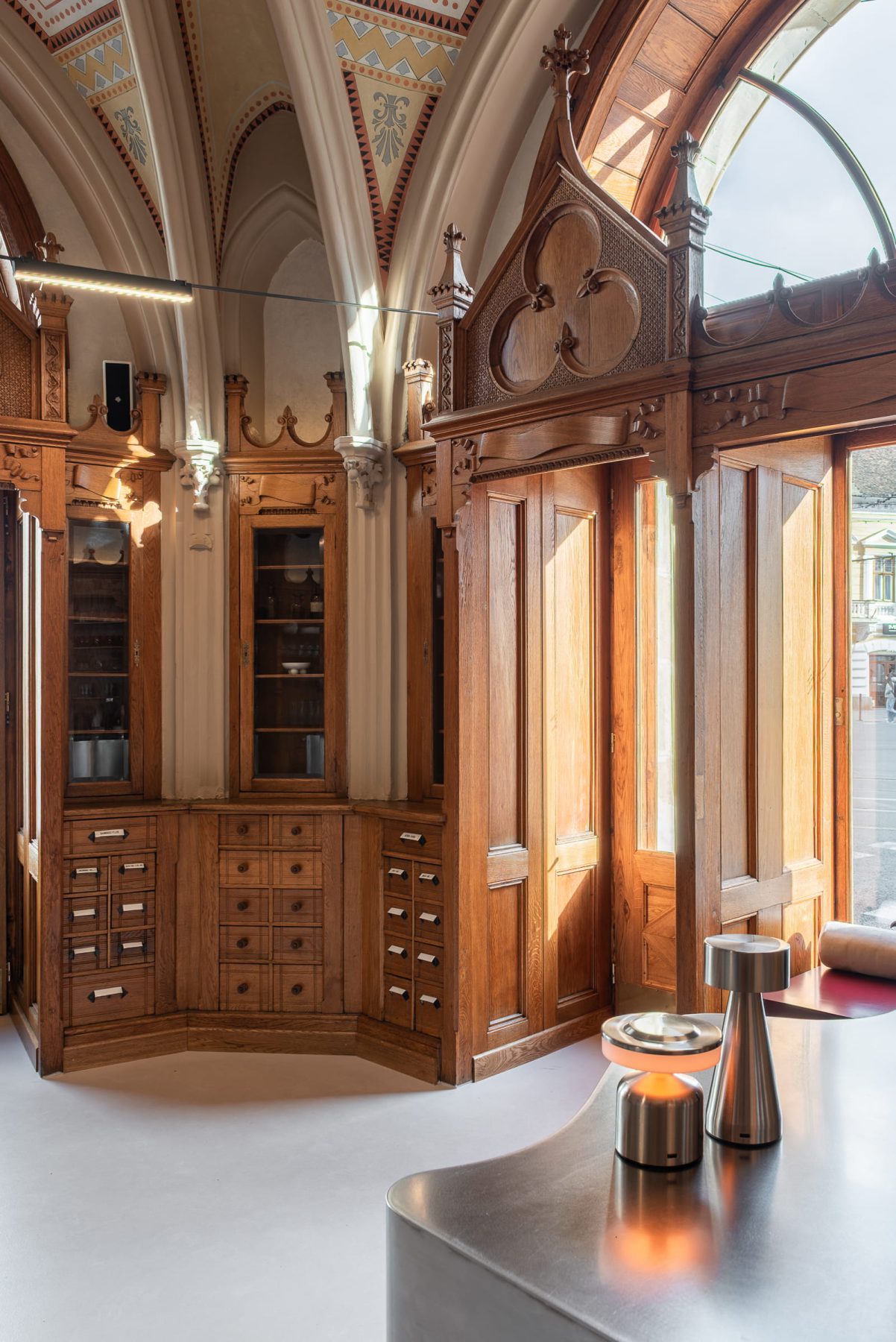 The space occupies the former Matia Corvin Pharmacy, located within Palatul Széki — one of four “report houses” erected at the end of the 19th century to mark the entrance to the city centre. Built in 1893 according to plans by architect Pecz Samu, known for the Central Market Hall in Budapest and his eclectic work incorporating Gothic detailing, the building embodies a restrained neo-Gothic language. Its original client, pharmacist, university professor, and entrepreneur Miklós Széki, resided in the apartment above the pharmacy, accessed via a spiral metal staircase, reinforcing the building’s mixed-use character from its inception.