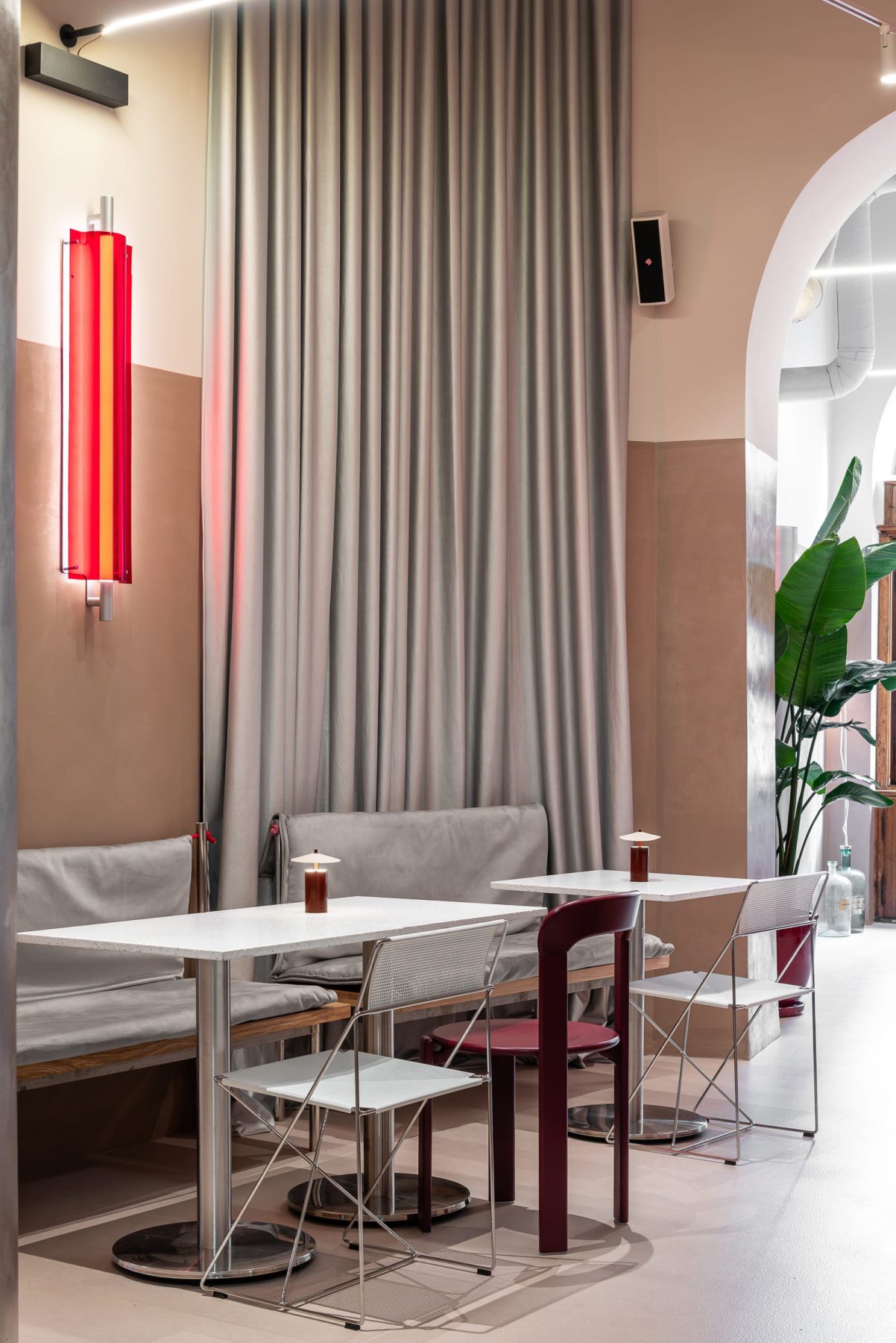 The seating area, situated in the former laboratory, preserves the original skylights and reveals the historical chromatic character of the ceiling through a reconstructed paint layer. Opaline red lighting introduces a subtle scenographic nuance that resonates with the mural decorations and stained-glass elements. The visual identity, developed by The Tailor, deliberately avoids nostalgic references, instead foregrounding the experimental and research-oriented ethos suggested by the name of the space.