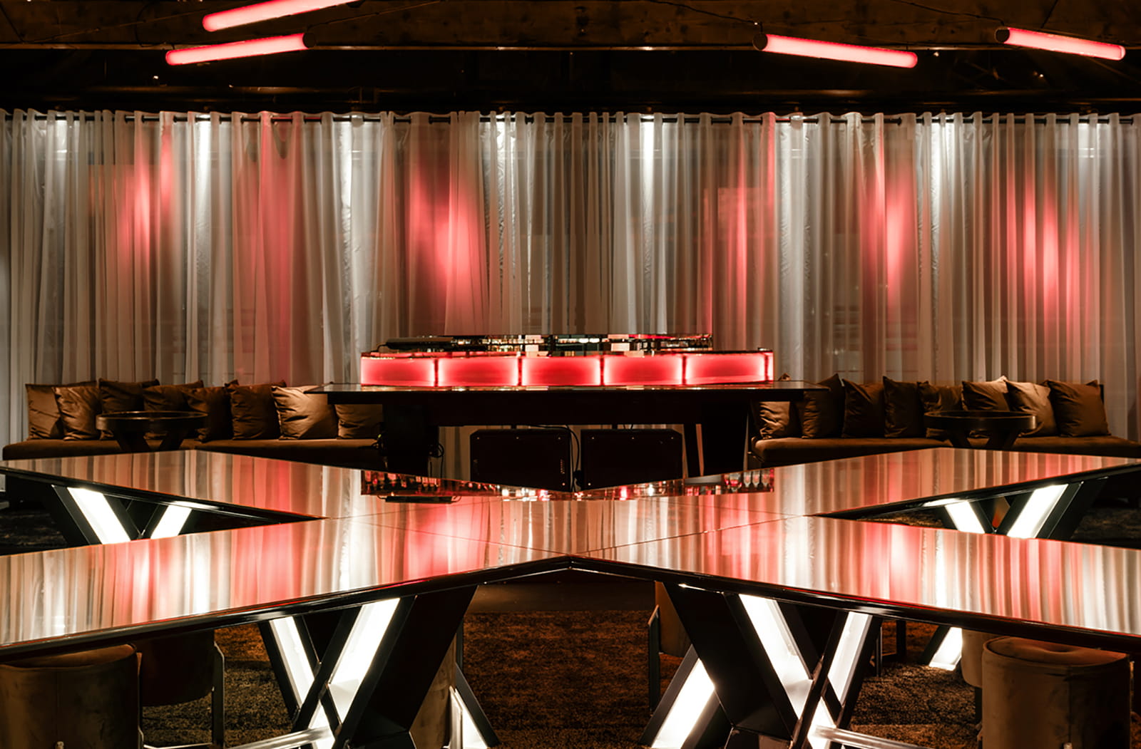 The central X stand immediately reveals the presence of the diagonals upon entry, while these axes are visually extended through the linear ceiling lights and their reflections on its surface. At the same time, the bar and the DJ booth—the only constructions highlighted with intense red lighting at human eye level—are positioned opposite each other.