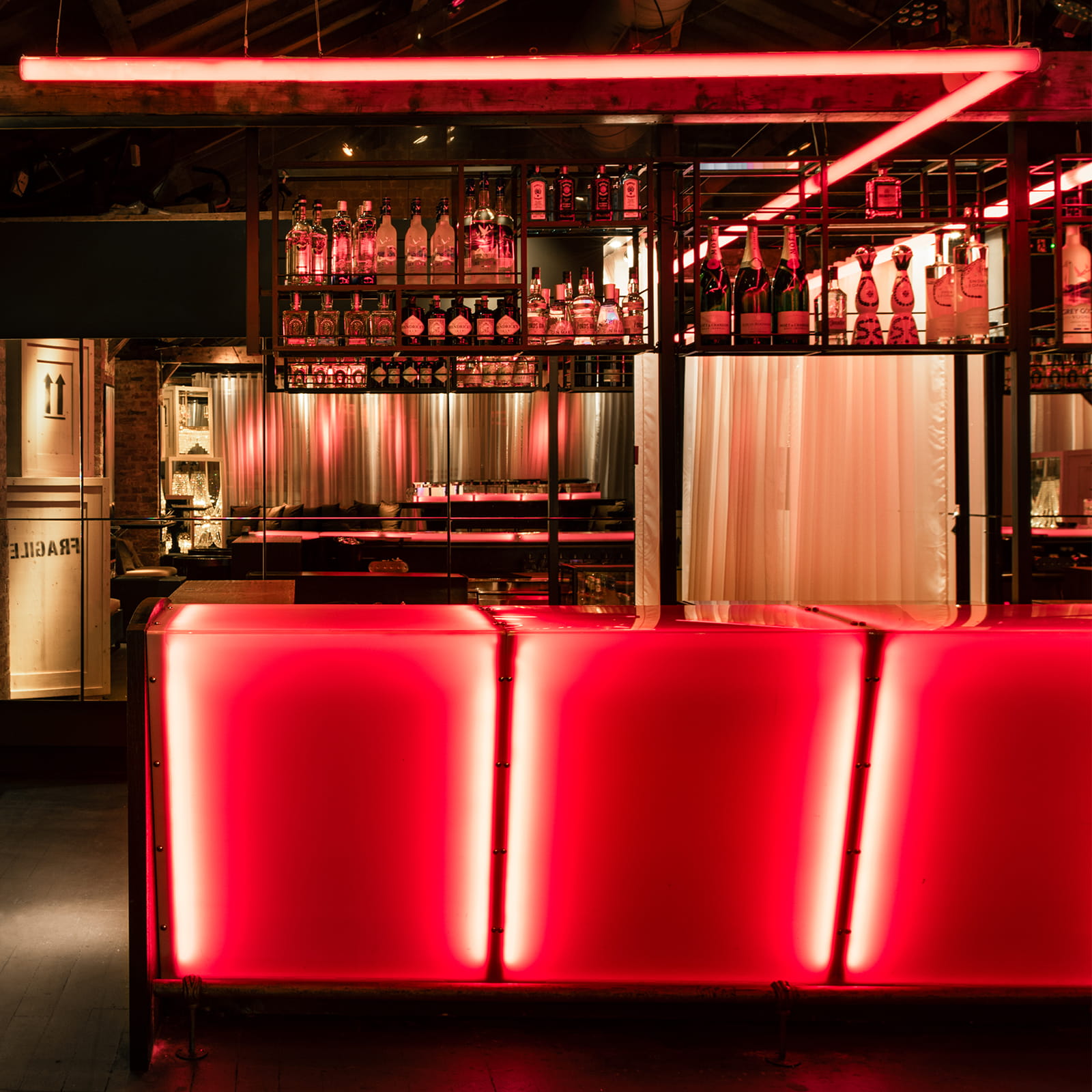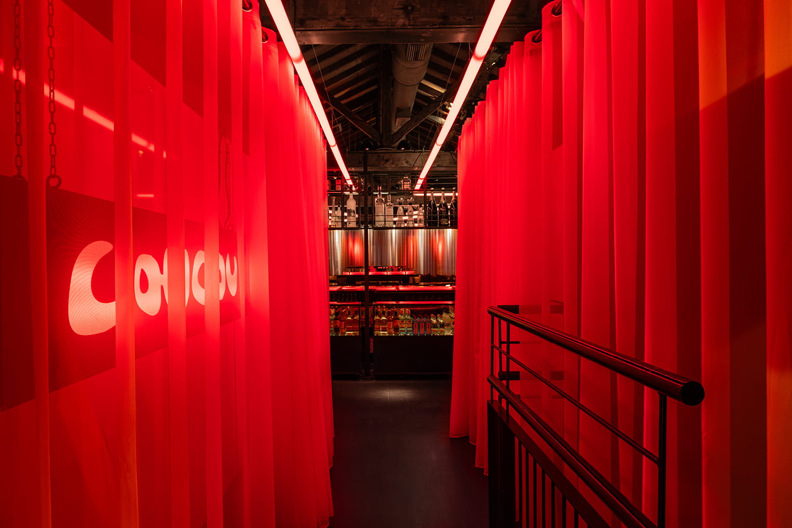 Στο δεύτερο επίπεδο της αποθήκης, πριν από την είσοδο στον κύριο χώρο του πάρτι, διαμορφώνεται ένα ενδιάμεσο πεδίο. Η διέλευση ανάμεσα από δύο ημιδιαφανείς κουρτίνες, φωτισμένες με κόκκινα neon, λειτουργεί ως σταδιακή εισαγωγή στην ατμόσφαιρα του εσωτερικού. Μετά από αυτή τη μεταβατική ζώνη, η πρόσβαση στον χώρο του club πραγματοποιείται σχεδόν υπαινικτικά, δεξιά και αριστερά από το μπαρ.
