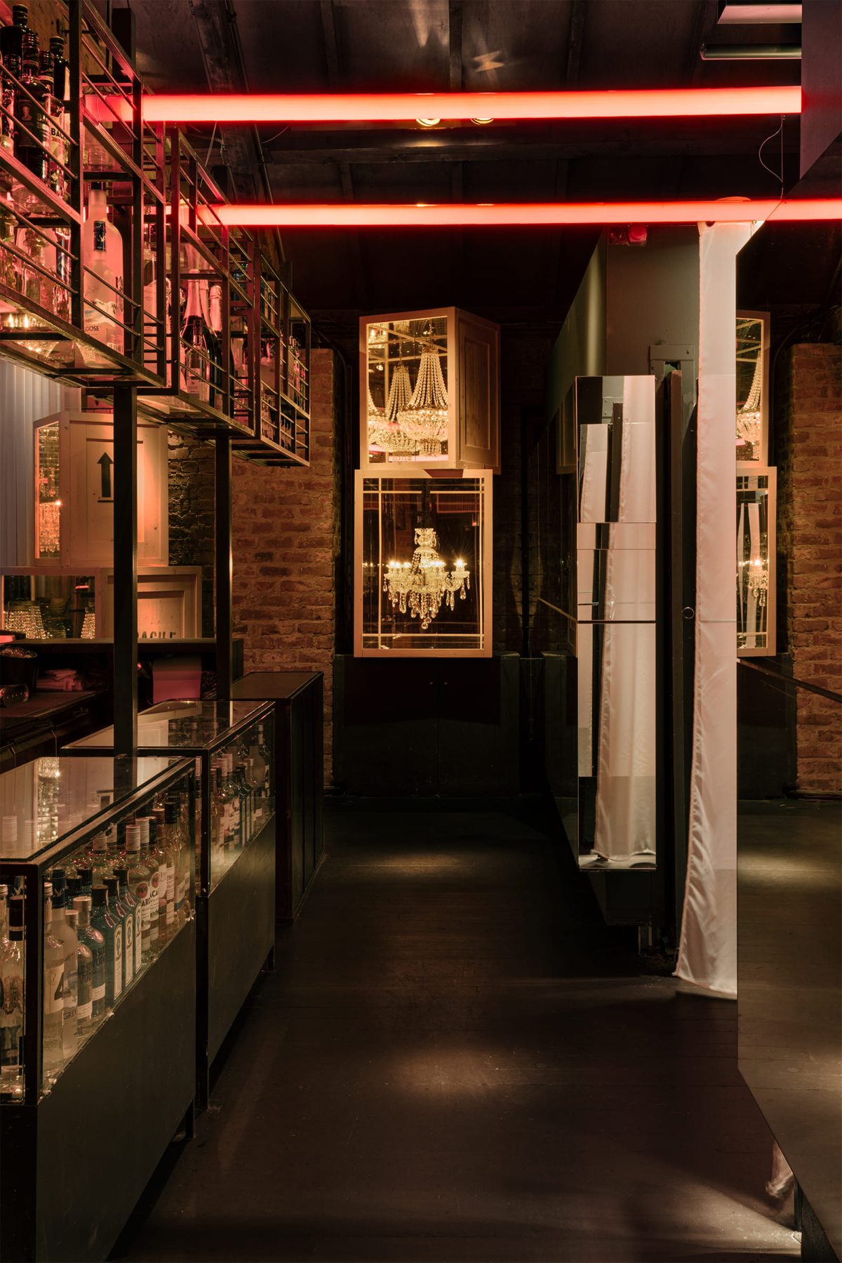 The wooden roof structure and exposed brick walls coexist with materials such as velvet, mirror surfaces, red neon elements and white translucent curtains, creating a pronounced contrast between the rawness of the shell and the theatricality of the nightlife setting.