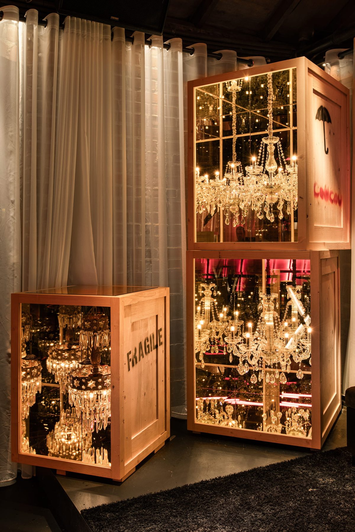 Η ξύλινη οροφή και οι εμφανείς τούβλινοι τοίχοι συνυπάρχουν με υλικά όπως το βελούδο, ο καθρέφτης, οι κόκκινες neon επιφάνειες και οι λευκές ημιδιαφανείς κουρτίνες, δημιουργώντας μια έντονη αντιπαραβολή ανάμεσα στην αδρότητα του κελύφους και τη θεατρικότητα της διασκέδασης.