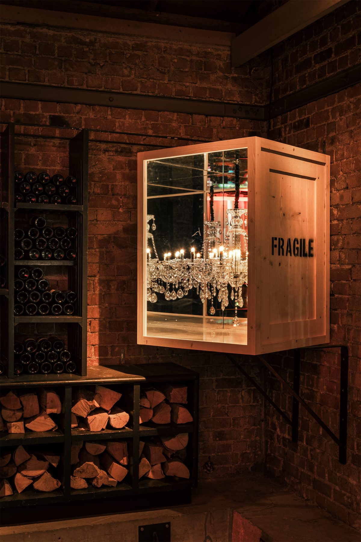 Στις επιφάνειες των τραπεζιών καθρεφτίζονται συνεχώς τα υλικά, τα φώτα και η κίνηση του χώρου, ενισχύοντας τη συνολική ατμόσφαιρα. Η θερμή παλέτα των κόκκινων neon φωτισμών διαμορφώνει τον χαρακτήρα του εσωτερικού, ενώ τα ξύλινα κιβώτια, ως λειτουργικά στοιχεία, επανανοηματοδοτούνται και εντάσσονται στο βιομηχανικό σκηνικό.