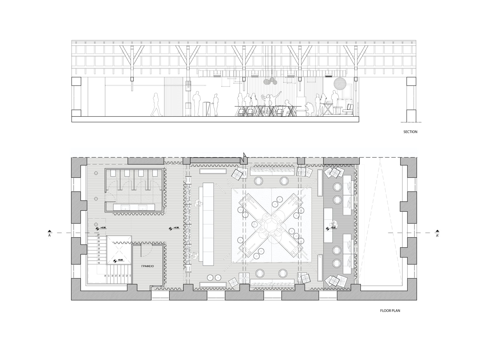 Το κεντρικό X stand καθιστά άμεσα αντιληπτή την ύπαρξη των διαγωνίων κατά την είσοδο, ενώ αυτές επεκτείνονται οπτικά μέσω των γραμμικών φωτιστικών της οροφής και των αντανακλάσεών τους στην επιφάνειά του. Παράλληλα, το μπαρ και το DJ booth —οι μοναδικές κατασκευές με έντονο κόκκινο φωτισμό στο επίπεδο κίνησης του ανθρώπου— τοποθετούνται αντικριστά.