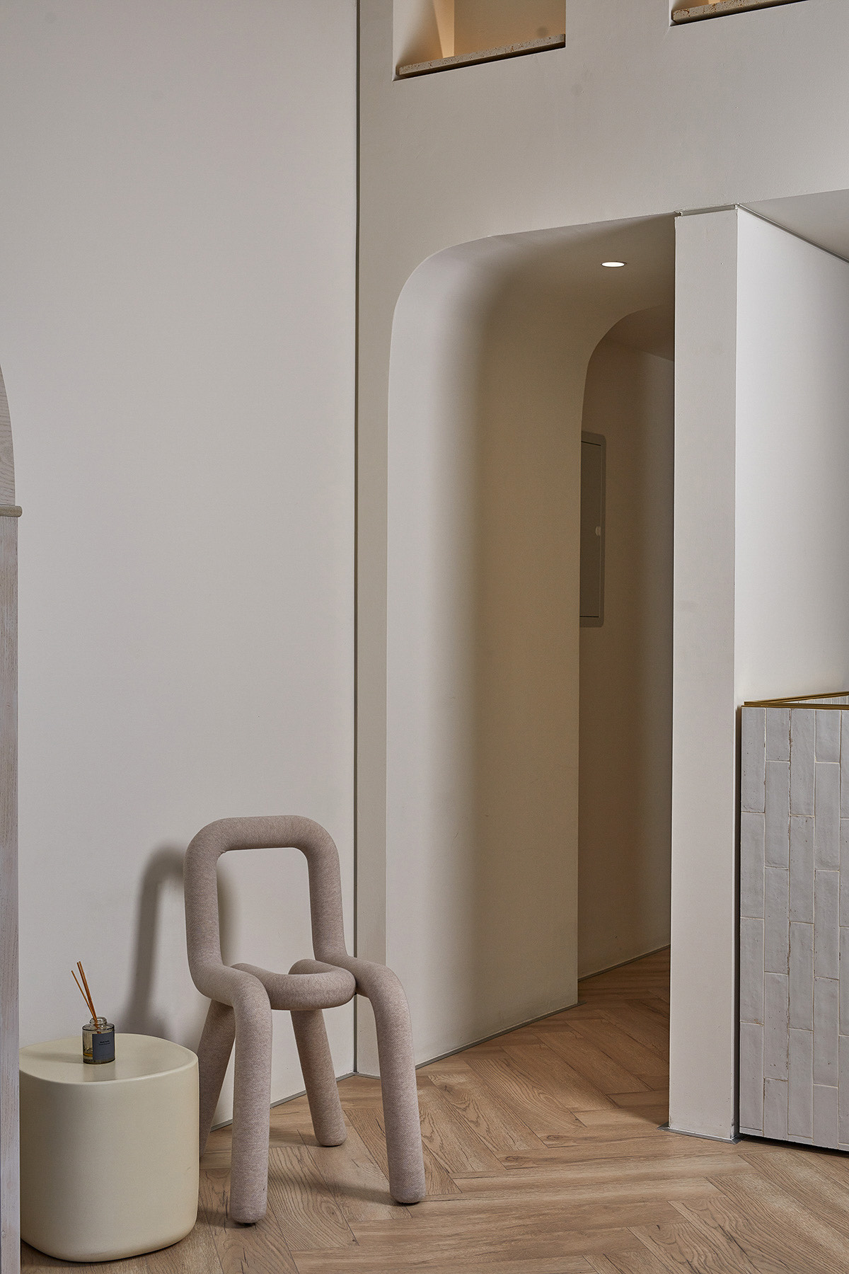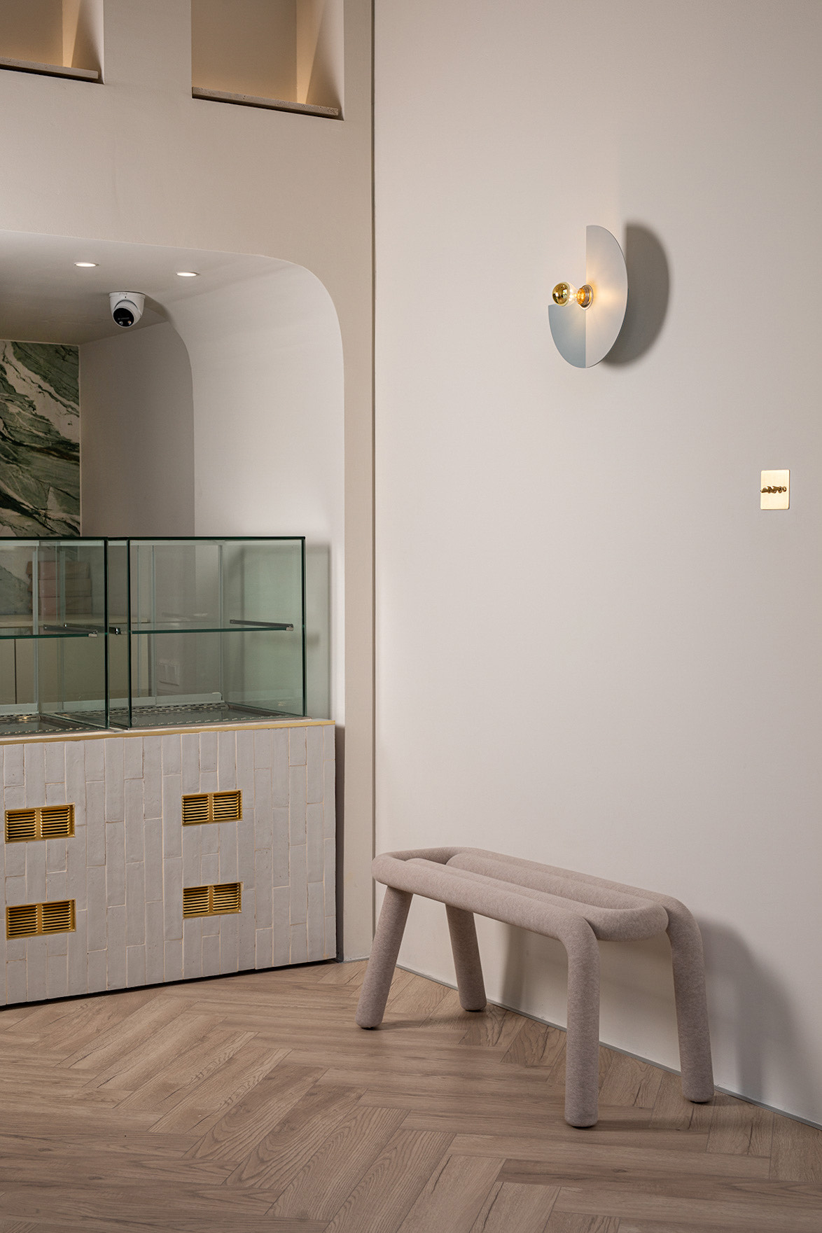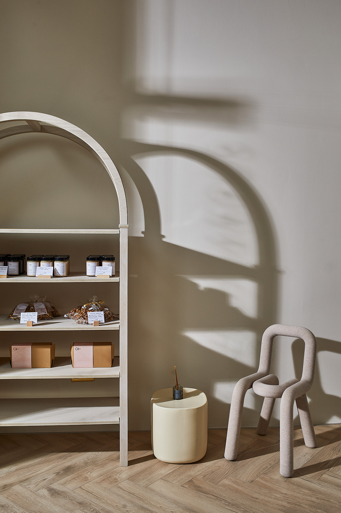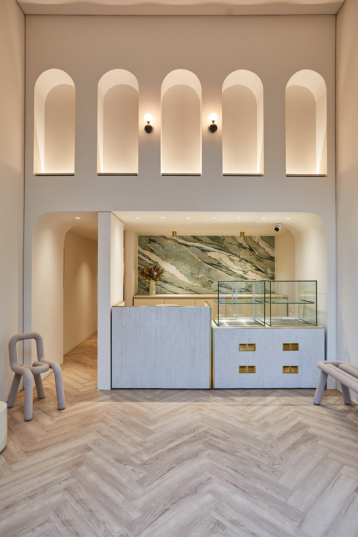 In this soft and calming environment STUDIOADCH drew inspiration from the symmetrical and repetitive elements of the Italian rationalist movement to create a set of illuminated arches as a reference to the repetitive-everyday commitment of the brand to serve healthy-all natural snacks to its clients.