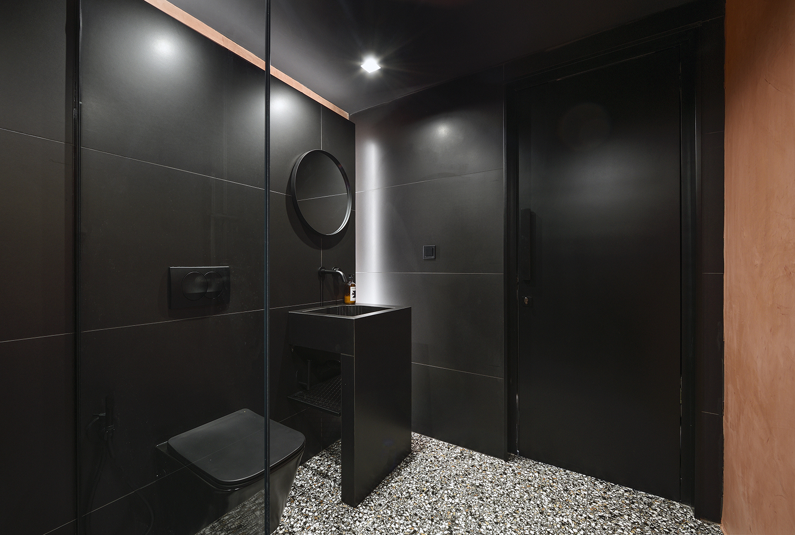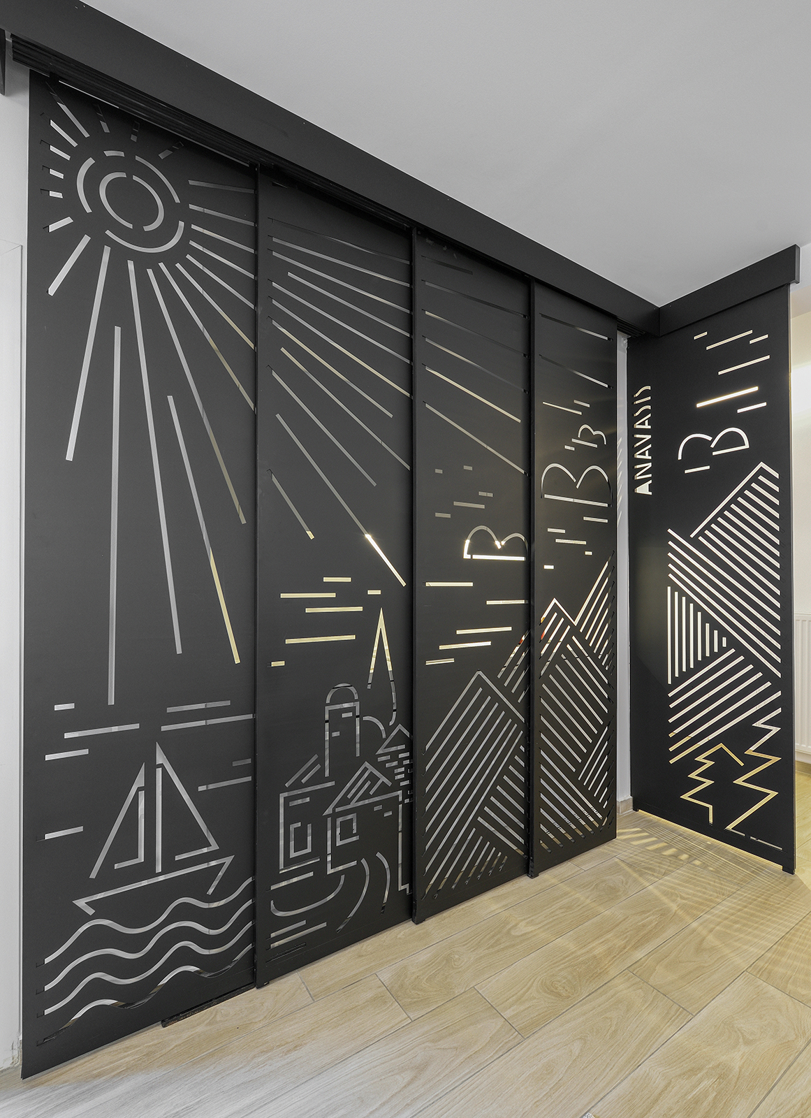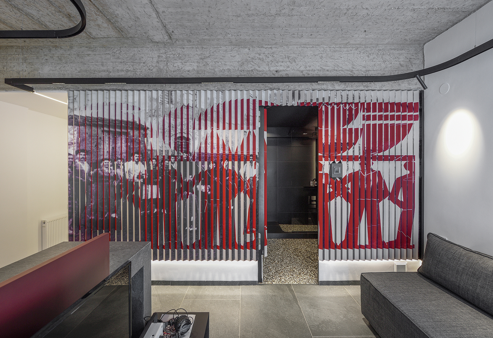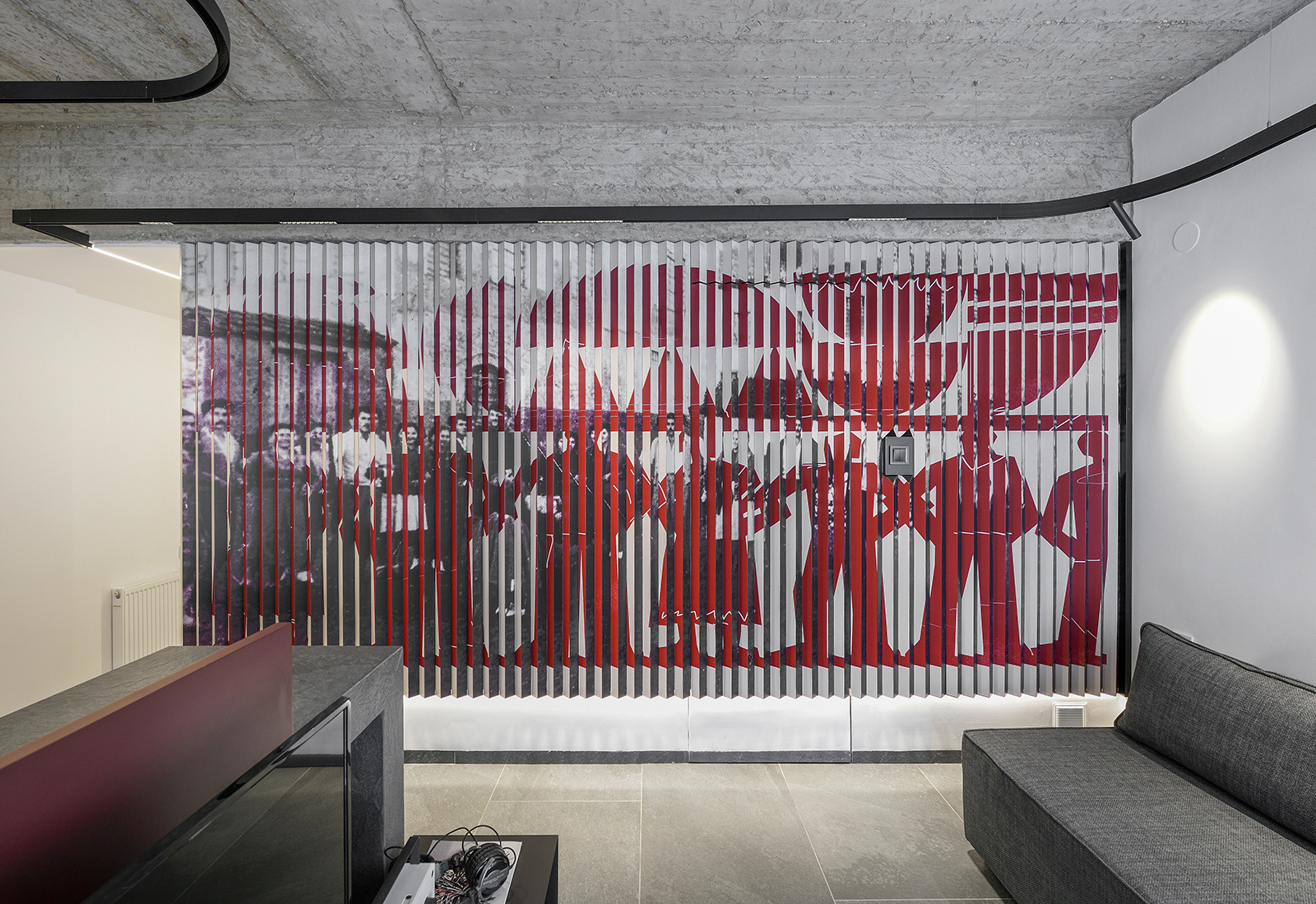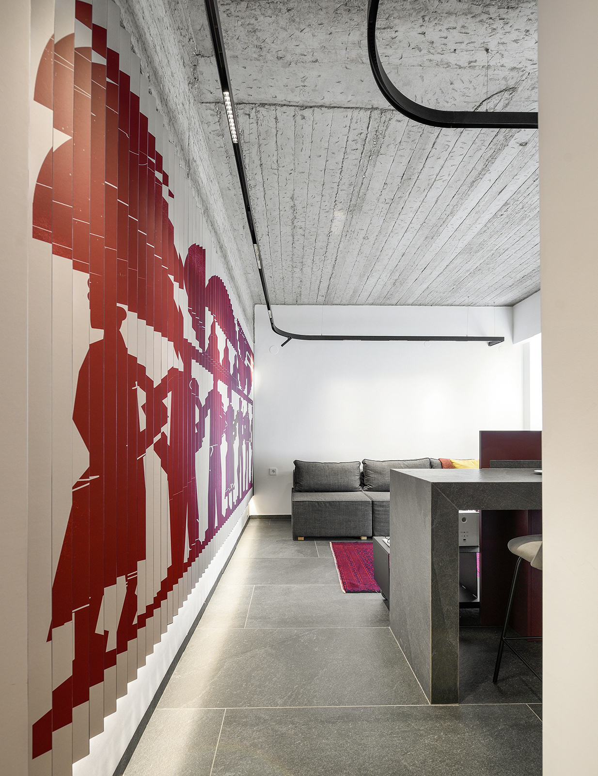 Architectural elements such as textured surfaces, partitions, and movable perforated panels enhance functionality, introduce interactivity, and at the same time, remind visitors of the authentic origins of the space.