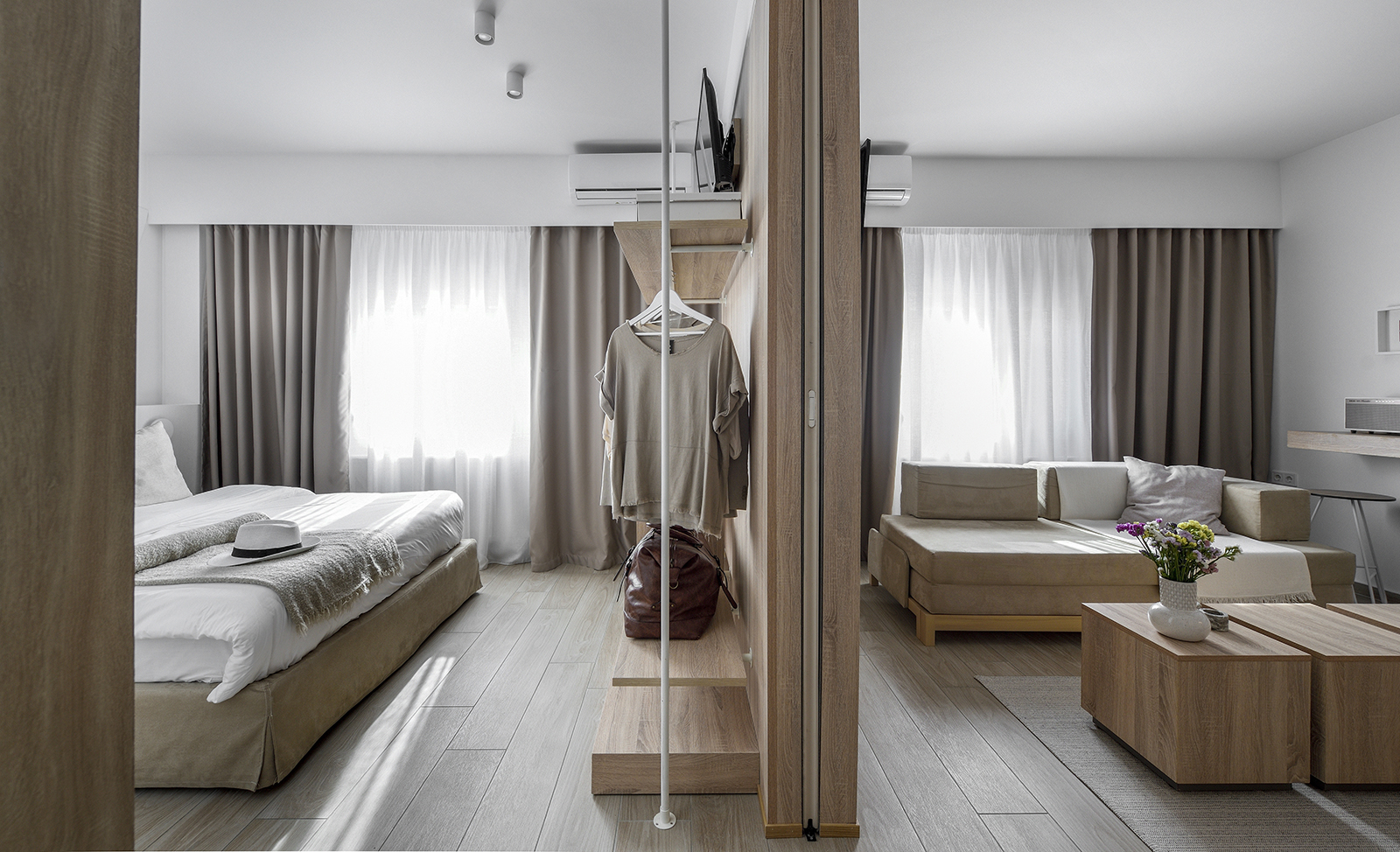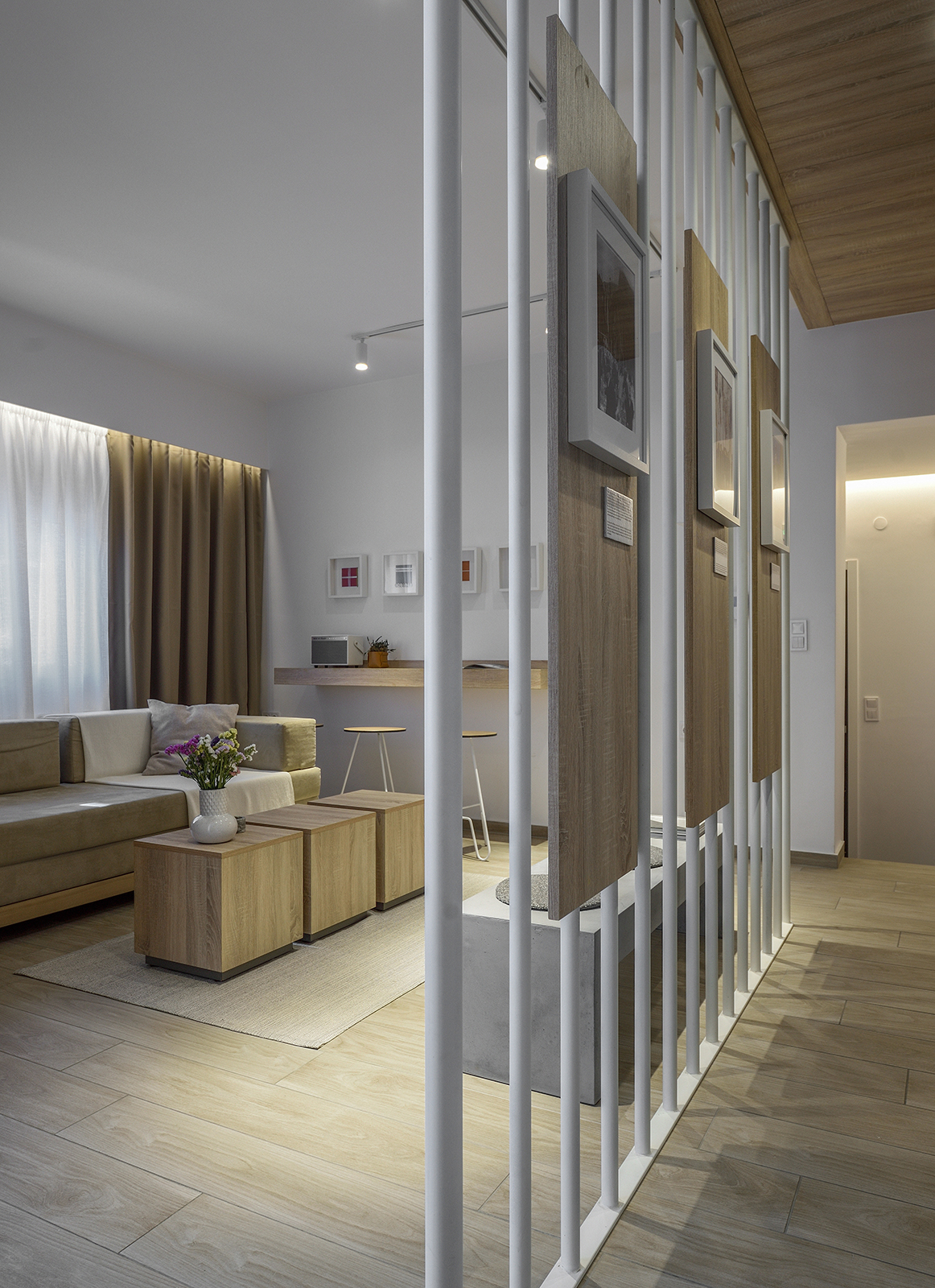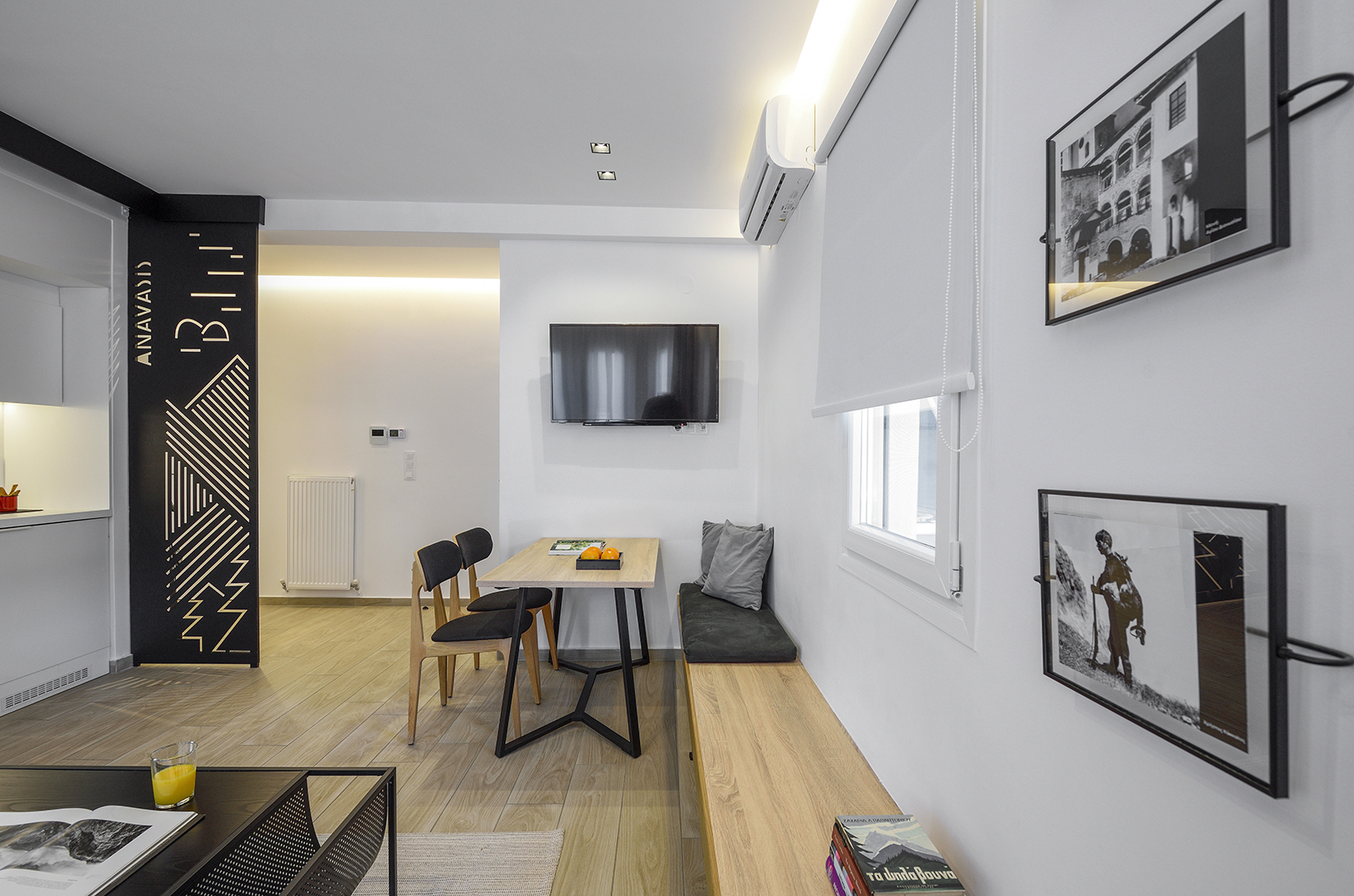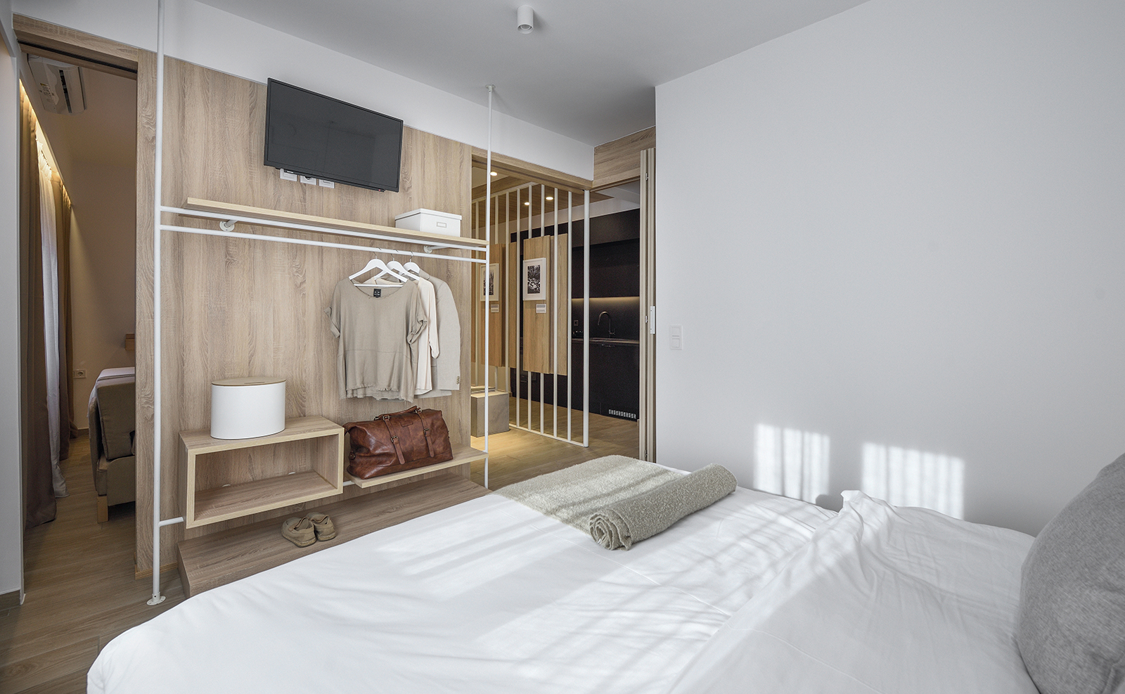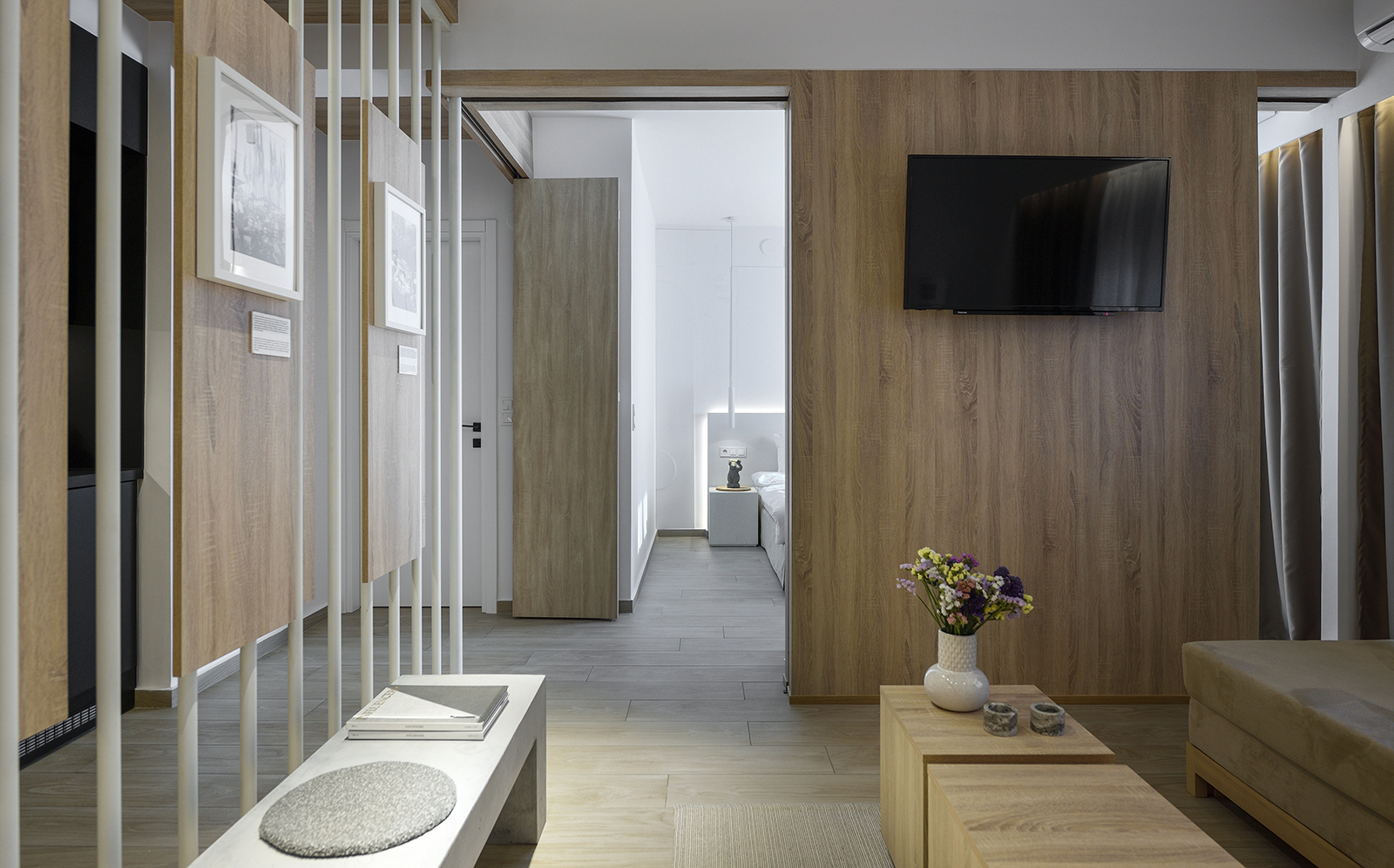 The design is based on the concept of narrative architecture, where every element of the space tells a story. By using modern materials with a traditional expression, the composition evokes a sense of familiarity and timeless durability. Each apartment narrates a different story, from the first ascent of Mount Olympus in 1913 and the traditional “Belitikos” dance, to the Byzantine ritual of Sichna.