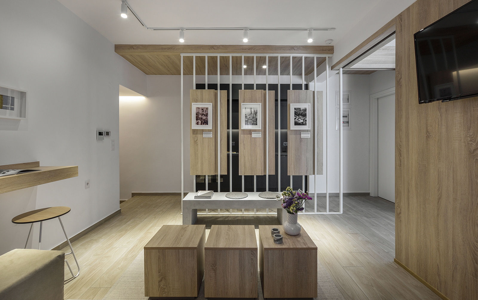 Χρησιμοποιώντας σύγχρονα υλικά με παραδοσιακή εκφορά, η σύνθεση αποκτά αίσθηση οικειότητας και διαχρονικής αντοχής.