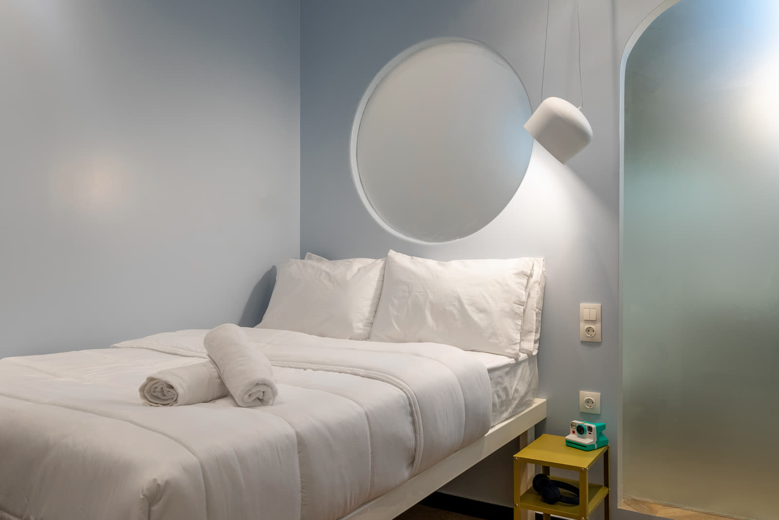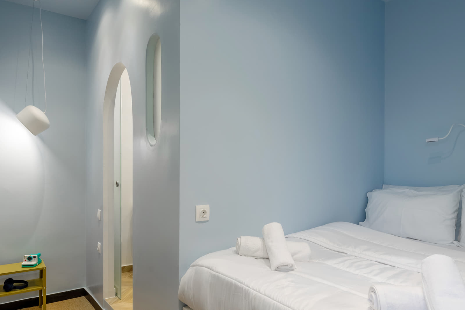 The use of jute instead of carpet, herringbone tiles in the bathrooms, and a palette inspired by the urban hues of Athens sky blue, burnt orange, olive green all contribute to a design identity rooted in texture, memory, and place.