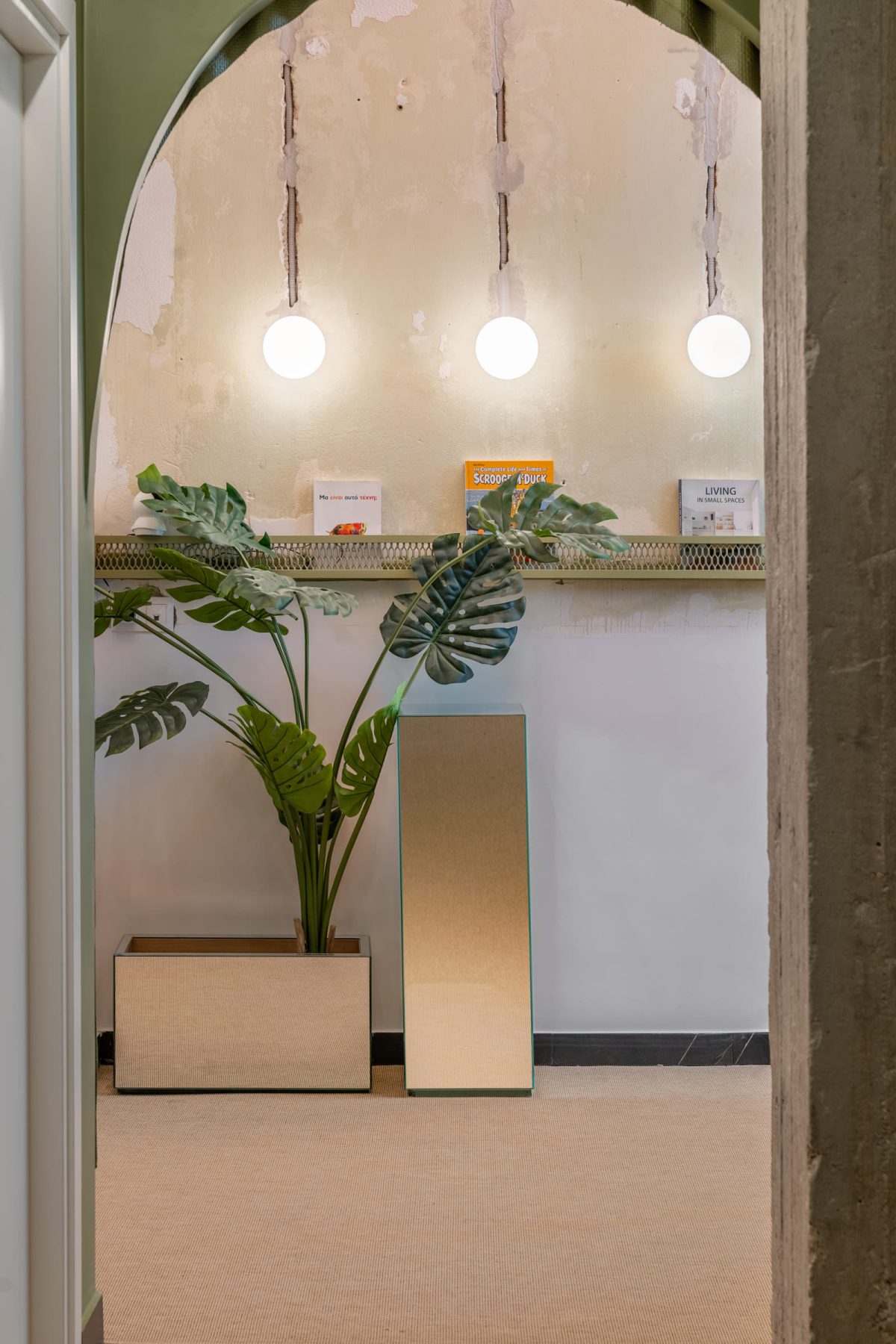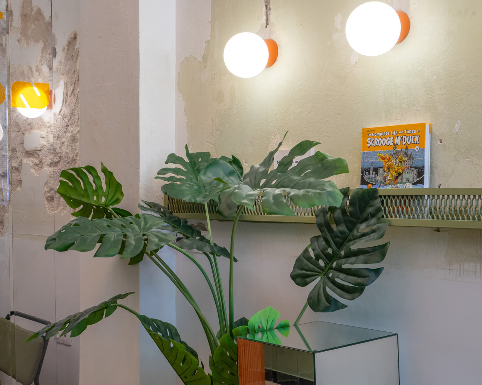 Η επιλογή γιούτας αντί για μοκέτα, το ψαροκόκαλο στα δάπεδα των λουτρών, και η χρωματική παλέτα εμπνευσμένη από την αστική Αθήνα, γαλάζιο, πορτοκαλί, λαδί , ενισχύουν μια ταυτότητα με μνήμη, υλικότητα και τοπική αναφορά.