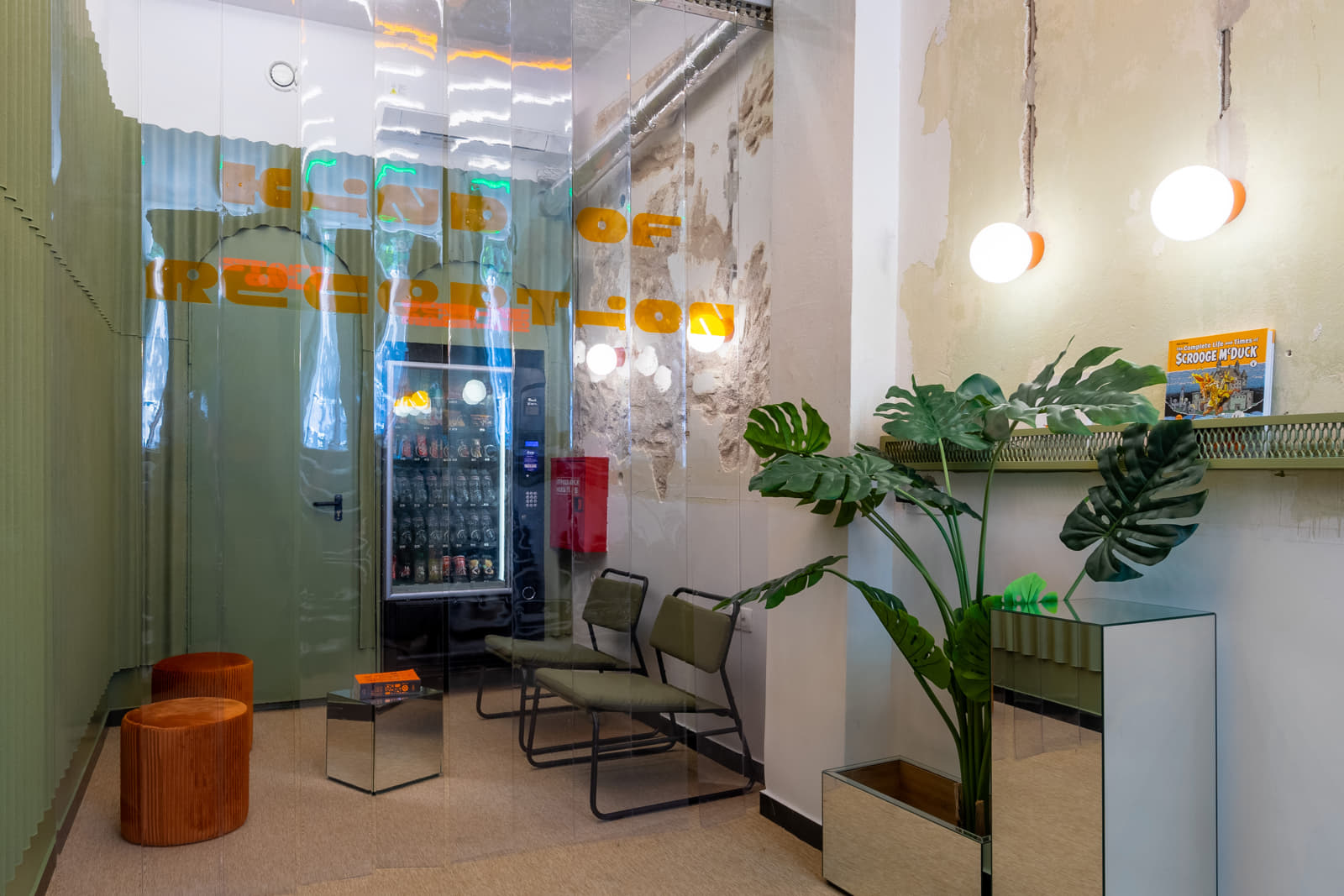Ιδιαίτερα χαρακτηριστικά, όπως η κυματοειδής λαμαρίνα στη reception και το έπιπλο καθρέφτης, ενισχύουν την υβριδική ταυτότητα του project.