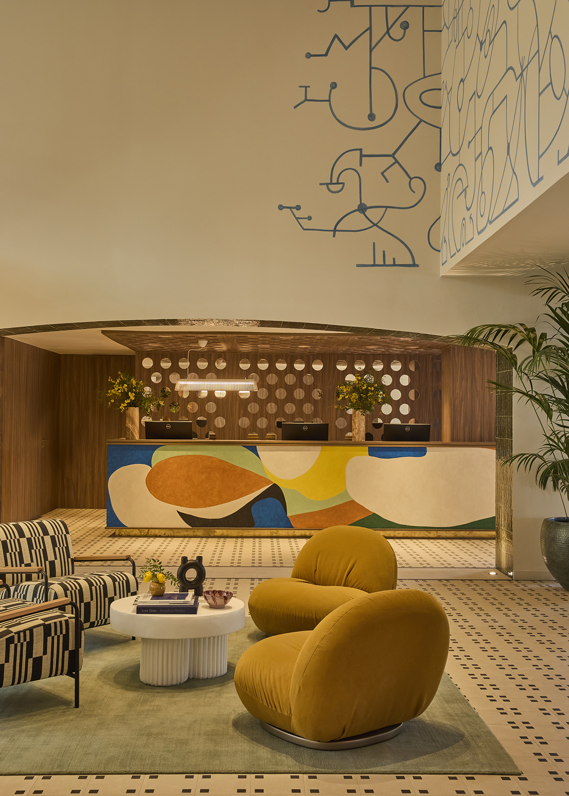 Upon entering the lobby and lounge areas , guests are welcomed by a warm and inviting ambience with a white Mediterranean background, wooden elements , and colourful furnishings inspired by the 70s . Hand-painted murals inspired by Picasso add an artistic touch, evoking the home of an art enthusiast.