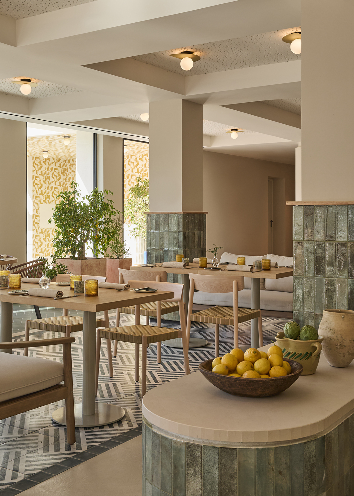 Near the kitchen and buffet, and enhancing the s pace’s local character, tiles shift to traditional Andalusian patterns with blues and yellow hues. A carefully curated layout fosters cos y dining experiences. Angled walls create intimate corners while breaking uniformity. Large openings in these walls enhance fluidity and depth, maintaining an open yet inviting atmosphere.