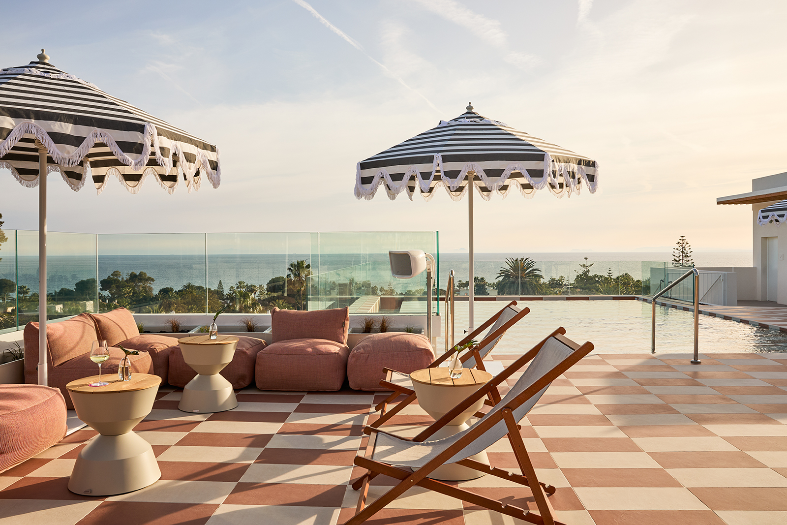 Descending to the lower level, a panoramic pool, framed by retro tile motifs , stretches toward the splendid Mediterranean views. During the day, the s pace offers a casual, laid-back vibe; by night, it trans forms into a sophisticated, elevated experience.