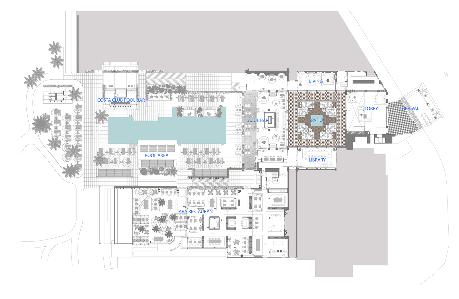 The existing Andalusian patio, one of the hotel’s original and essential elements , is enhanced with more lush vegetation, simplified architectural features, a Mediterranean material palette, and a central sculptural water element that becomes the focal point.