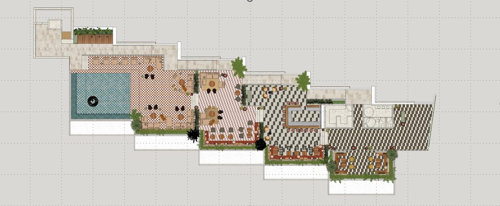 In summary, a mix of retro glamour, unexpected details, and suns et aesthetics, this rooftop is a bold reimagination of classic ’70s Mediterranean chic.