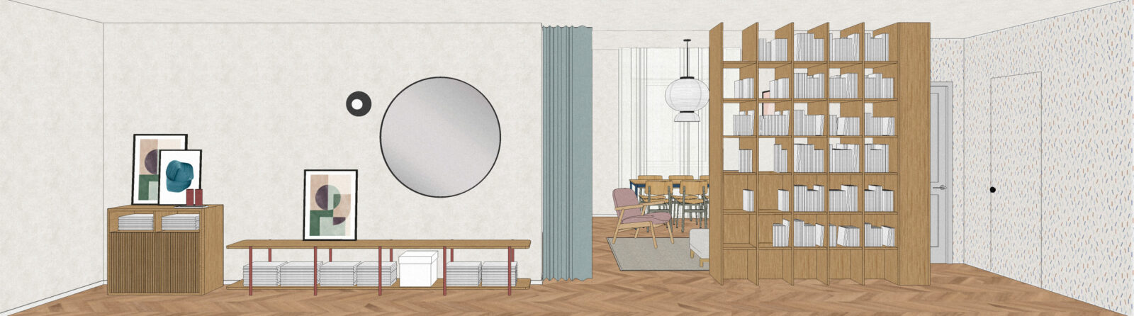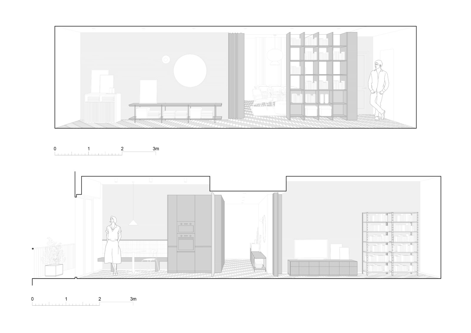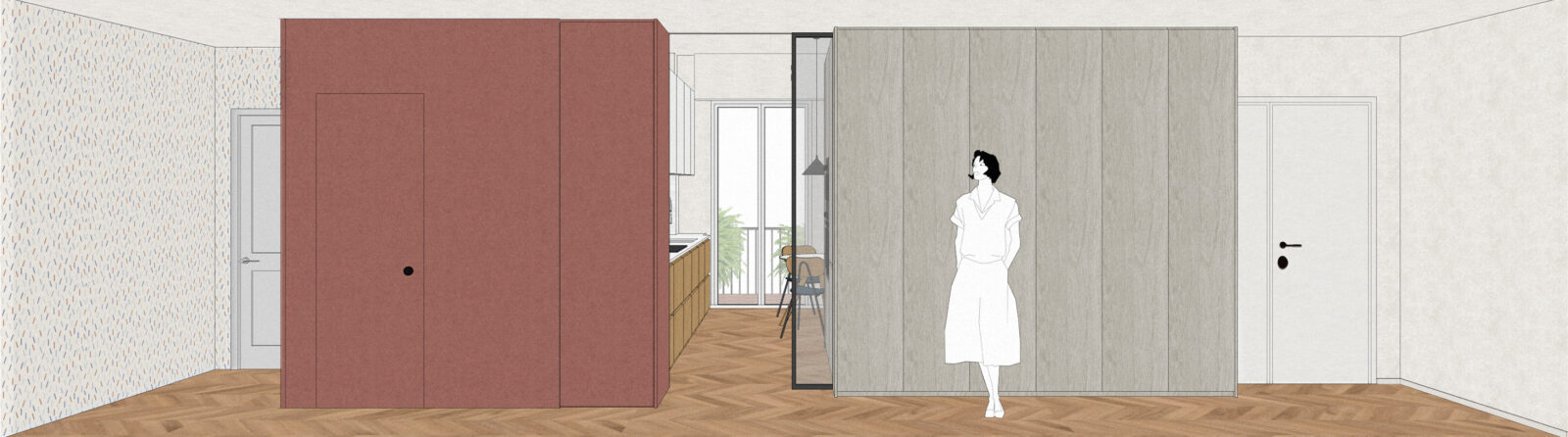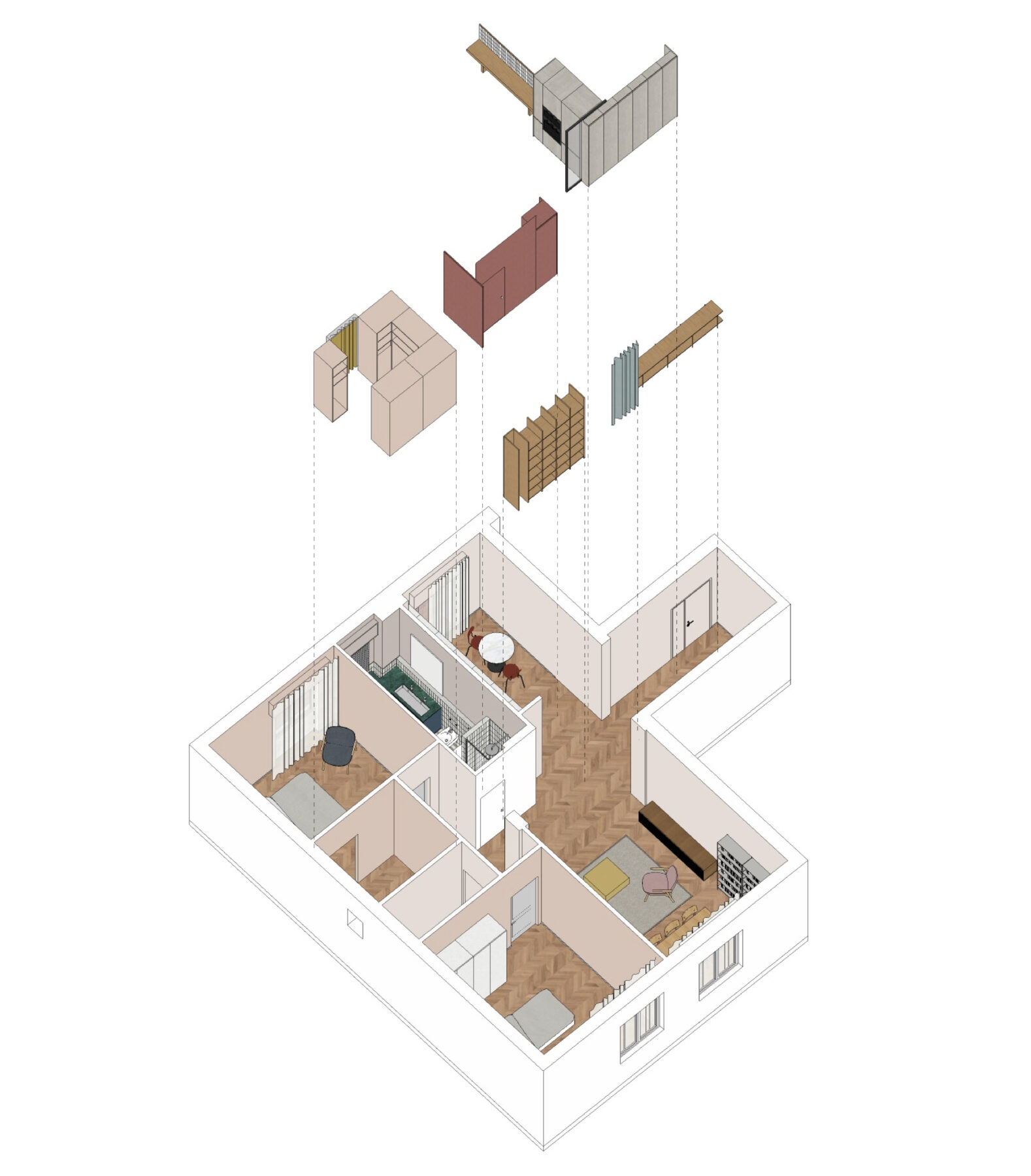 The owners are a young couple: Alice is apassionate about fashion and clothes and devotes herself to numerous pastimes that have manual skills as their common denominator and that lead her to need storage furniture where she can store all the materials she needs. Diego, on the other hand, is involved in urban regeneration and needed a place where he could work and study. The studio was involved with the request to design an informal and hospitable space where he could welcome friends and cherish his lifelong passions. The project was immediately confronted with the organisation of the existing spaces, arranged around a central pathway, with a clear division between living and sleeping areas. Internal circulation was interrupted by the presence of the corridor, made dark by the poor passage of natural light. The design path opens up to the possibilities of space and the needs of the two young owners. The intervention completely transforms and revises the existing building, trying to make the rooms as connected and bright as possible, taking advantage of the flat’s double exposure. The walls in the centre of the flat are eliminated to connect the rooms and make circulation fluid.