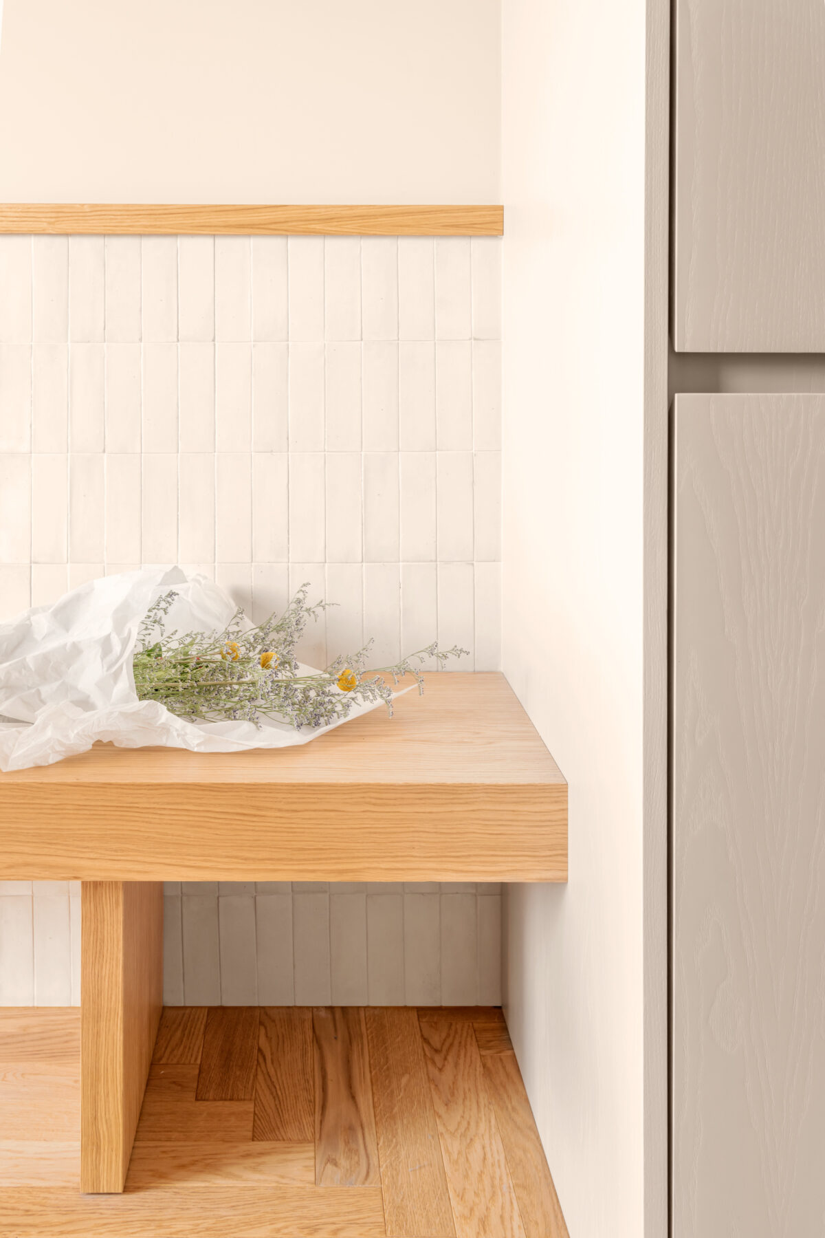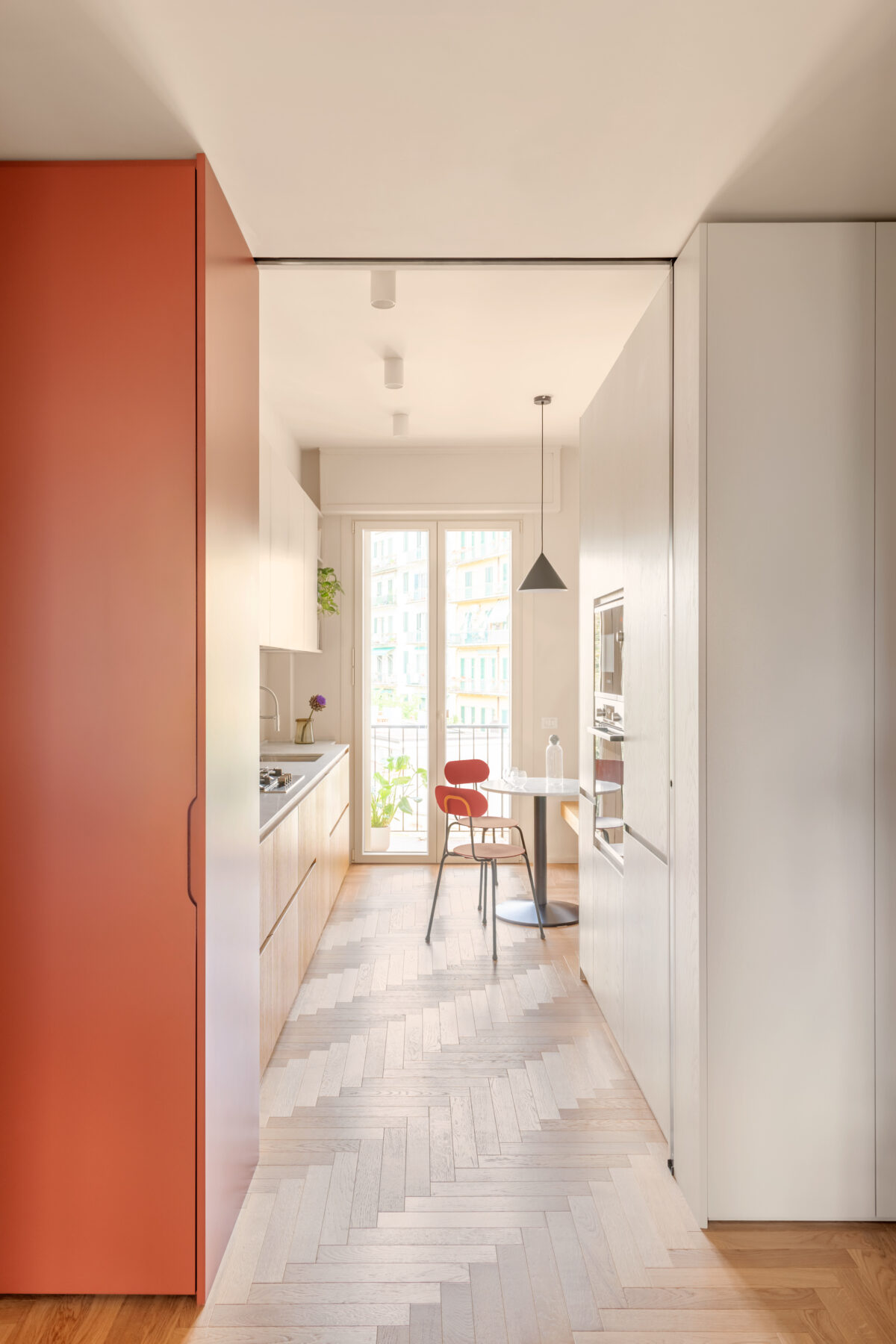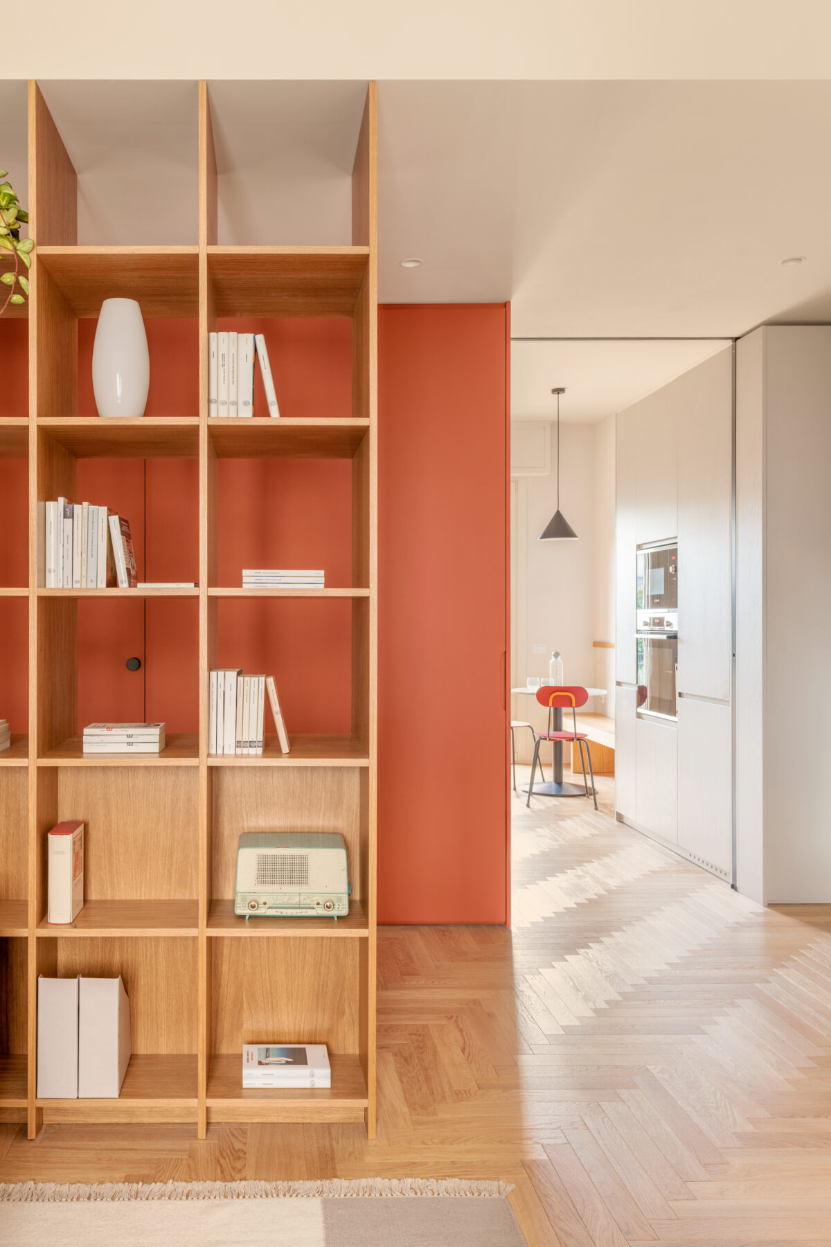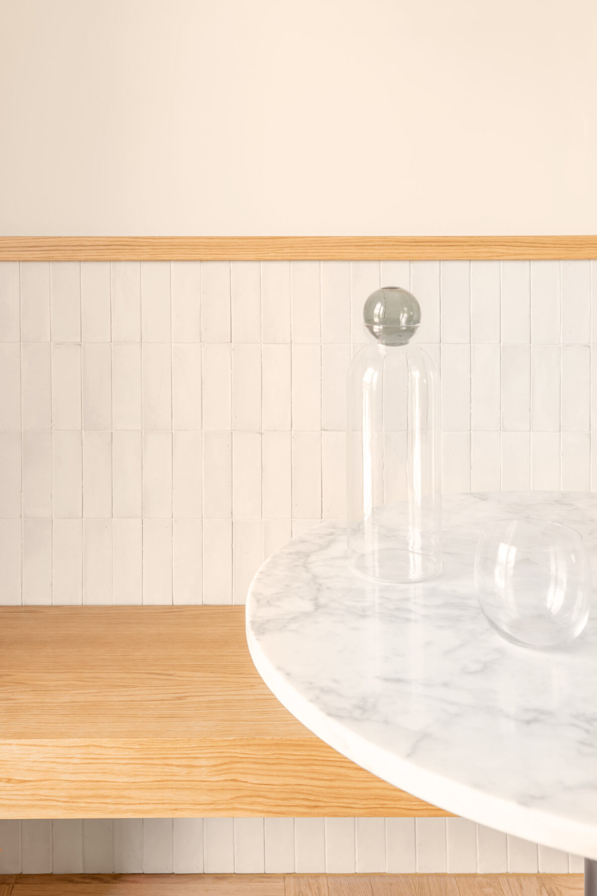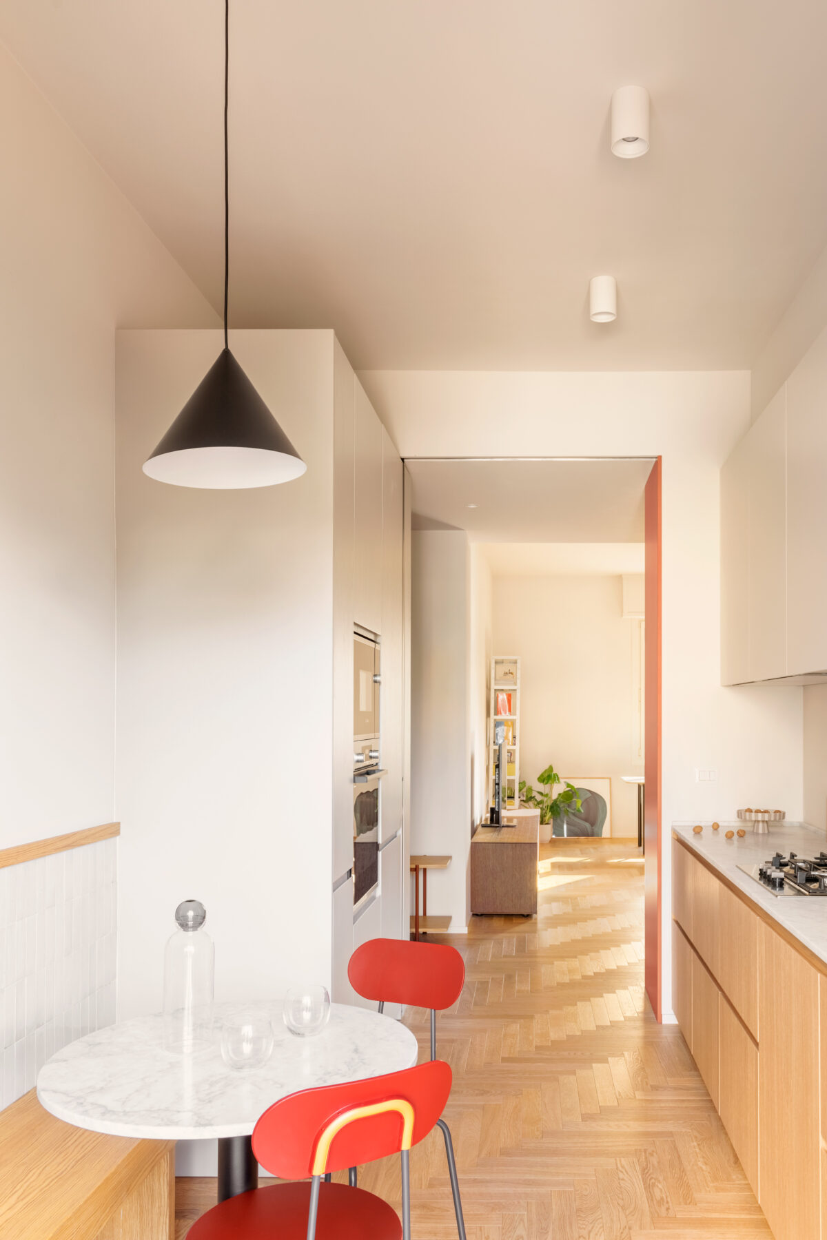“The project is the synthesis of a wide-ranging and articulated process developed with the clients, in a continuous dialogue that could bring out their needs, daily habits, special requirements and could therefore create a space tailored to their needs and to their expectations”. Lavinia Modesti. The kitchen is completely renovated, distributing the furniture and organising the activities on the two main sides of the space. The kitchen furniture designed by the studio is modelled on the characteristics of the space. The choice of materials makes it cosy and informal, the natural oak cabinetry and the Carrara marble top are balanced with the lacquered wall units. Along the opposite wall, there is the volume containing the columns and the pantry, which continues towards the door to the balcony with an oak bench with a rectangular white tile backrest. The bench is used as a seat for a small circular table, also made of Carrara marble, where one can eat in company or share food preparation.