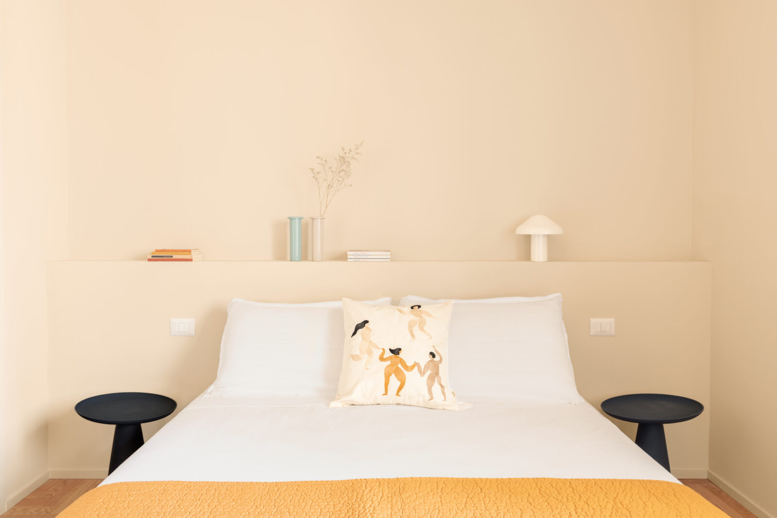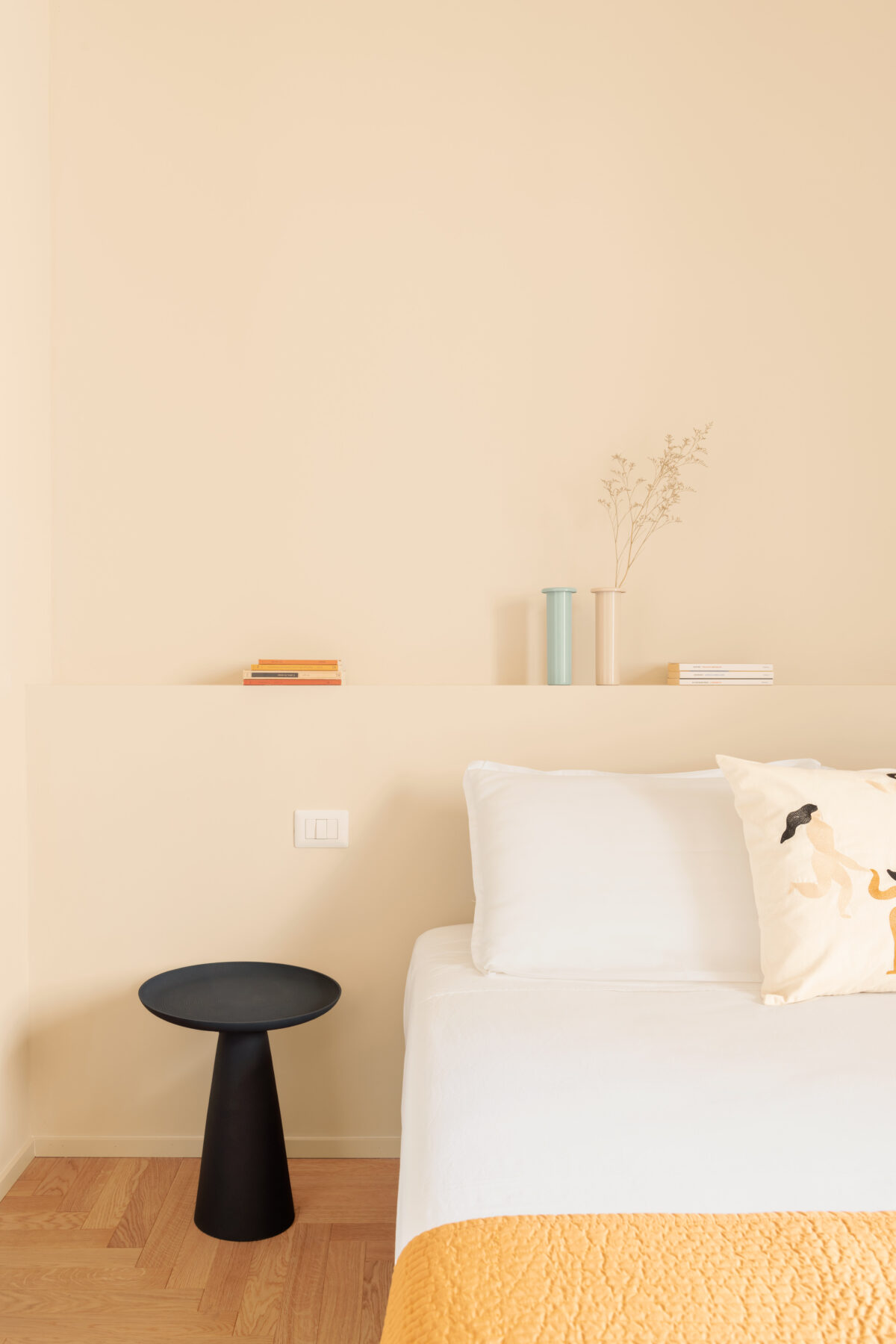 The central distribution space is now an open space, divided only by a full- height sliding panel, which allows the division of the living and sleeping area. This space is overlooked by the various furnishing volumes, which dialogue with each other and relate the spaces. The volumes are designed by clear geometries, according to different tones and materials, and alternate with the two concealed sliding doors that open and close as required. In the central space there is a false ceiling with a lowered height compared to the other rooms in the house.