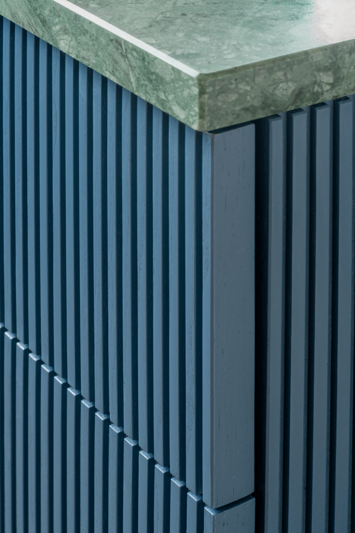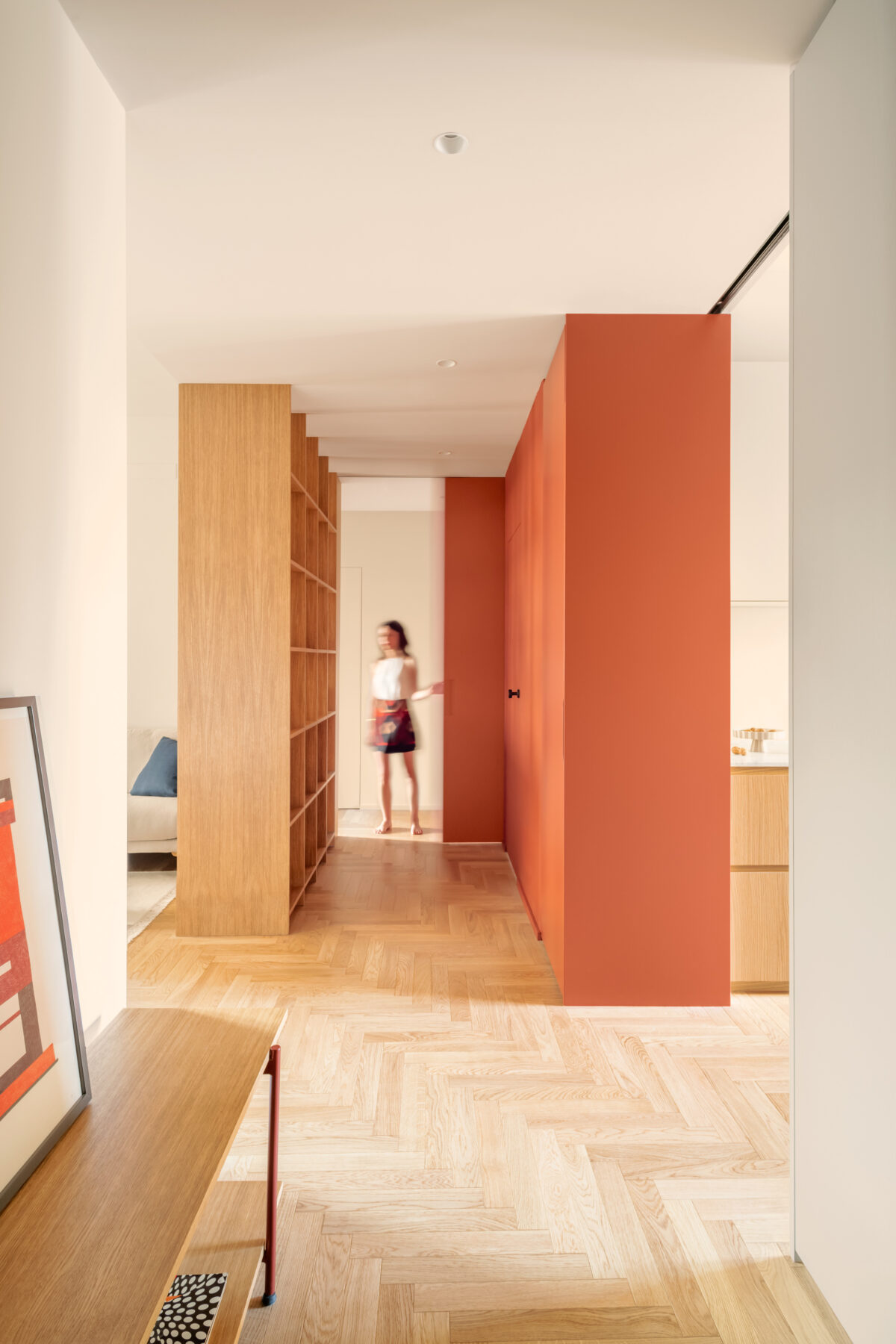 The entrance wall to the bathroom houses a storage unit that borders the kitchen and a full-height sliding panel that delimits the living area, all painted brick red to even out the surface and conceal the access door to the bathroom. These elements are configured as a unique volume, which faces directly onto the central space, alternating the colour of the surfaces with neutral or natural essences of the other volumes. The bathroom is organised with a masonry shower compartment next to the entrance, thus freeing up the only window on the wall opposite the entrance where a cabinet is set up that not only contains the washbasin but also houses the washing machine. Designed by the studio, the cabinet characterises the bathroom with its lacquered canned finish and large Guatemala Green marble top.
