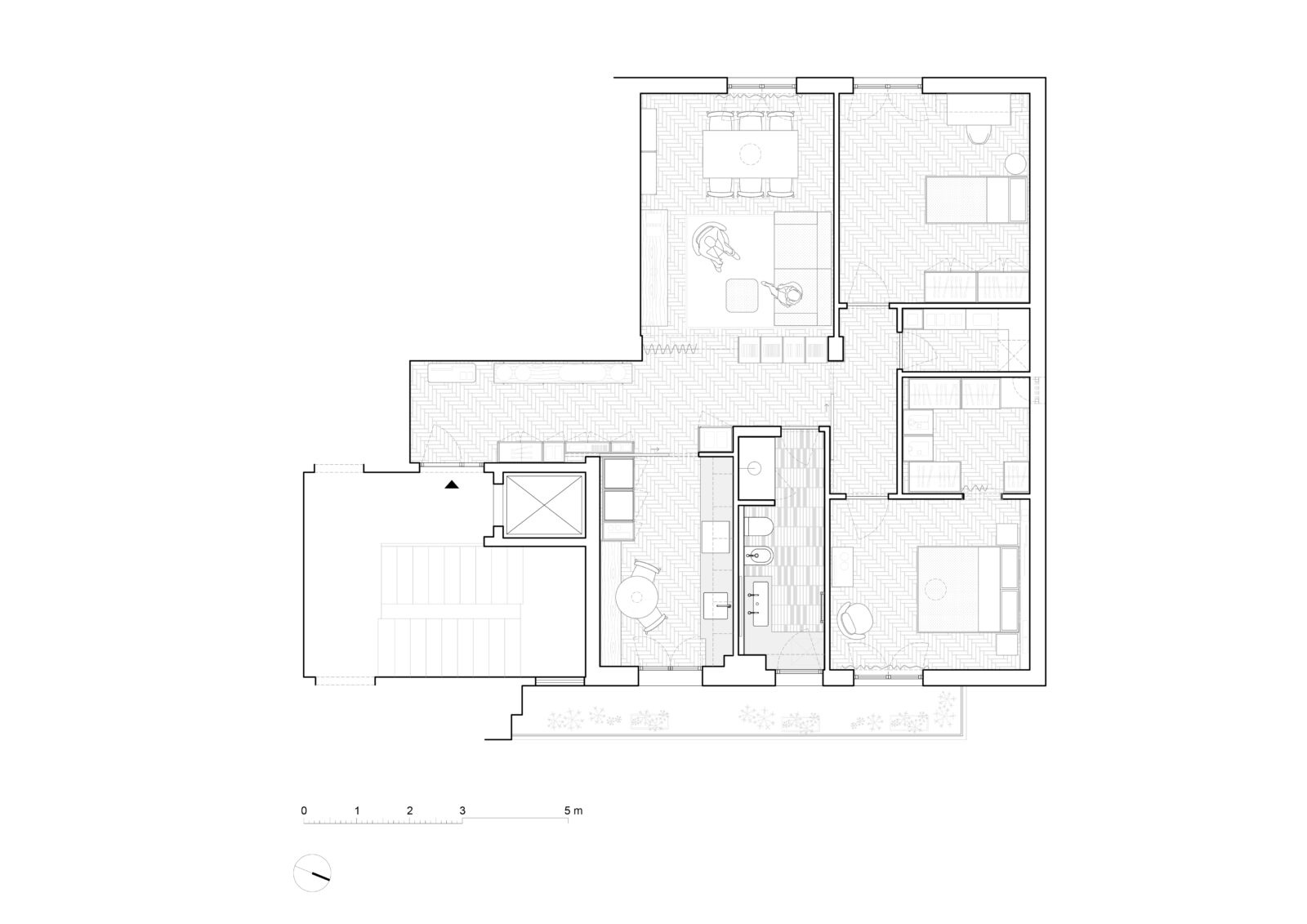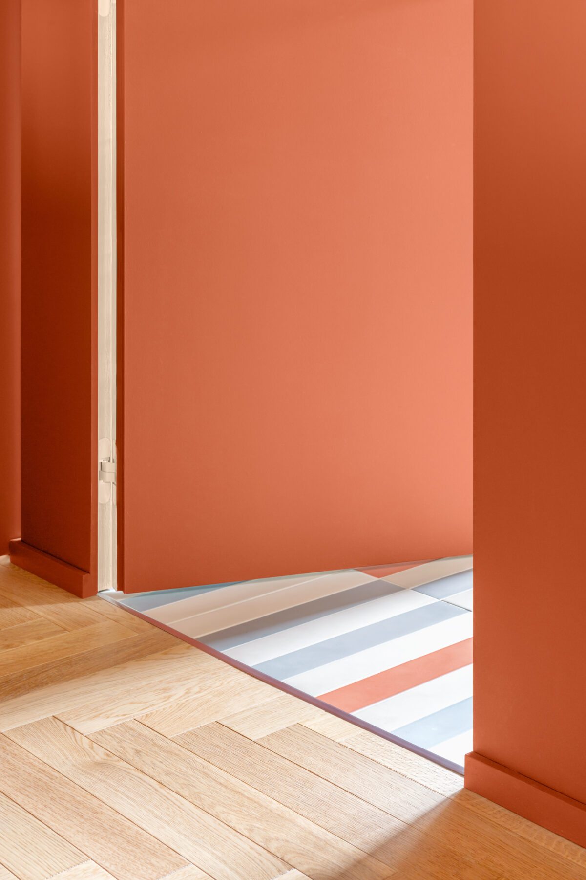 Throughout the house, an Italian herringbone parquet floor is installed, uniting the spaces and expanding their proportions. In the bathroom, the parquet is replaced by a floor with porcelain tiles in alternating colours, with a three- dimensional, sculptural effect. Ceramic wall tiles are also used as boiserie in the bathroom and shower compartment panelling, both in neutral tones.