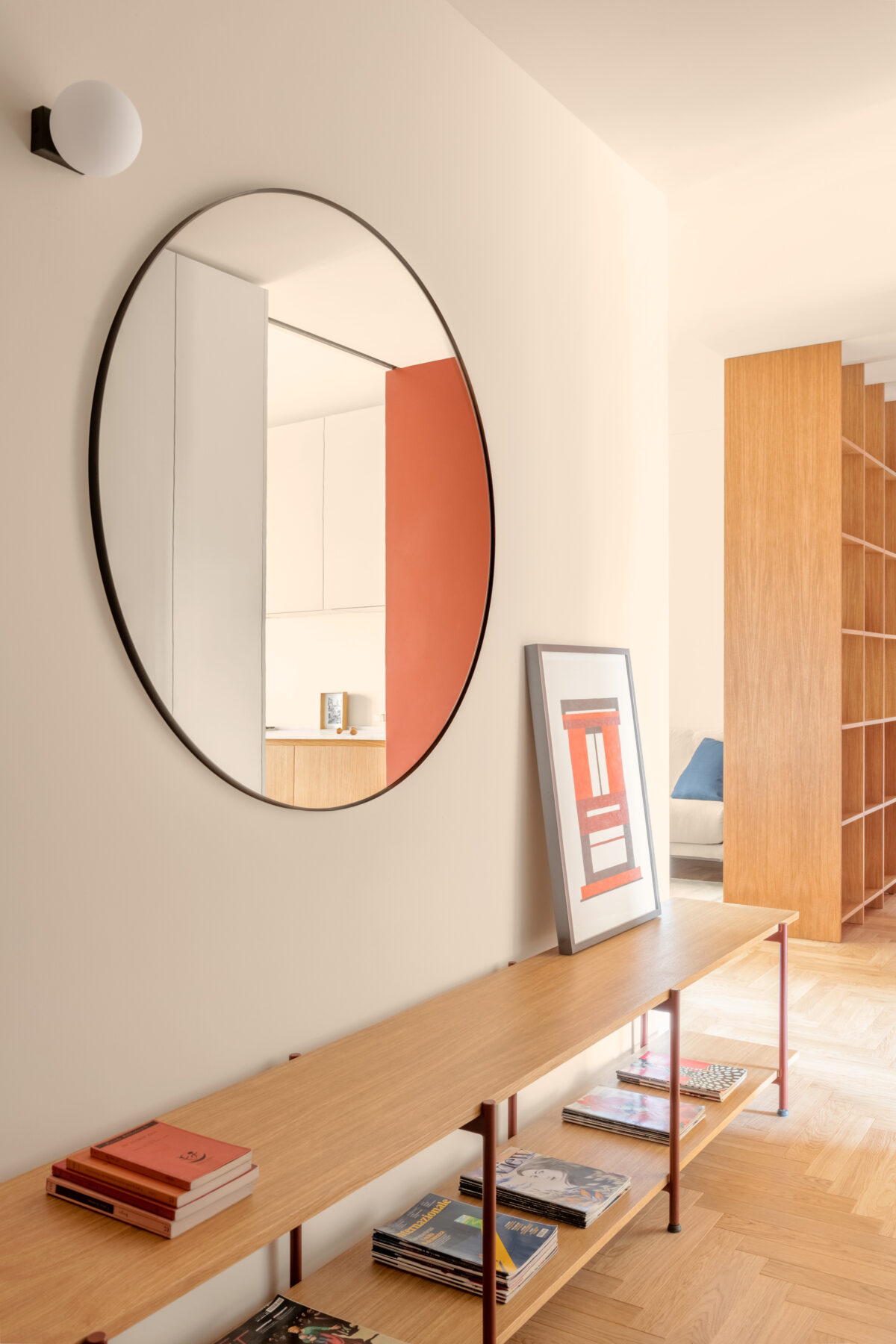 The customised furnishings not only characterise the various rooms, but also make the most of the available space by articulating into storage units, partitions, sliding panels with different colours and textures. The house is entered through a large entrance hall, where various volumes and furnishing devices are placed. Among these, a long cabinet with double oak shelves and an enamelled metal frame is used both as a bench and as a place to store objects and clothing. Above the bench is a large circular mirror, while a full-height lacquered oak wall unit occupies the opposite wall. It is a piece of furniture that runs along the corner between the entrance and the kitchen, placed at the transition between the two spaces. This wall unit has a dual function, at the entrance, that of wardrobe and storage for most of the utensils associated with the young couple’s passions, and in the kitchen, that of incorporating the tall units and pantry. The cabinet also contains a sliding glass door, which closes off the kitchen but still allows light to pass through..