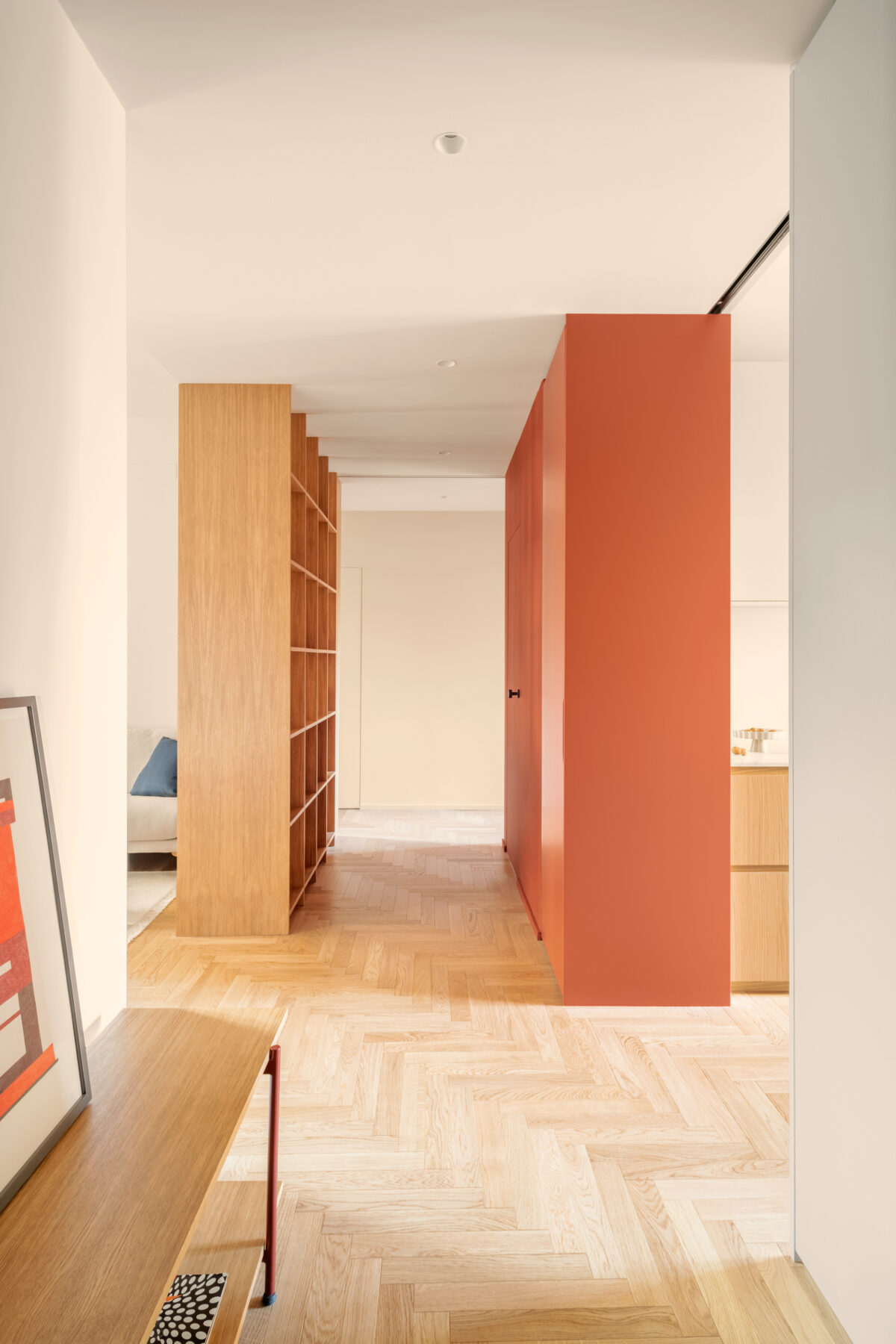 On the threshold of the living room is an oak cabinet with a through-structure, used as a bookcase and object container. The cabinet works like a filter in the space, dividing the rooms but allowing light to leak through. The living room is divided into two distinct areas: one dedicated to conversation, with a sofa, the other occupied by a large table with an oak top for dinners with friends. On the wall is a low walnut console table and a metal shelving unit. “We have designed every element that makes up the interior of the house, from the design of all the spaces, to the choice of all the materials and finishes, through the selection of all the furnishings, to the design of the custom-made furniture with the sole objective of making the flat bright, welcoming and functional” Javier Deferrari