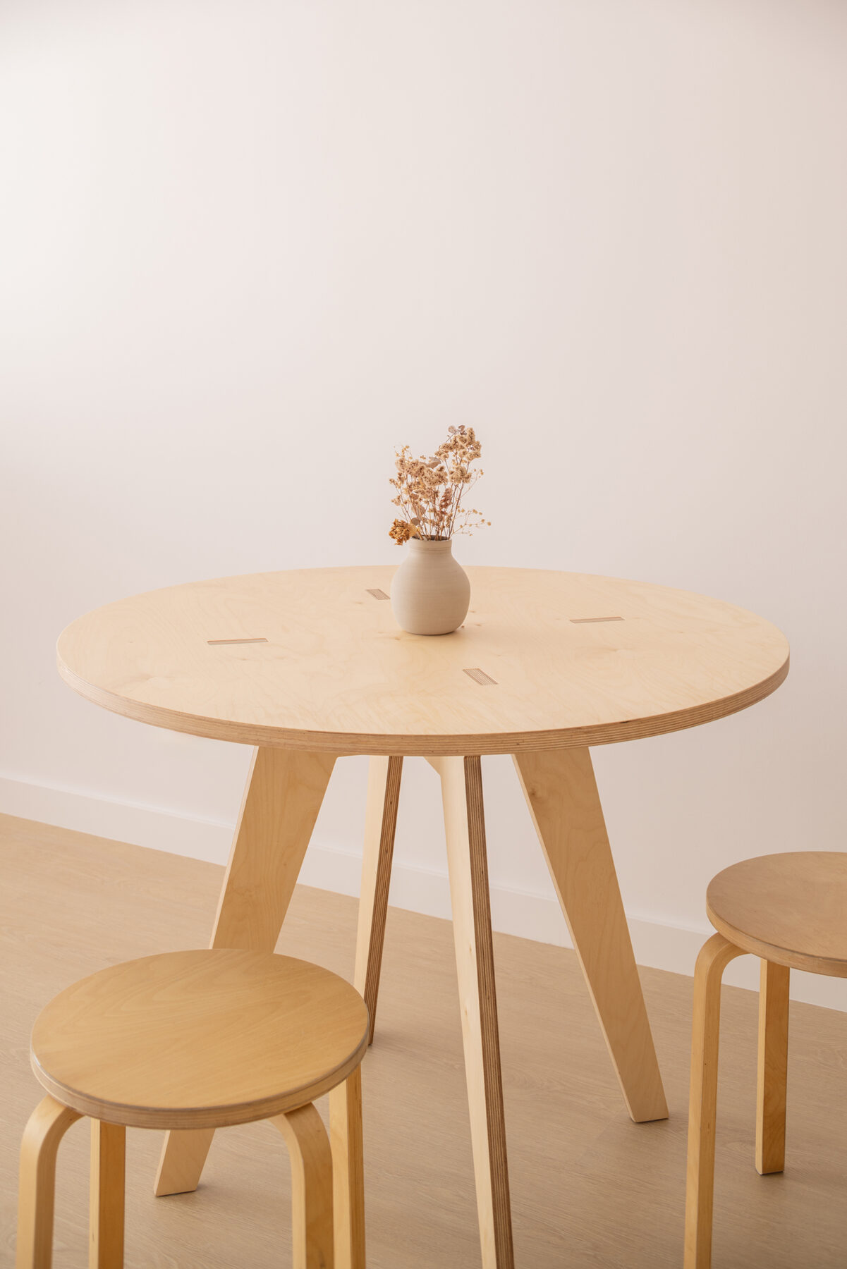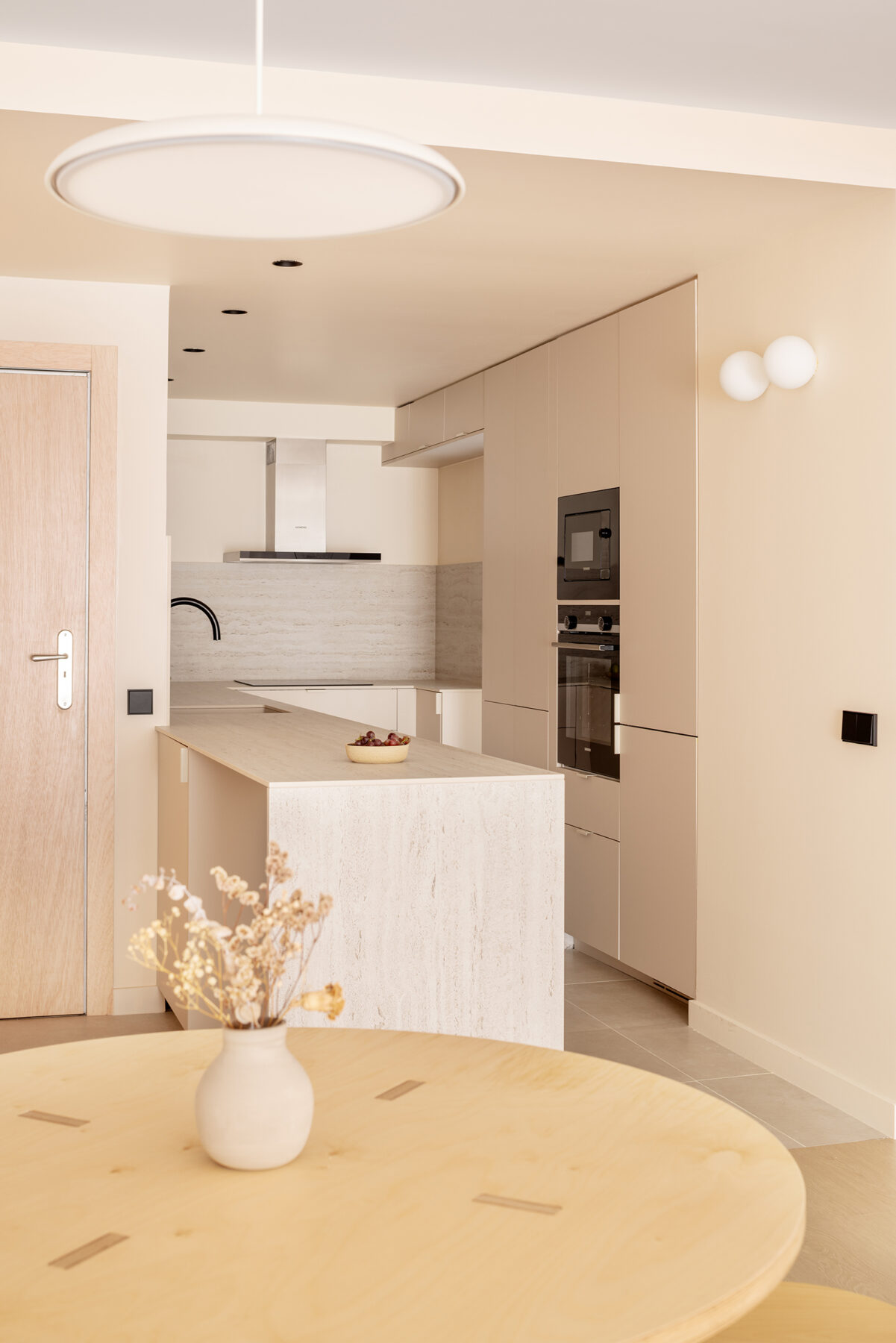 We opted for beige and ocher hues in different textures: solid color on walls, ceilings and furniture, stone on the countertop, and plywood for the doors.