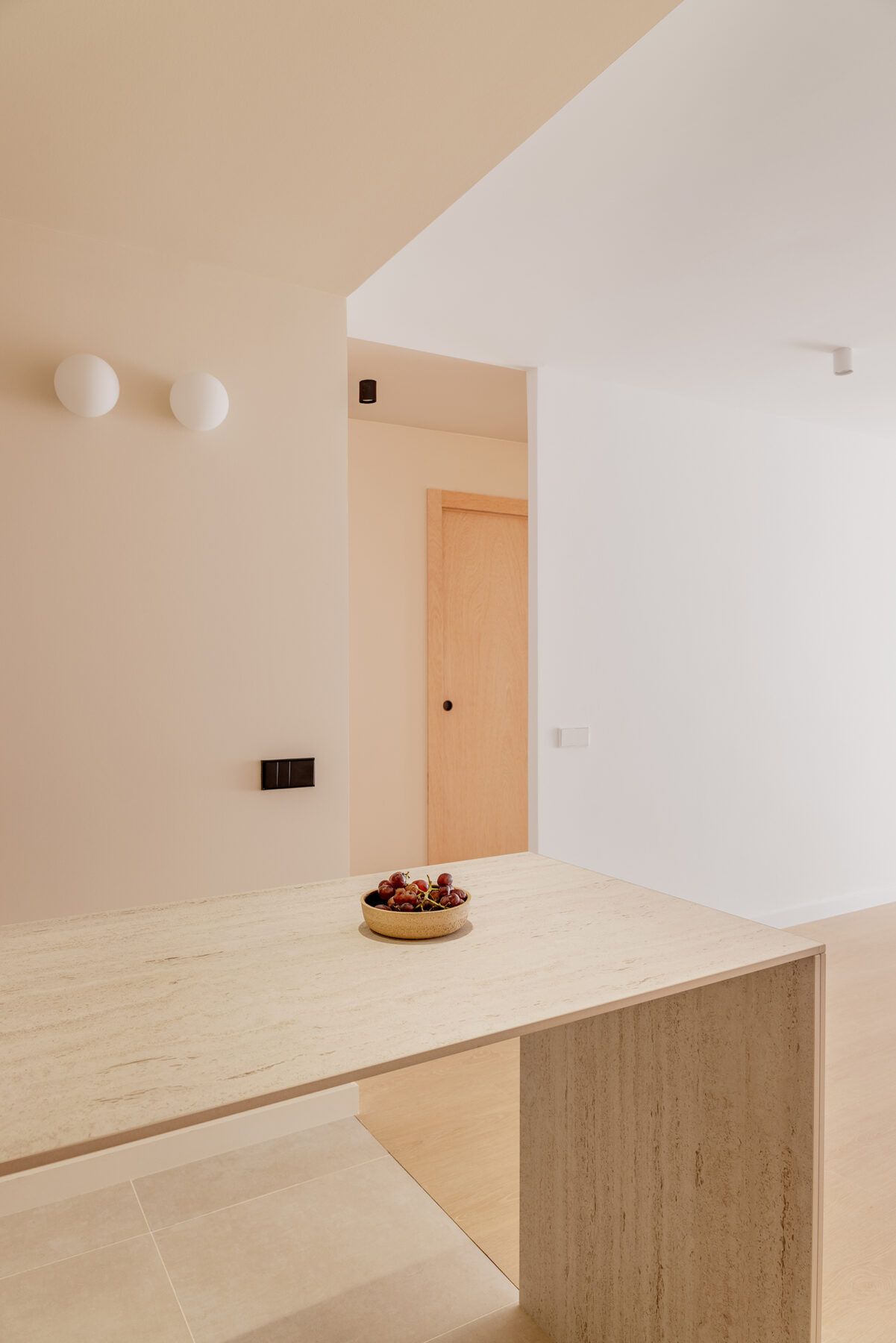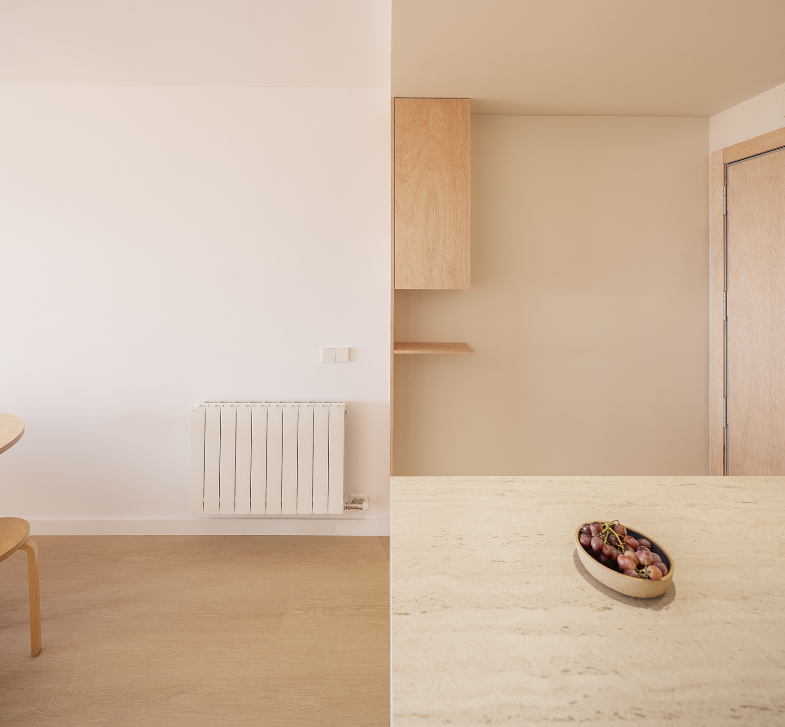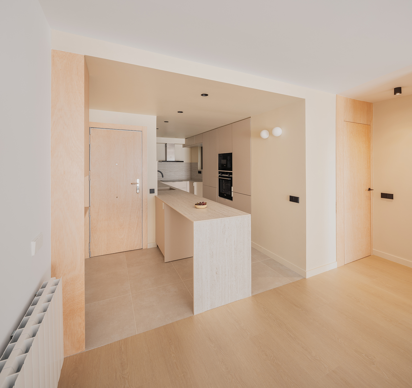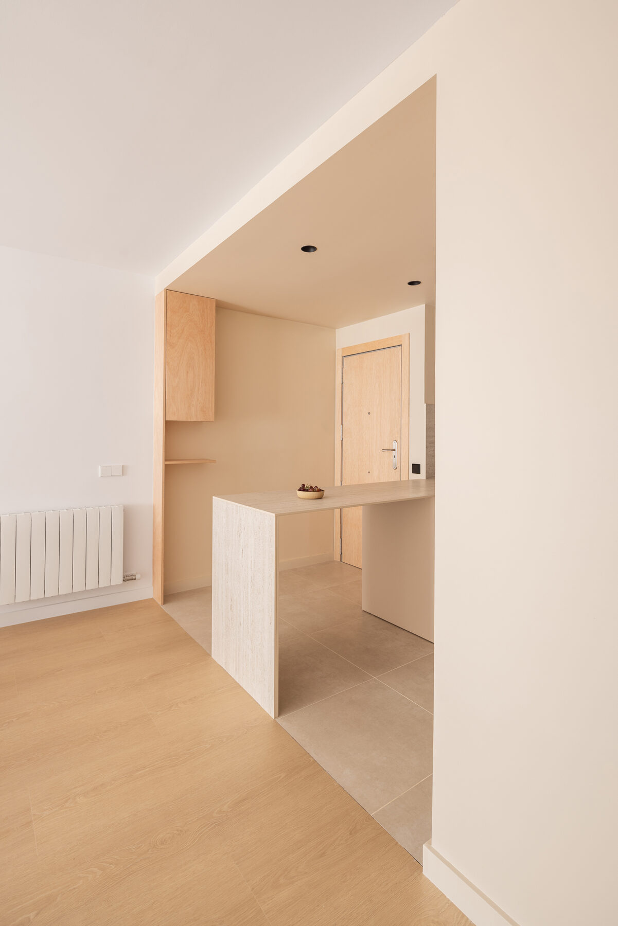 This area is extended until it is aligned with the corridor, whose doorway is widened to improve the connection and fluidity with the living space. Both rooms, understood as passage or transition spaces, are formally linked with the use of materials and color, singling out these areas, distinguishing them from the more static rooms, such as the living room or bedrooms.