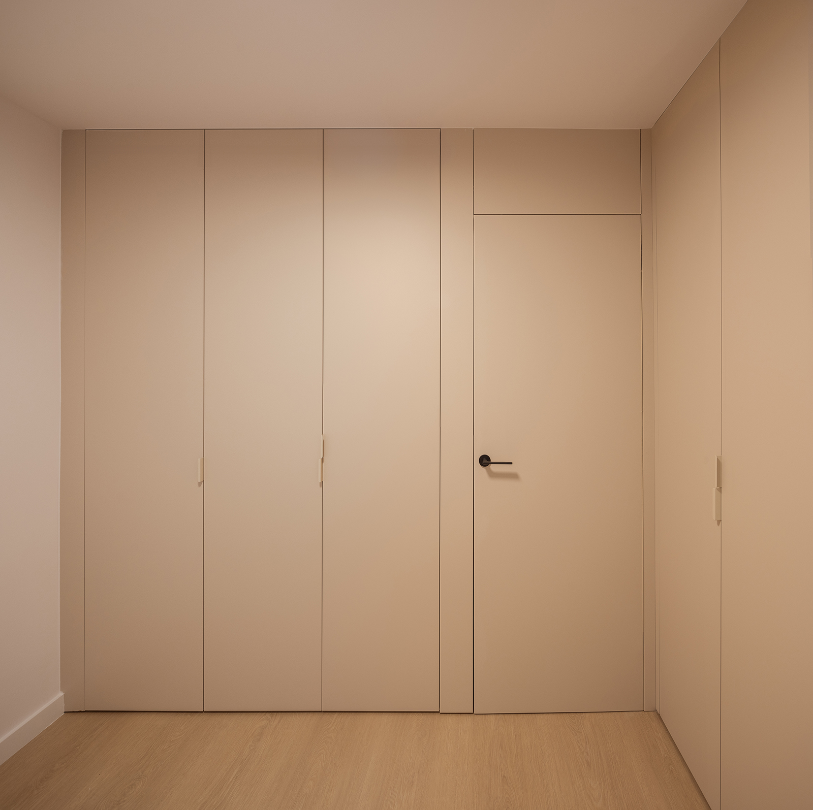 The furniture and doors are treated as large panels, within this palette of materials, understanding them as part of the walls. In this way, the doors are built flush with the covers and these reach the limits of the walls and the ceiling, giving the appearance of a smooth cladding. Also the closets in the bedroom fill the entire wall up to the ceiling, and are aligned with the entrance door, giving the appearance of a large continuous front.