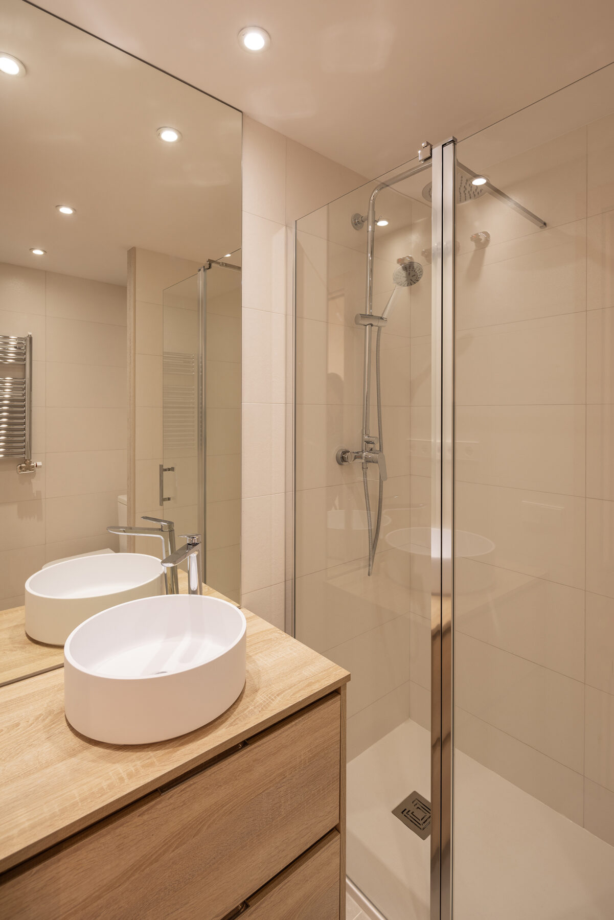 The bathroom is renewed using the same materials in the finishings, improving its distribution and exchanging the tub for a larger shower.