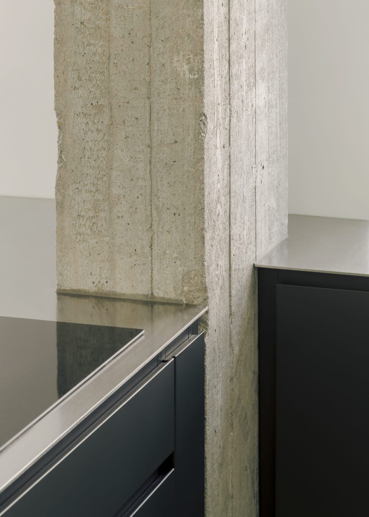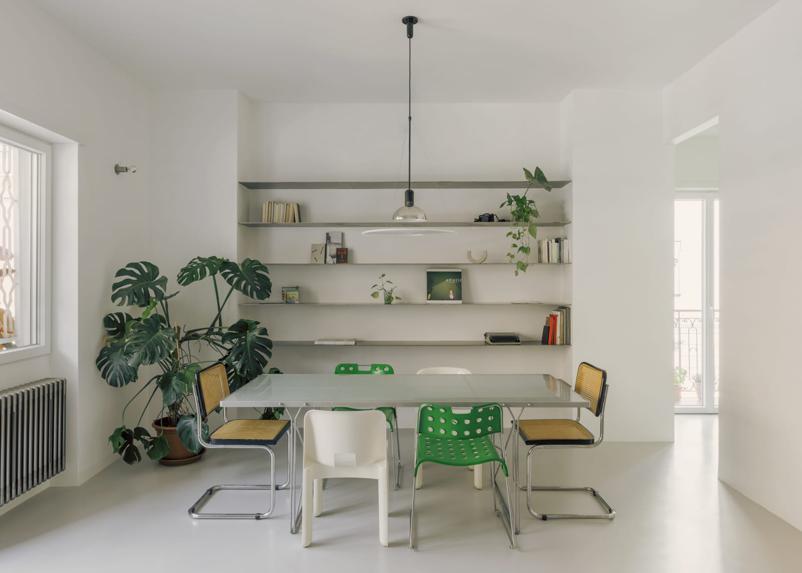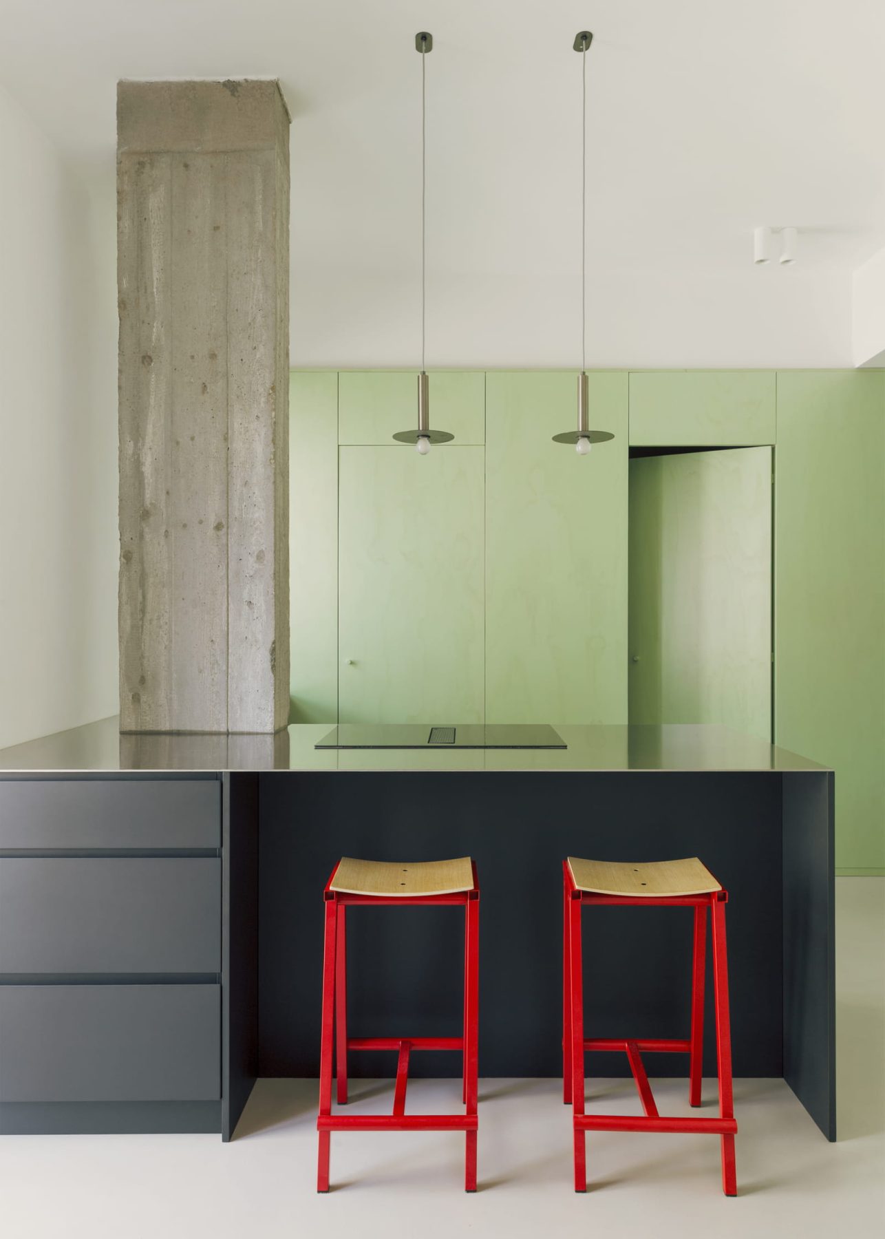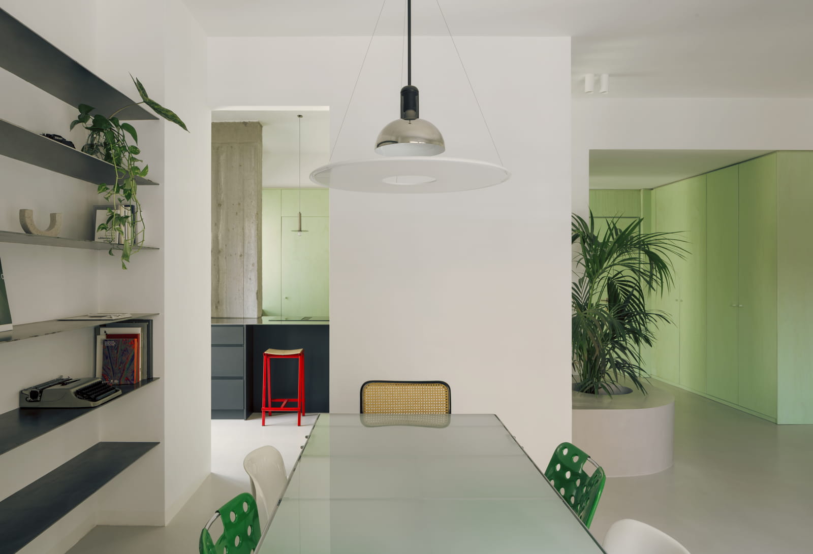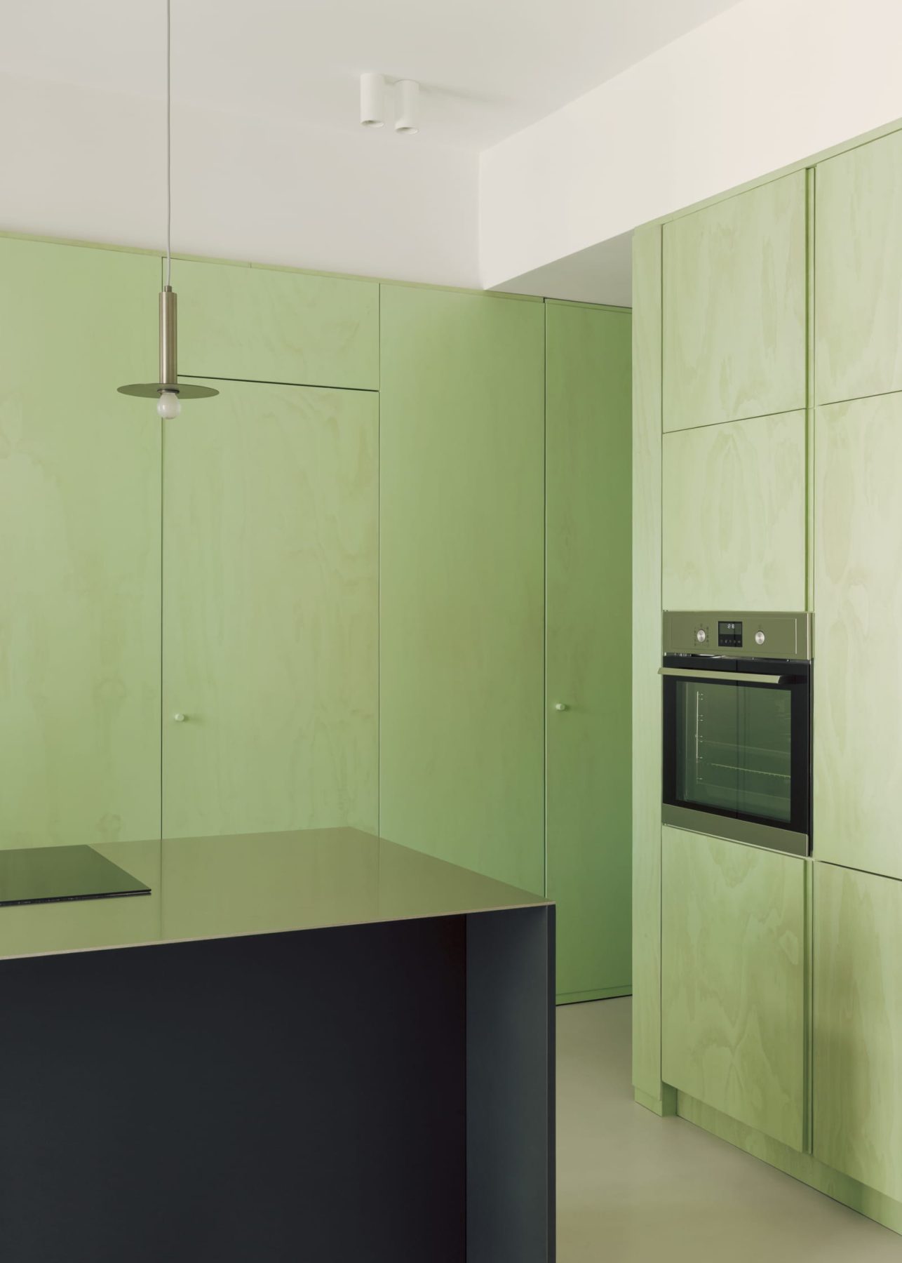 From the entrance to the kitchen, a system of stained pale green wood panelling integrates storage functions and discreetly conceals service areas, establishing a linear rhythm that enhances the domestic landscape while maintaining order and formal clarity.