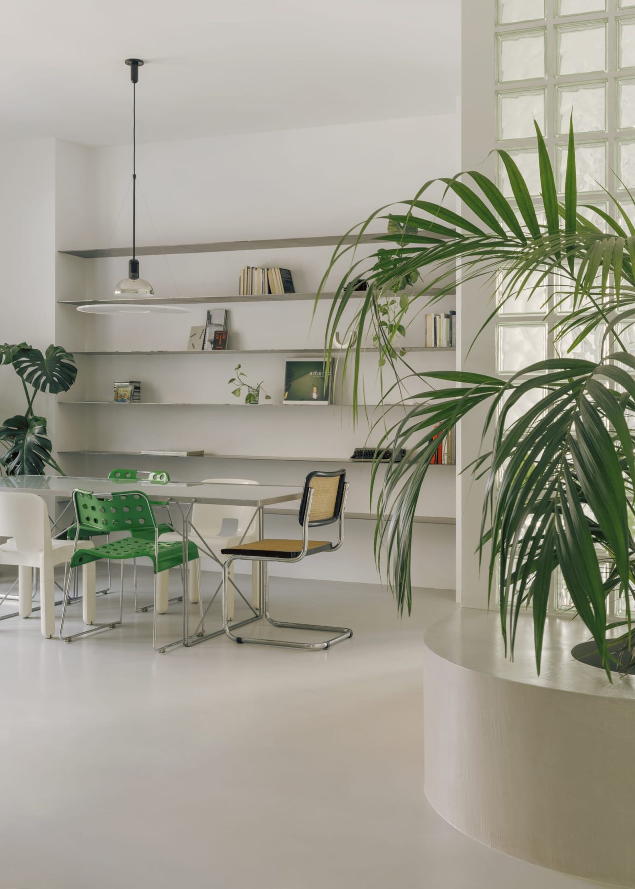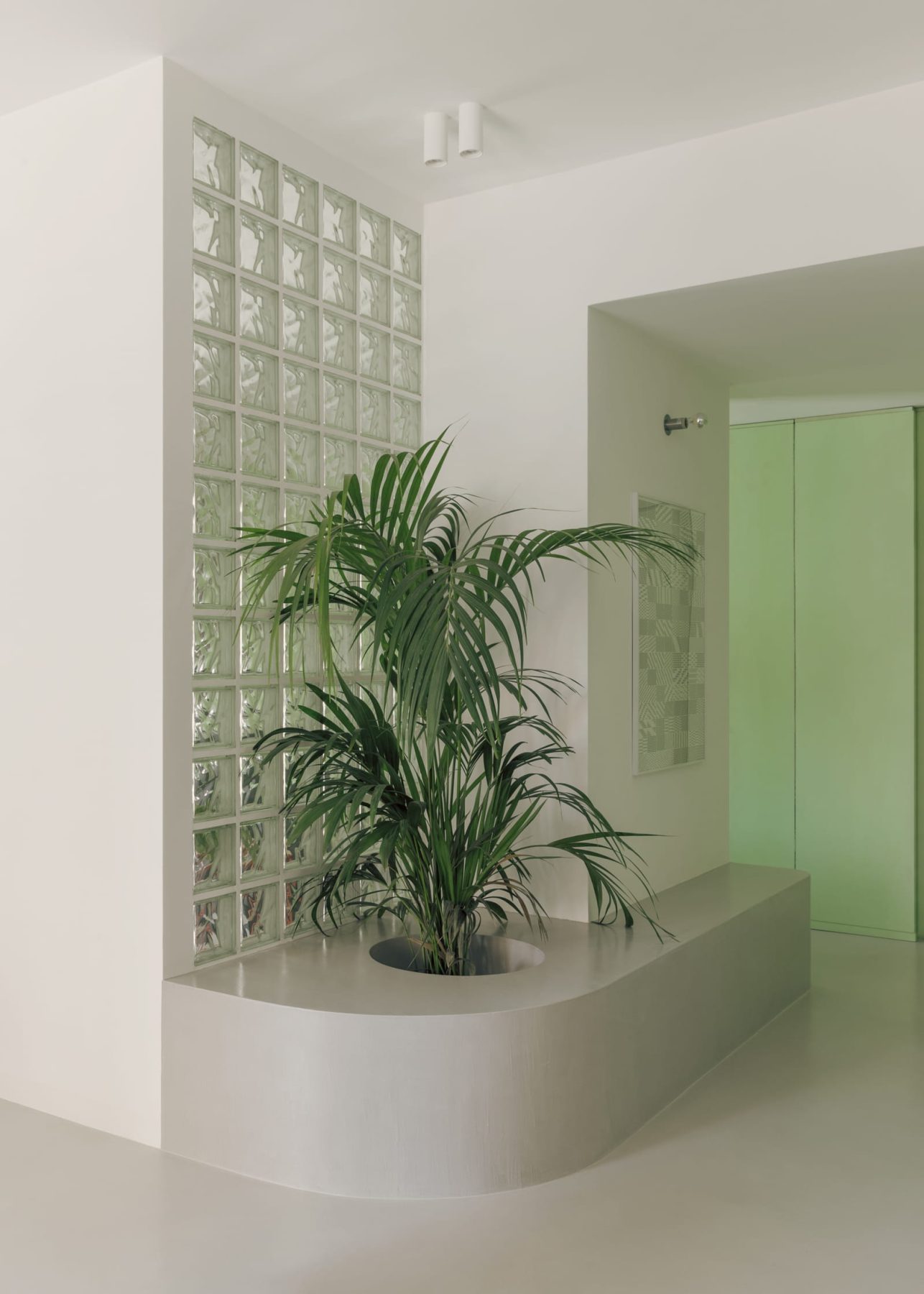 In Rome’s Montesacro district, Casa Tirreno by PAROS architettura unfolds as a fluid domestic landscape where space and colour interact in quiet continuity. Softened boundaries between living spaces, a glass-brick wall, a sculptural masonry bench, resin flooring, and neon green wood panelling compose a minimal yet dynamic domestic landscape.