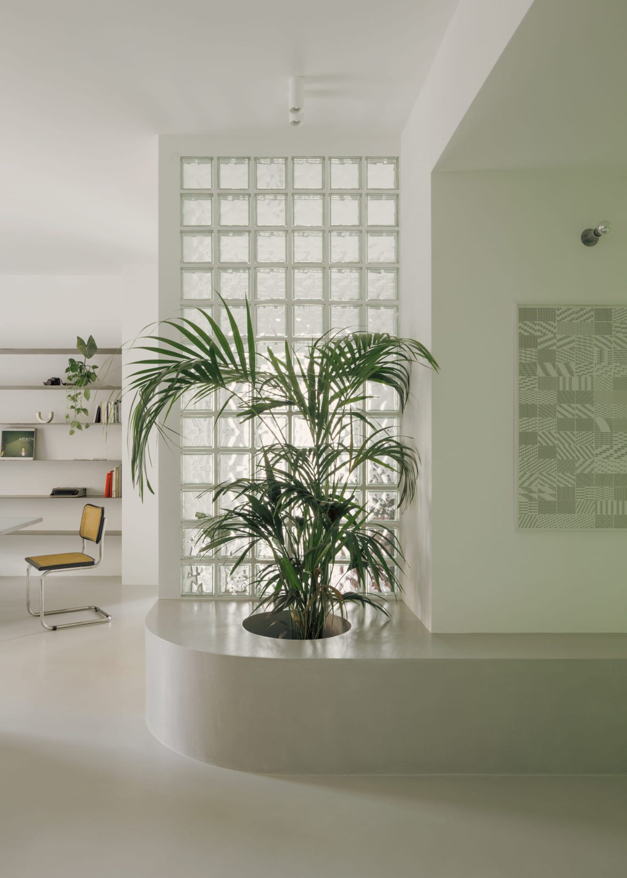 At the heart of the living space, a glass-brick wall operates as a permeable diaphragm, filtering and diffusing natural light while subtly articulating the interior.