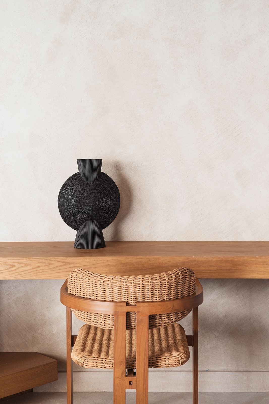 Its warm tone and visible grain add softness and warmth, balancing the roughness of the mineral finishes. In the bathrooms, monolithic stone basins were custom-fabricated to further emphasize material authenticity and craftsmanship.