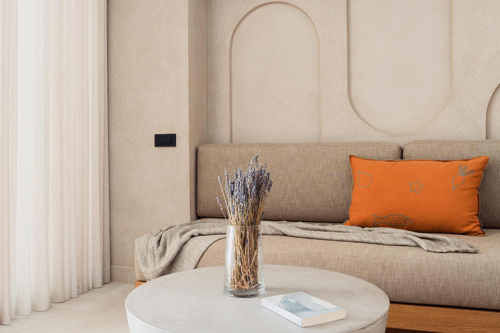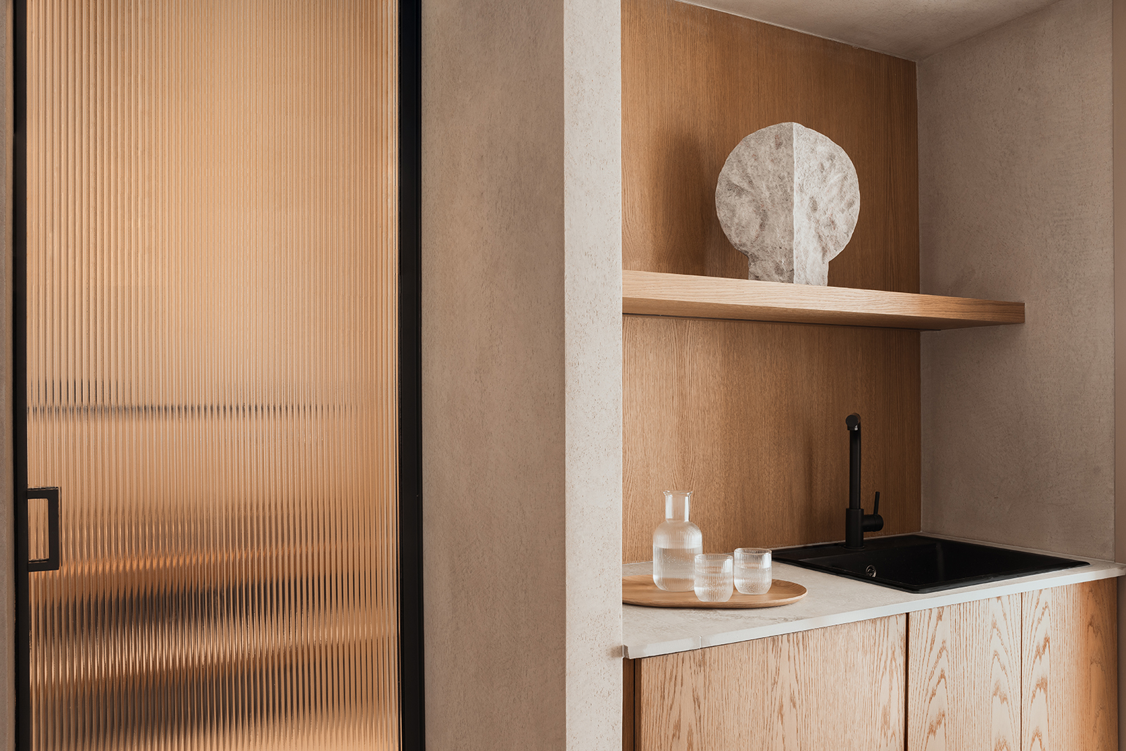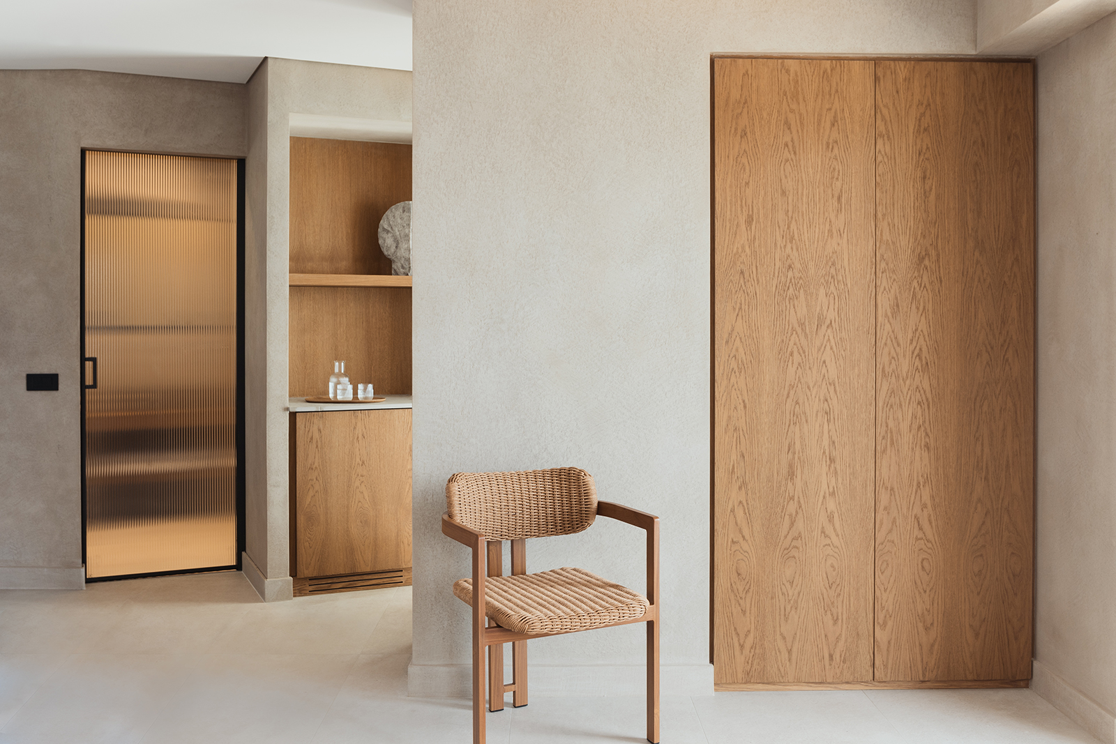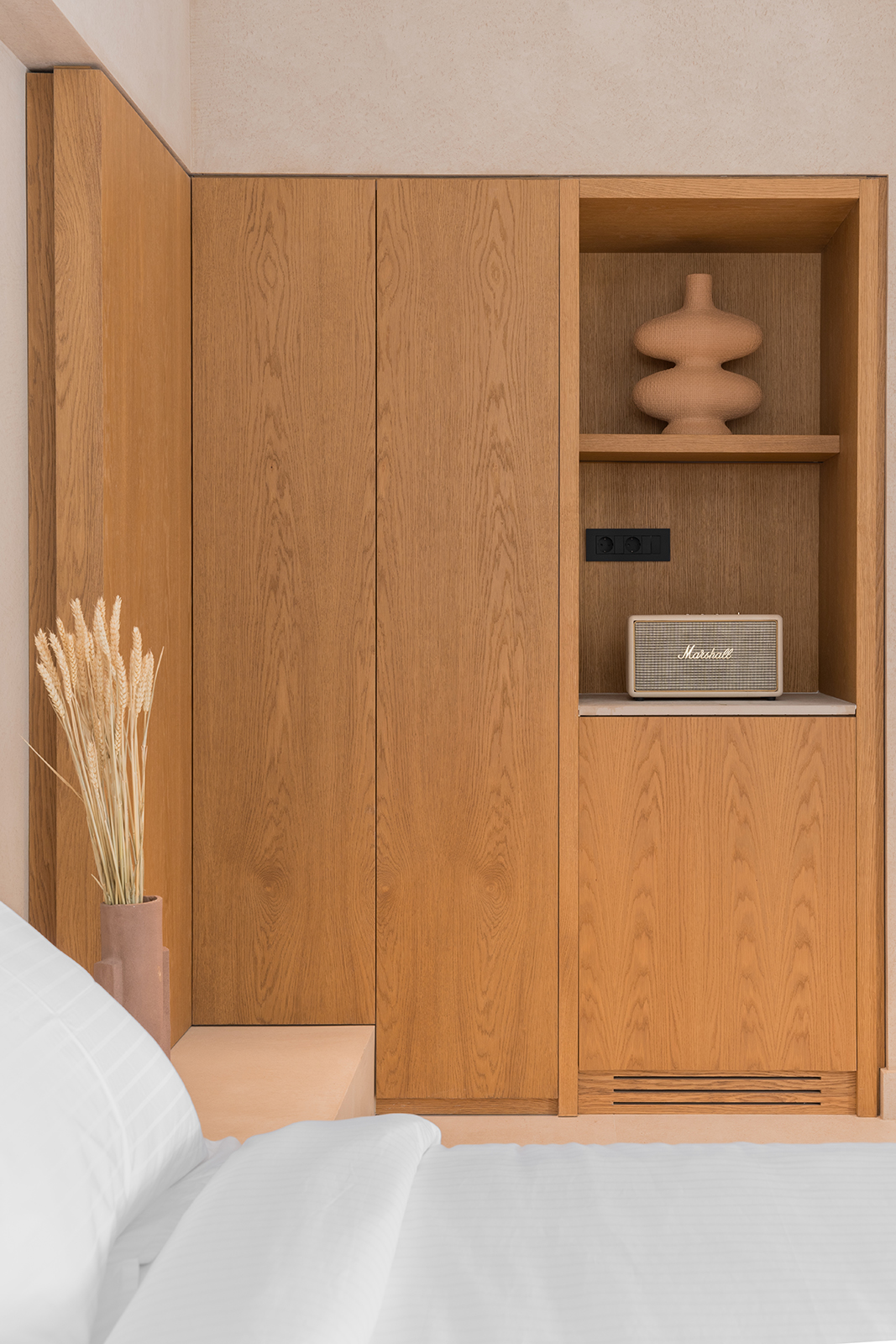 All wall surfaces were finished with Kourasanit, a natural mortar composed of volcanic ash, lime, and stone aggregates, selected for its durability, tactile quality, and subtle earth-toned appearance that echoes the local geology. Brushed natural oak was used for all wooden elements, including flooring, built-in furniture, and interior cladding.