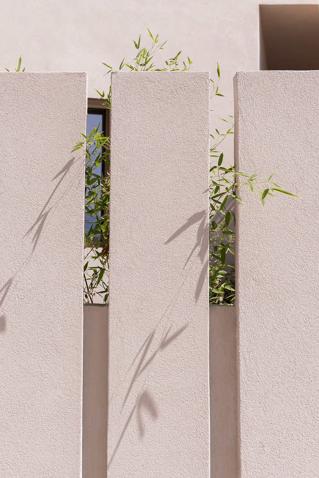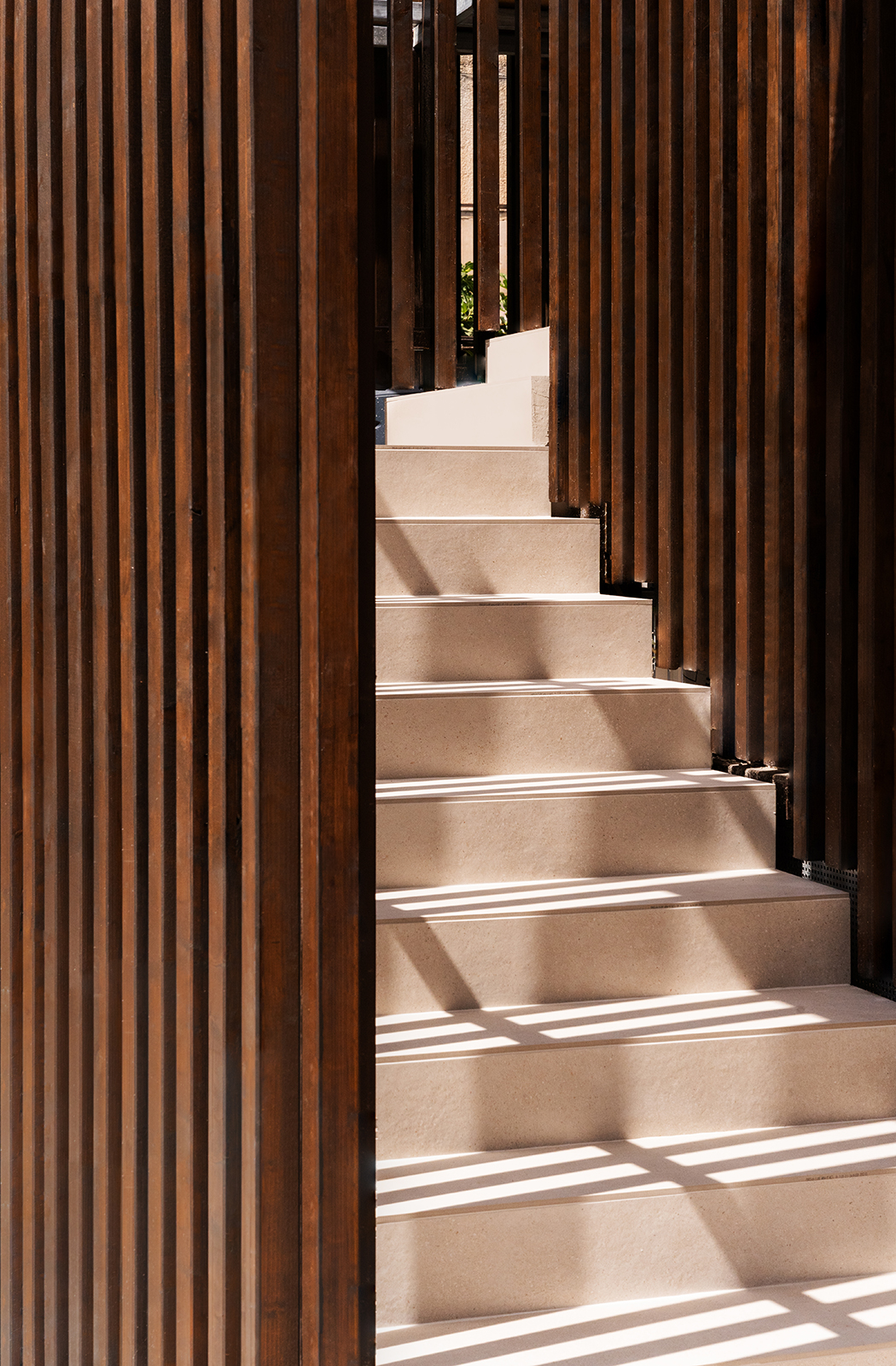 In terms of the exteriors the primary architectural addition consists of pergolas installed on the terraces on the ground floor. A secondary vertical wooden screen system was added in front of sections of the original façade. Composed of evenly spaced vertical wooden slats (lamellas), this layer acts as a permeable skin that modulates sunlight, reduces visual bulk, and introduces a tactile, natural element to the external appearance.