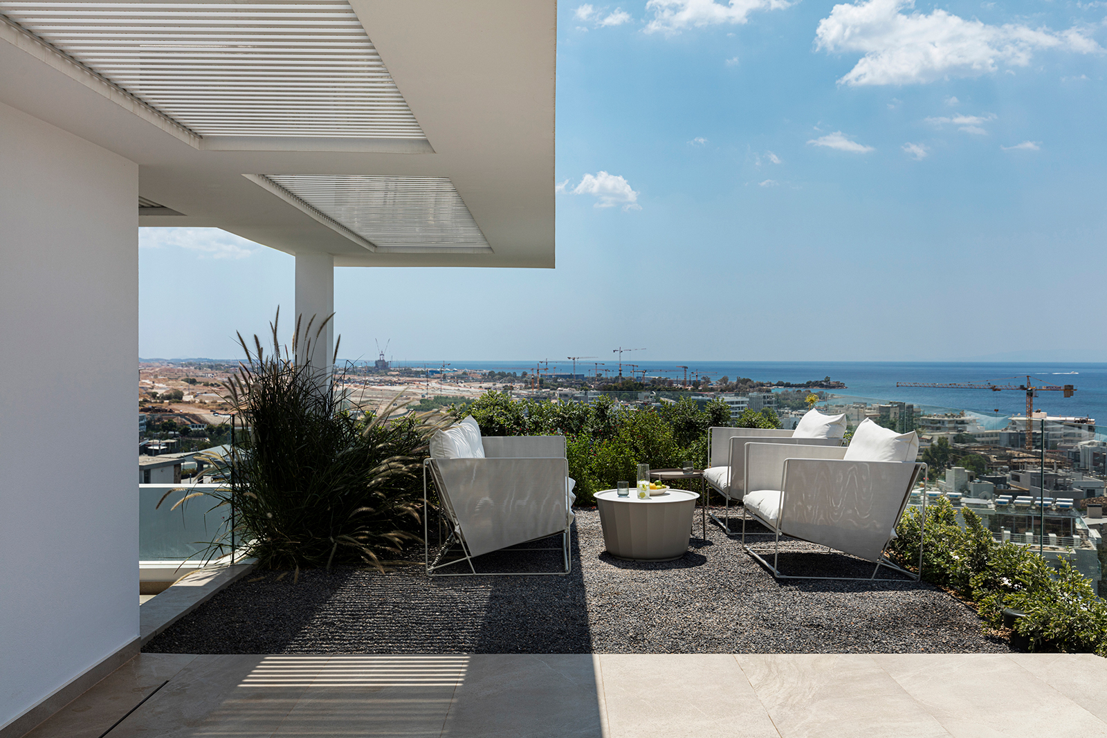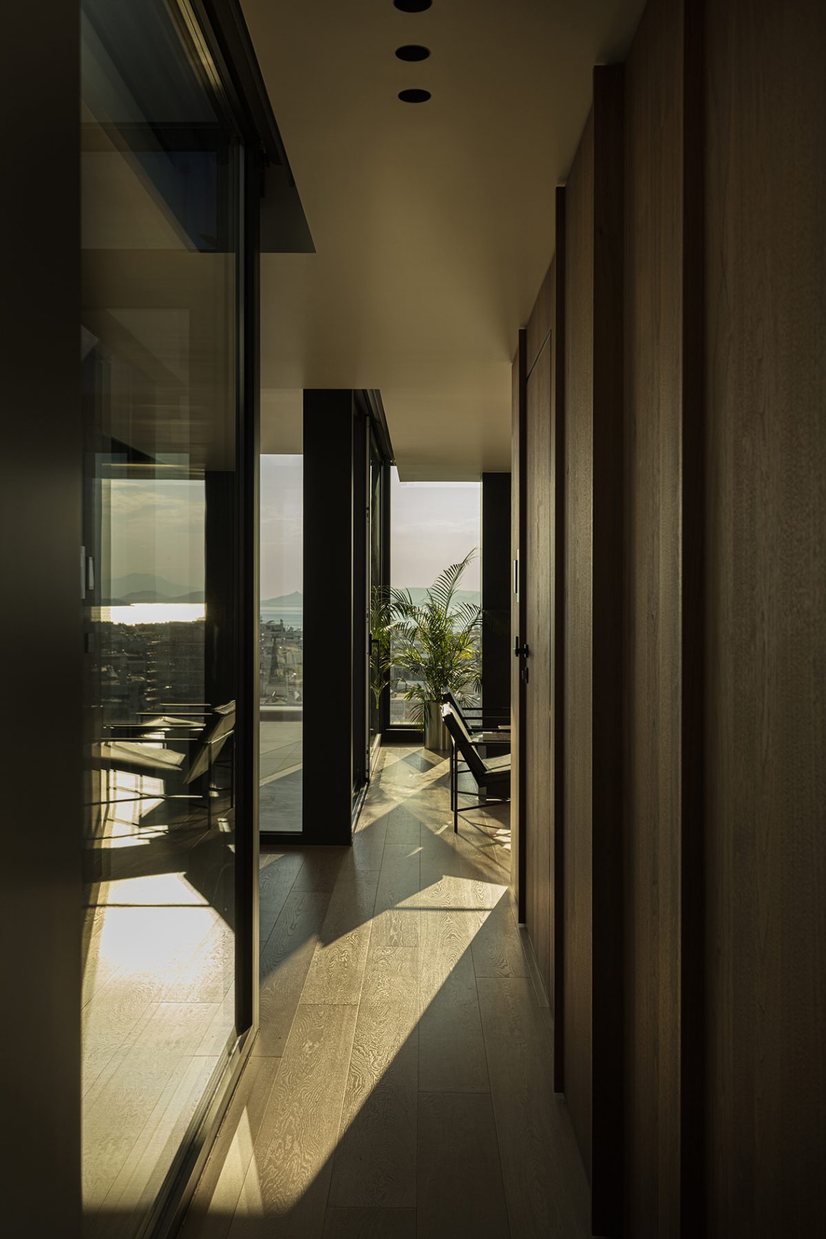 Set above the new urban landscape of Alimos, in a privileged location with unobstructed views toward the Saronic Gulf and the evolving Elliniko waterfront with its towering cranes, the apartment D8 was designed by Andreas Androulakakis – Tatiana Tzanavara (kometka architects) and Athanasios Kyratzis (Axiacon), to balance the strict geometry of the interior with the fluidity of the surrounding environment.