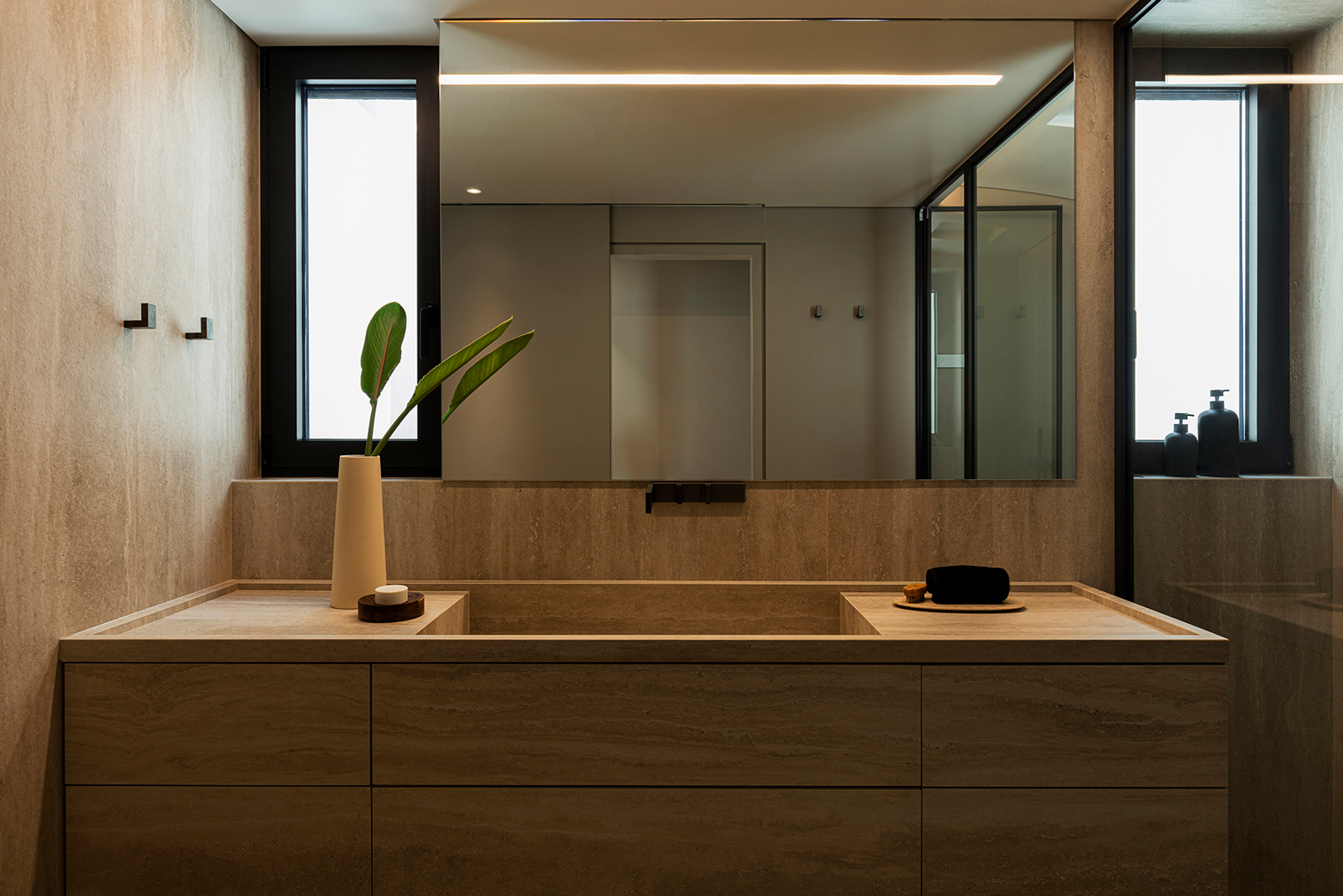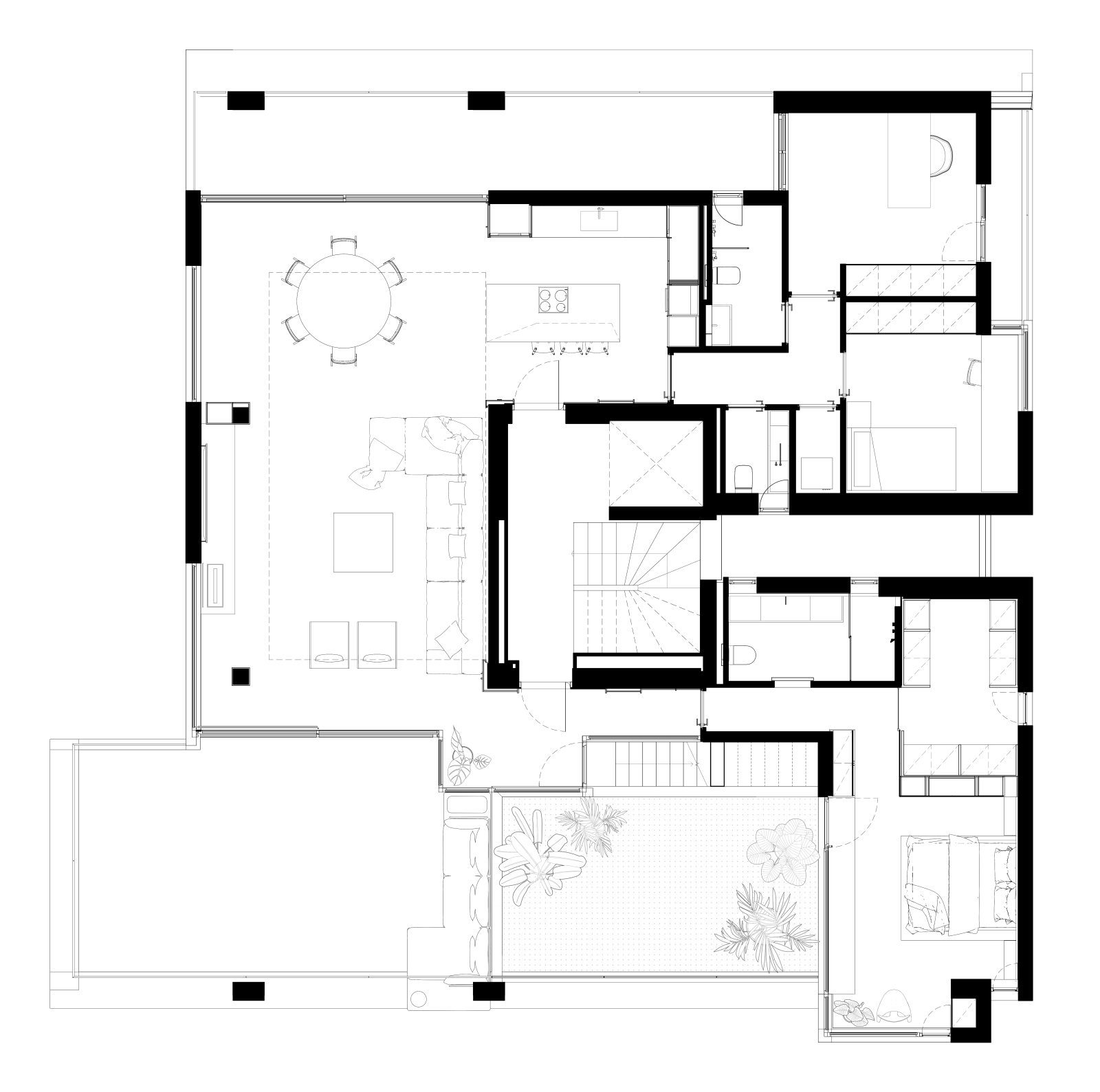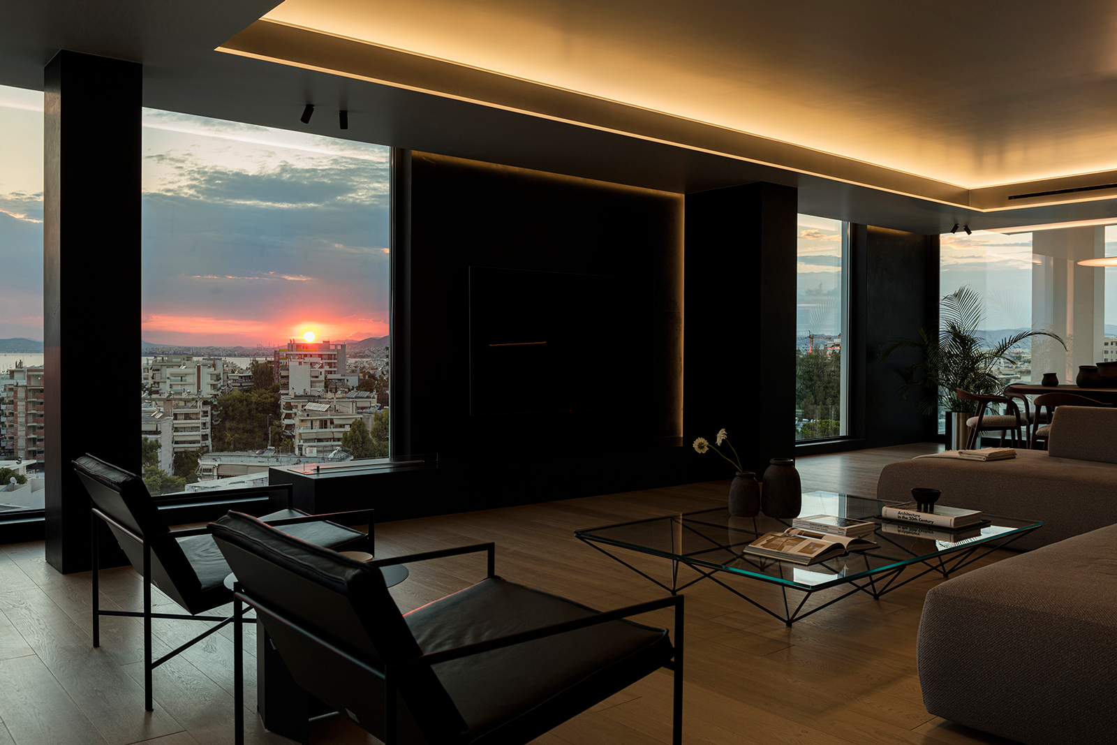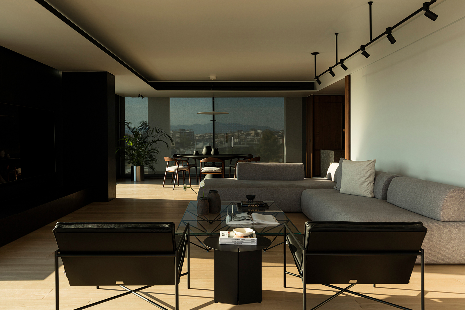 The open-plan living and dining area was organized to emphasize the U-shaped view, highlighted through the contrast of white and black surfaces. Freestanding columns were subtly integrated into the composition, either as part of the furniture or clad in darker materials, to visually soften their presence, especially in the evening hours.