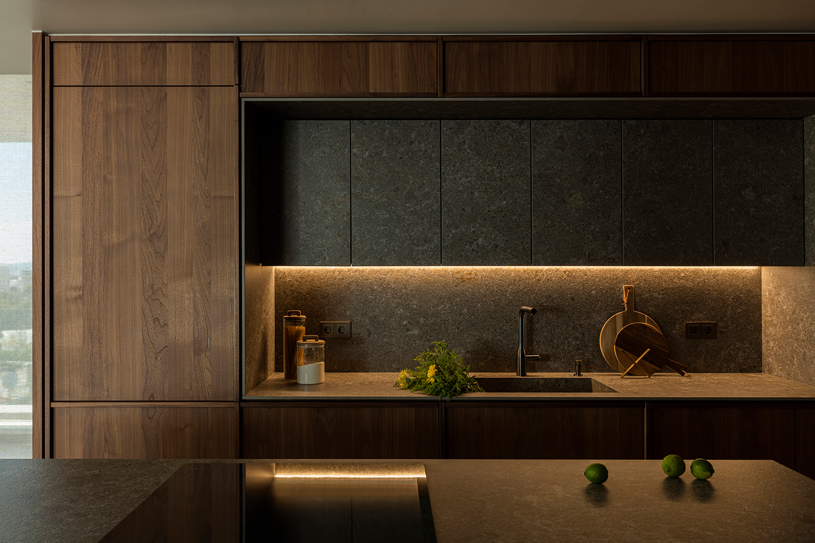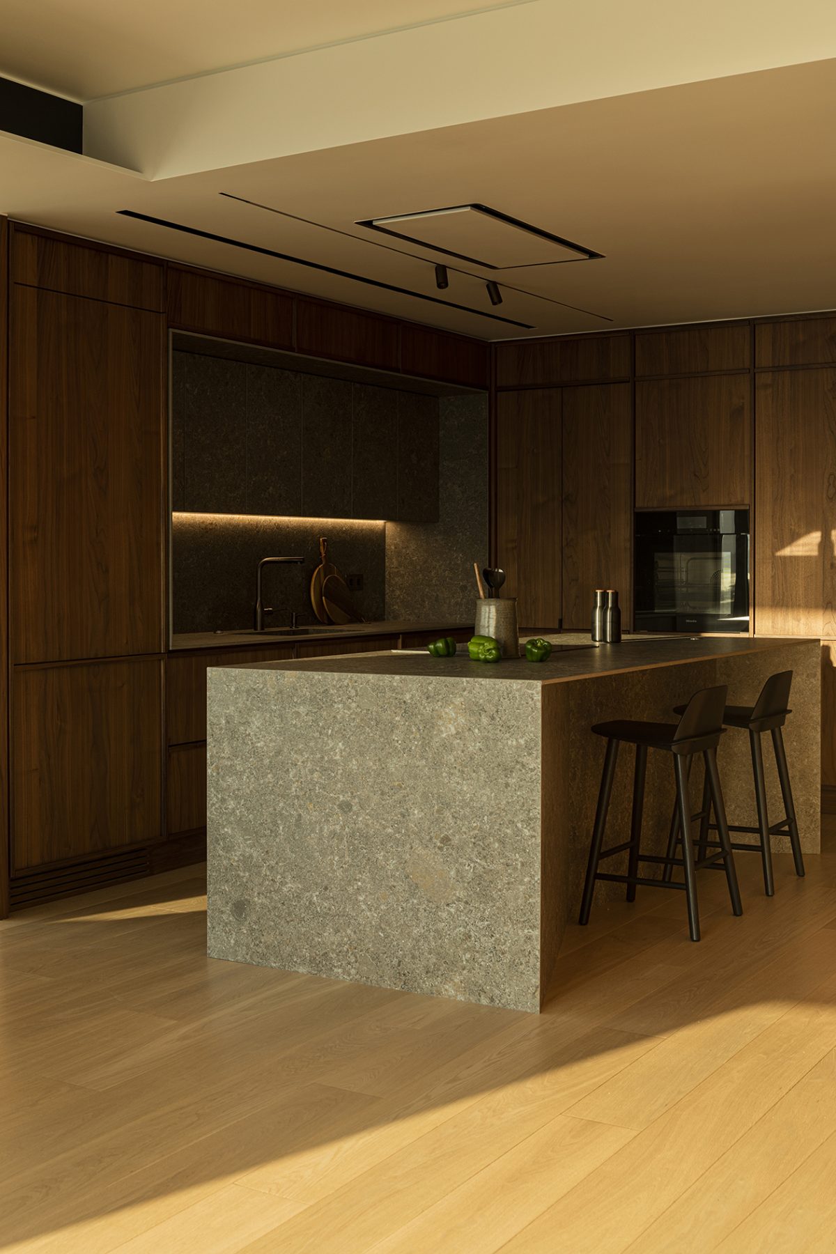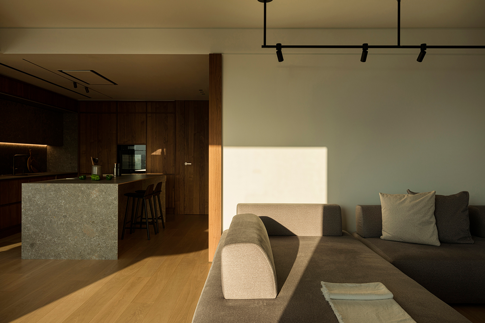 The kitchen, although directly connected to the dining area, was treated as a separate entity. Earthy materials dominate here, with walnut wood and ceramic surfaces defining a sense of warm separation while maintaining the strict geometries of the overall project. All kitchen surfaces are clad in walnut, reinforcing the impression of a cohesive, self-contained spatial unit. Every detail -handles, linear inserts, ceramic finishes- was carefully designed to emphasize craftsmanship while remaining consistent with the apartment’s minimalist character. The island stands as a sculptural element: its angled supports are the only feature that breaks from the otherwise orthogonal geometry.