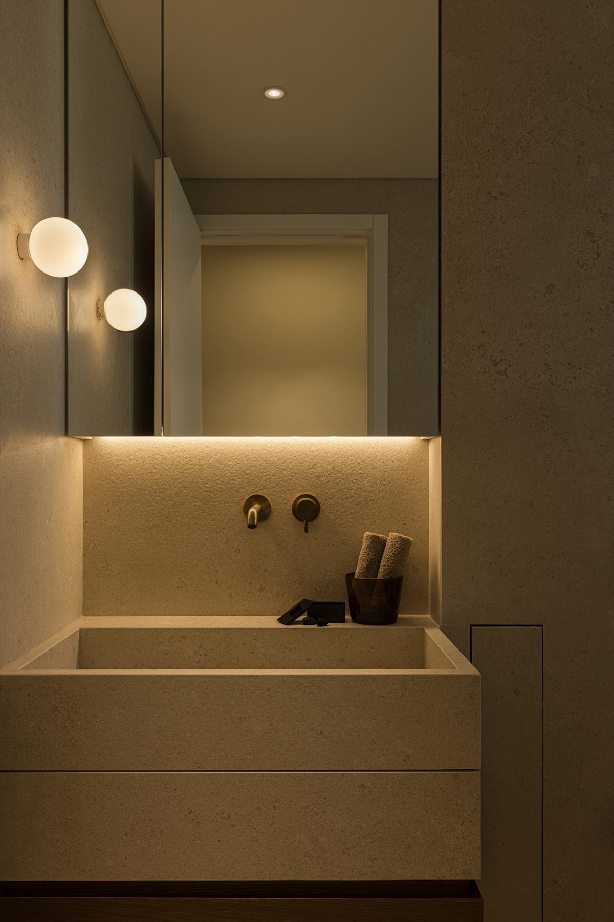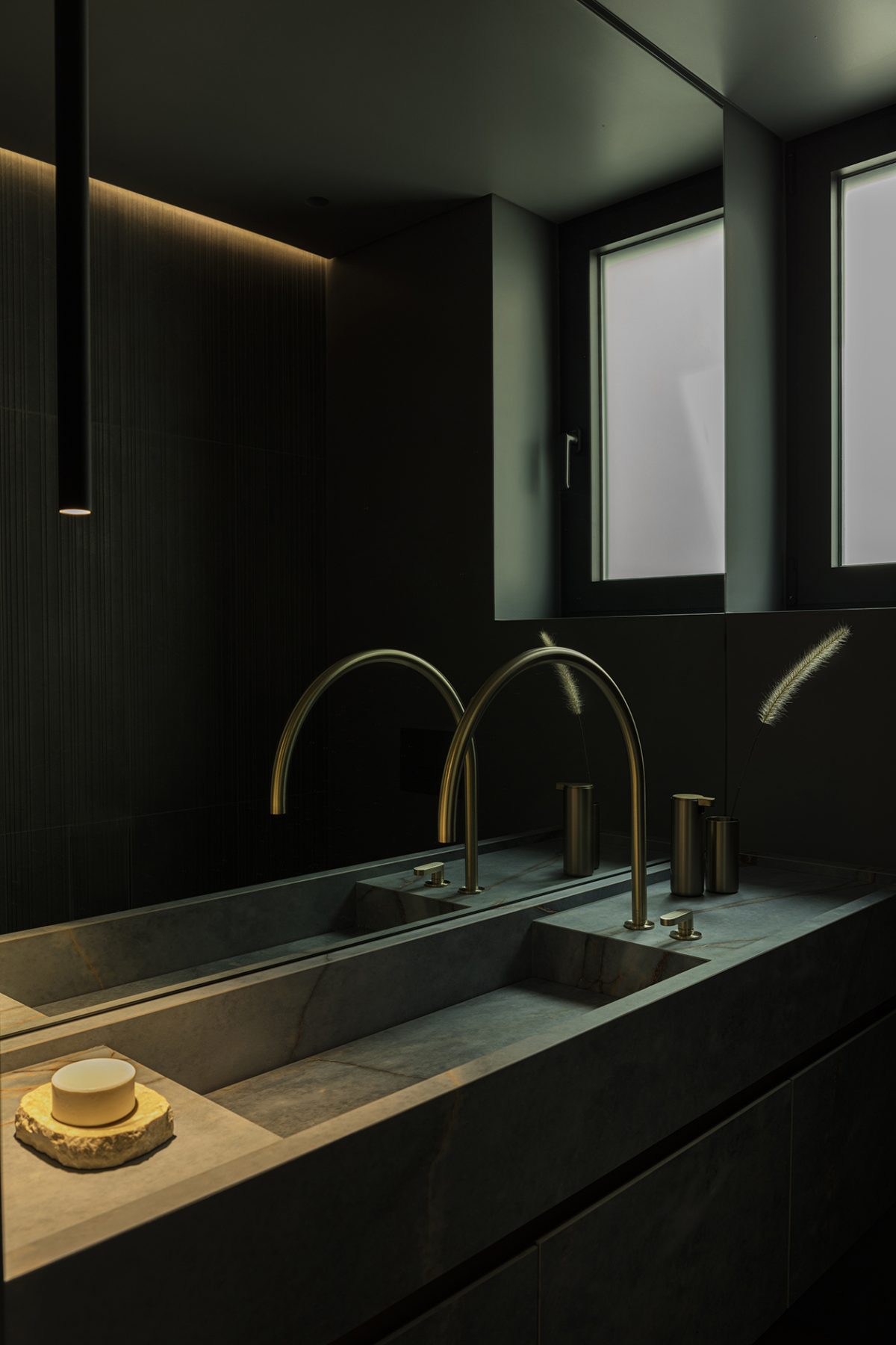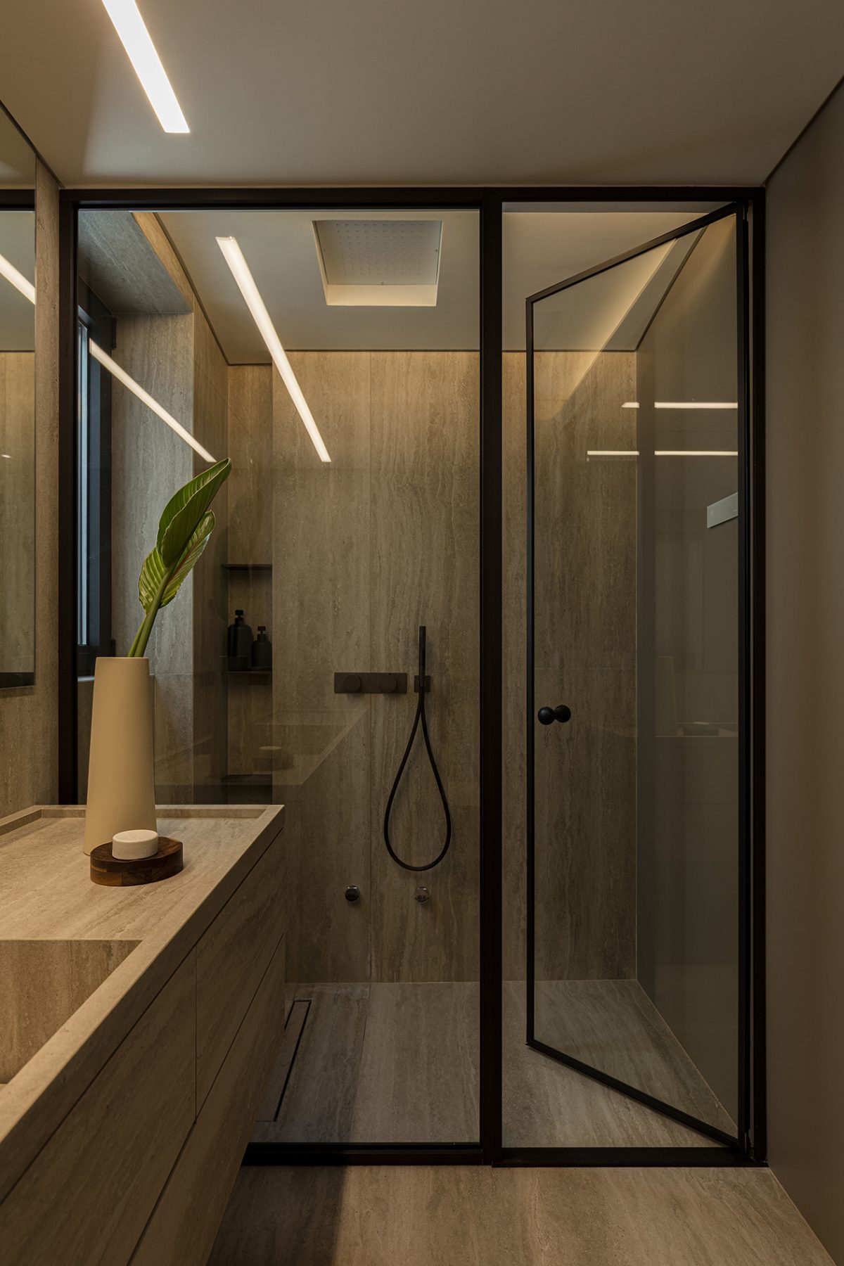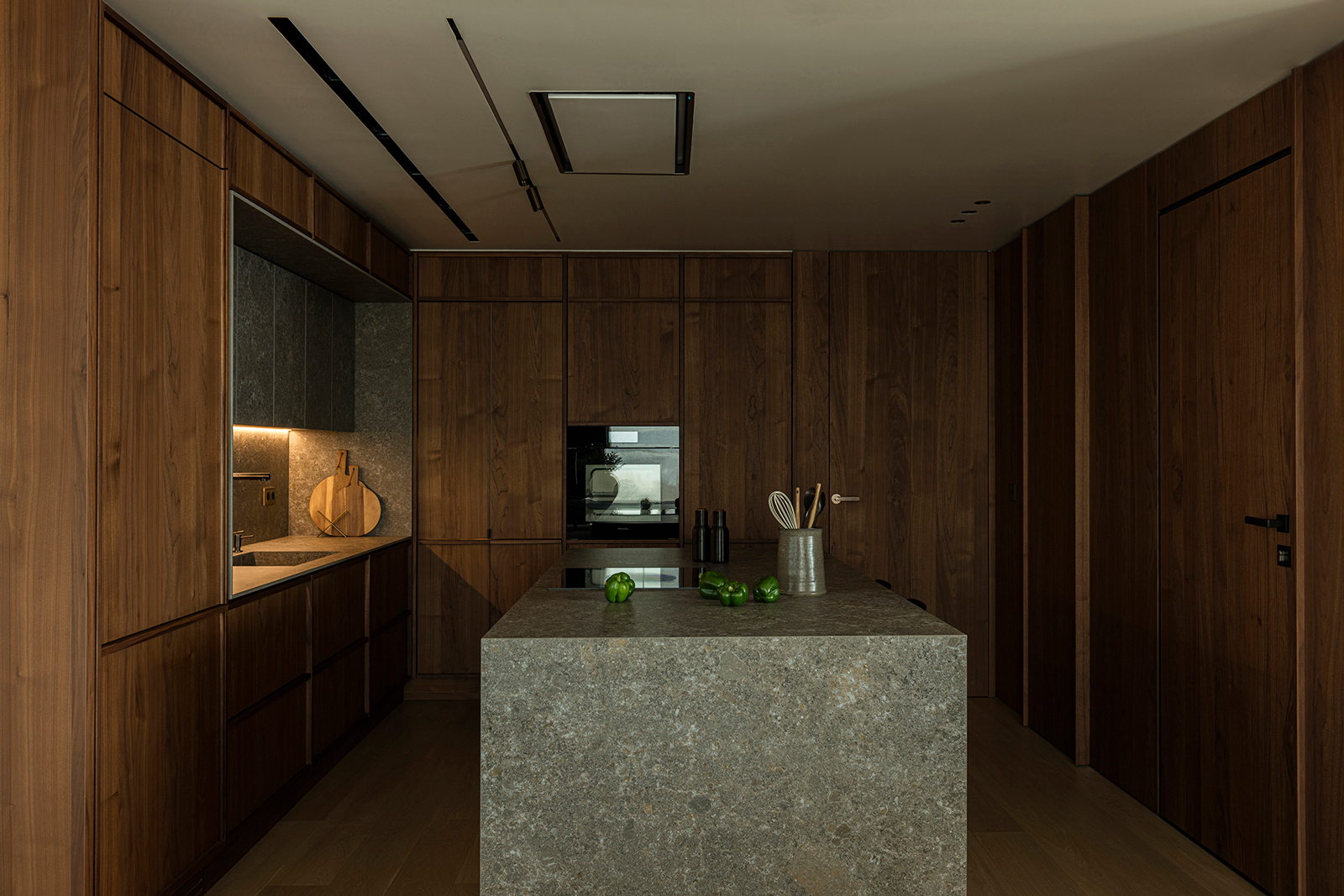The kitchen, although directly connected to the dining area, was treated as a separate entity. Earthy materials dominate here, with walnut wood and ceramic surfaces defining a sense of warm separation while maintaining the strict geometries of the overall project. All kitchen surfaces are clad in walnut, reinforcing the impression of a cohesive, self-contained spatial unit. Every detail -handles, linear inserts, ceramic finishes- was carefully designed to emphasize craftsmanship while remaining consistent with the apartment’s minimalist character. The island stands as a sculptural element: its angled supports are the only feature that breaks from the otherwise orthogonal geometry.