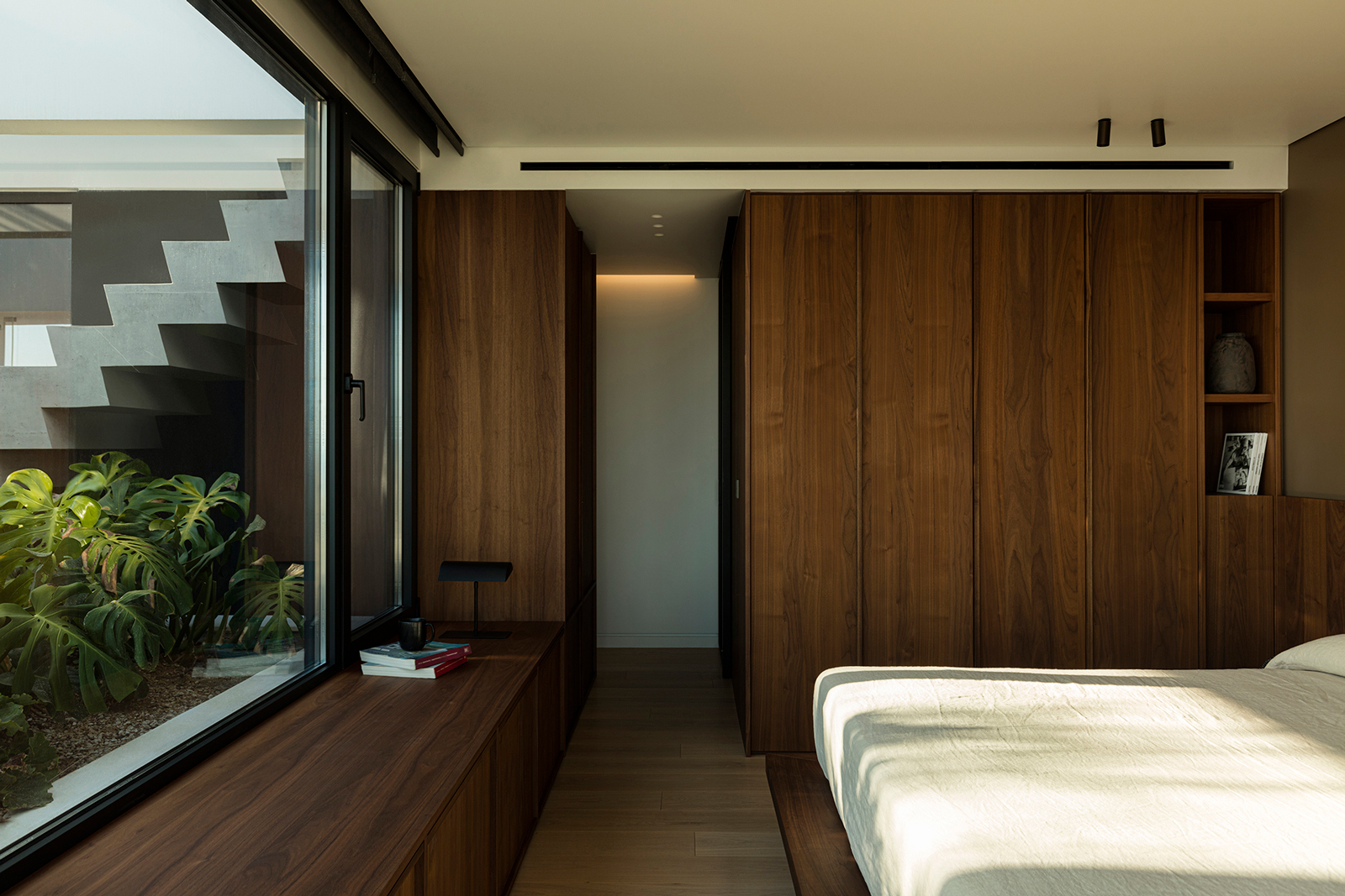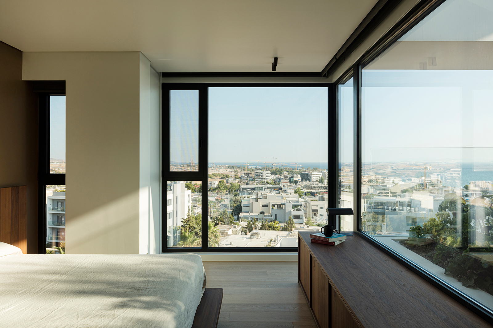 Ο σχεδιασμός του κυρίως υπνοδωματίου εστίασε στη χωρική σύνδεση με τον εξωτερικό κήπο και στην ανεμπόδιστη θέα προς τον Σαρωνικό. Η εσοχή πρασίνου, ήσυχη και προστατευμένη, ενισχύει την αίσθηση ηρεμίας που προσφέρει η θέα προς τη θάλασσα, συνθέτοντας έναν χώρο ανάπαυσης που ισορροπεί ανάμεσα στην εσωστρέφεια και την εξωστρέφεια του φυσικού περιβάλλοντος.
