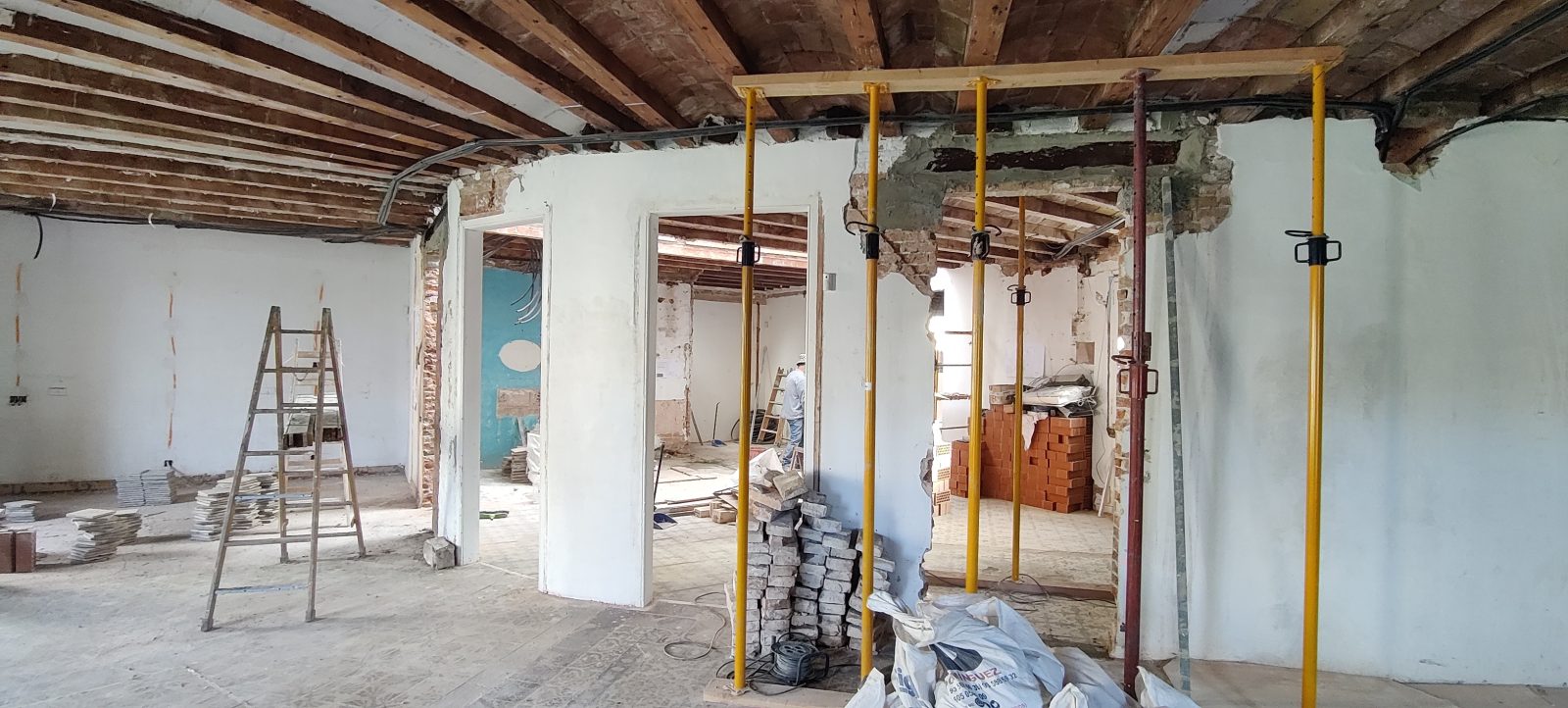 Crossing these thresholds into the main living area, the ceiling beams begin to radiate outward, forming a gentle curvature that reinforces the project’s unfolding logic. The front rooms were unified, central partitions removed, and space reconfigured into a continuous living area. These spaces are open yet articulated: large rooms unfold organically, defined by subtle curves and thresholds that echo the building’s perimeter.