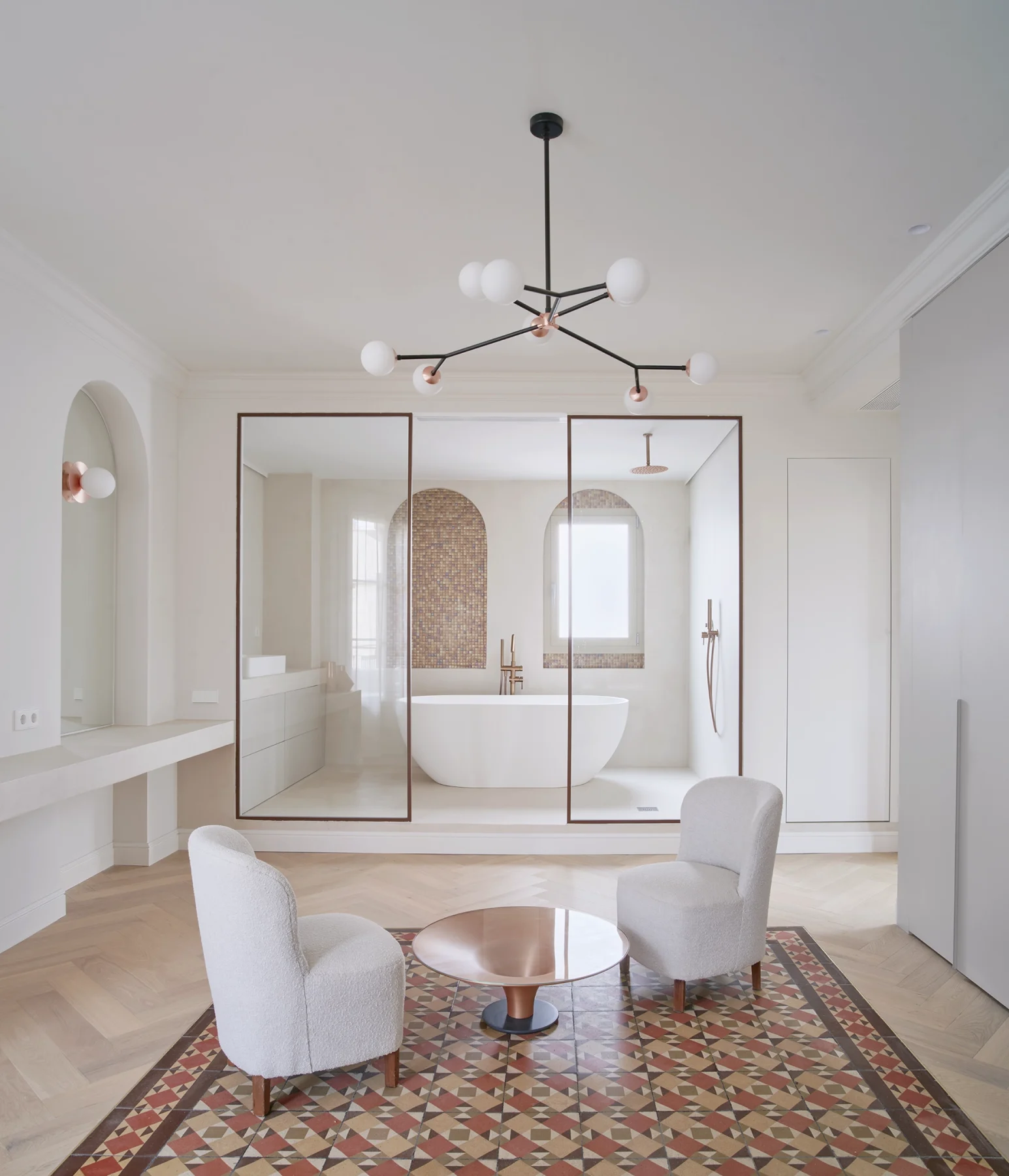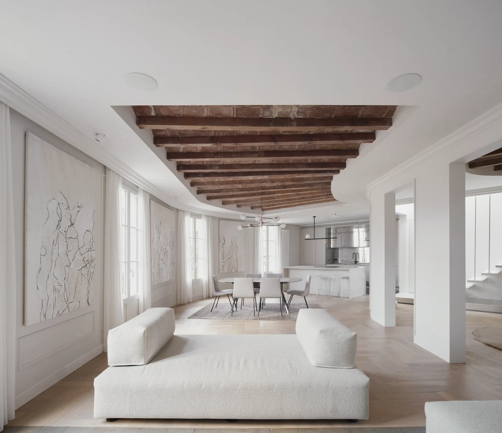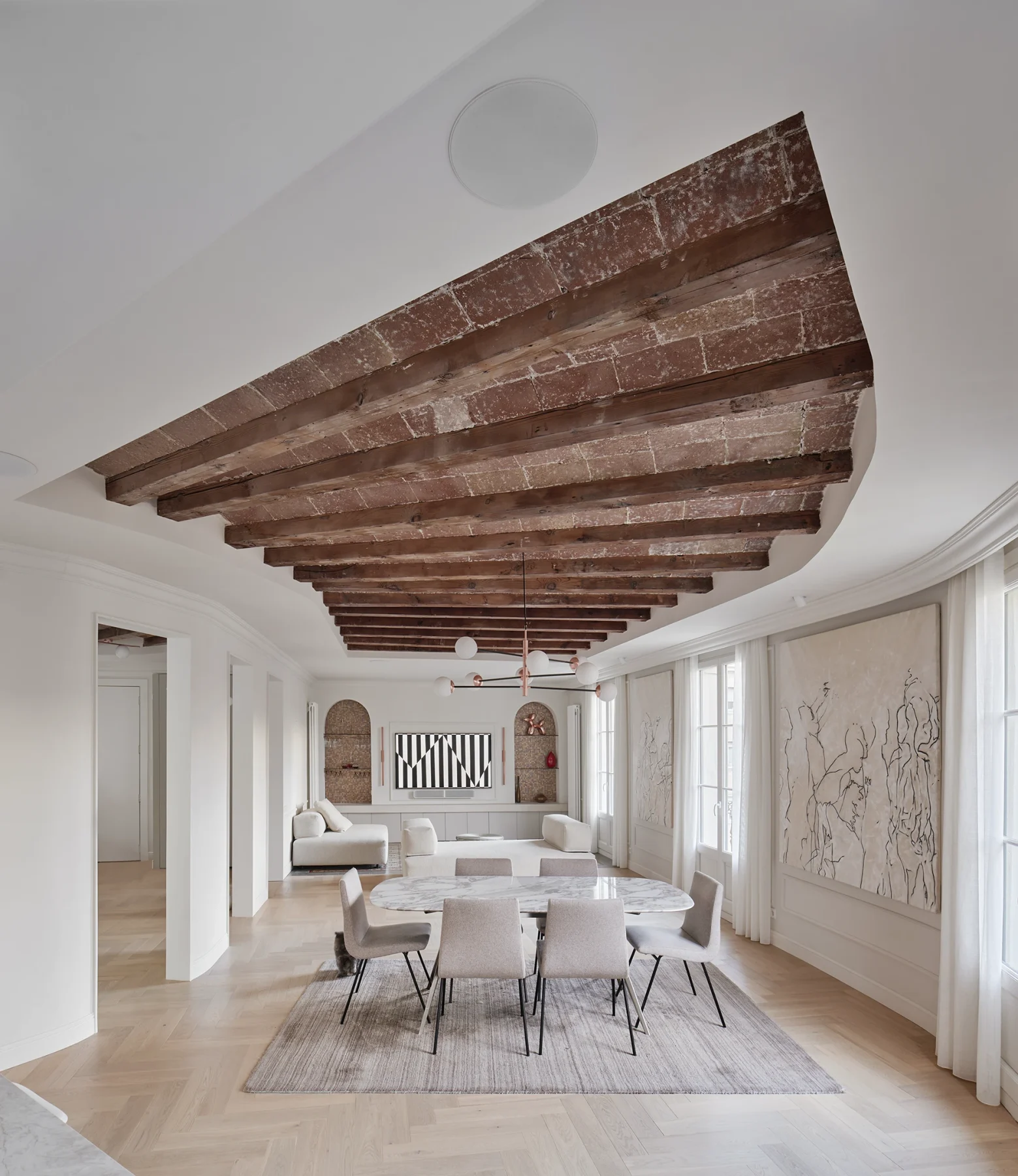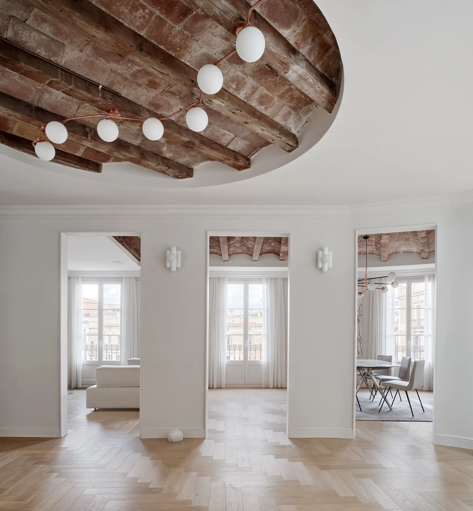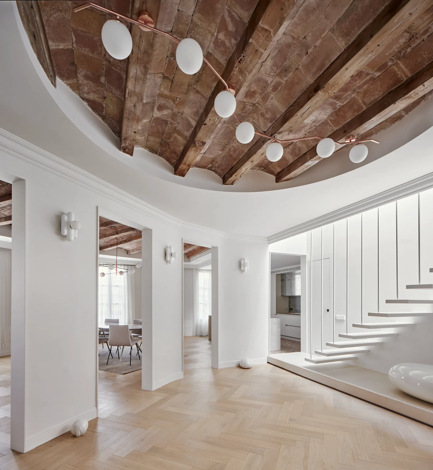 Light plays a defining role, entering through restored wooden openings and skylights, casting soft shadows across a palette of off-whites, pale oak parquet, and copper accents.