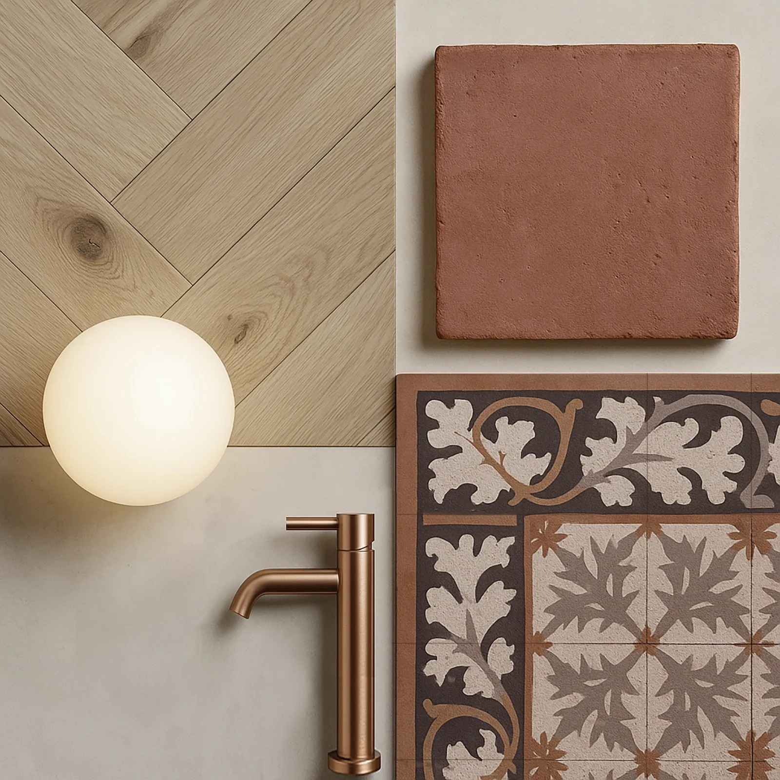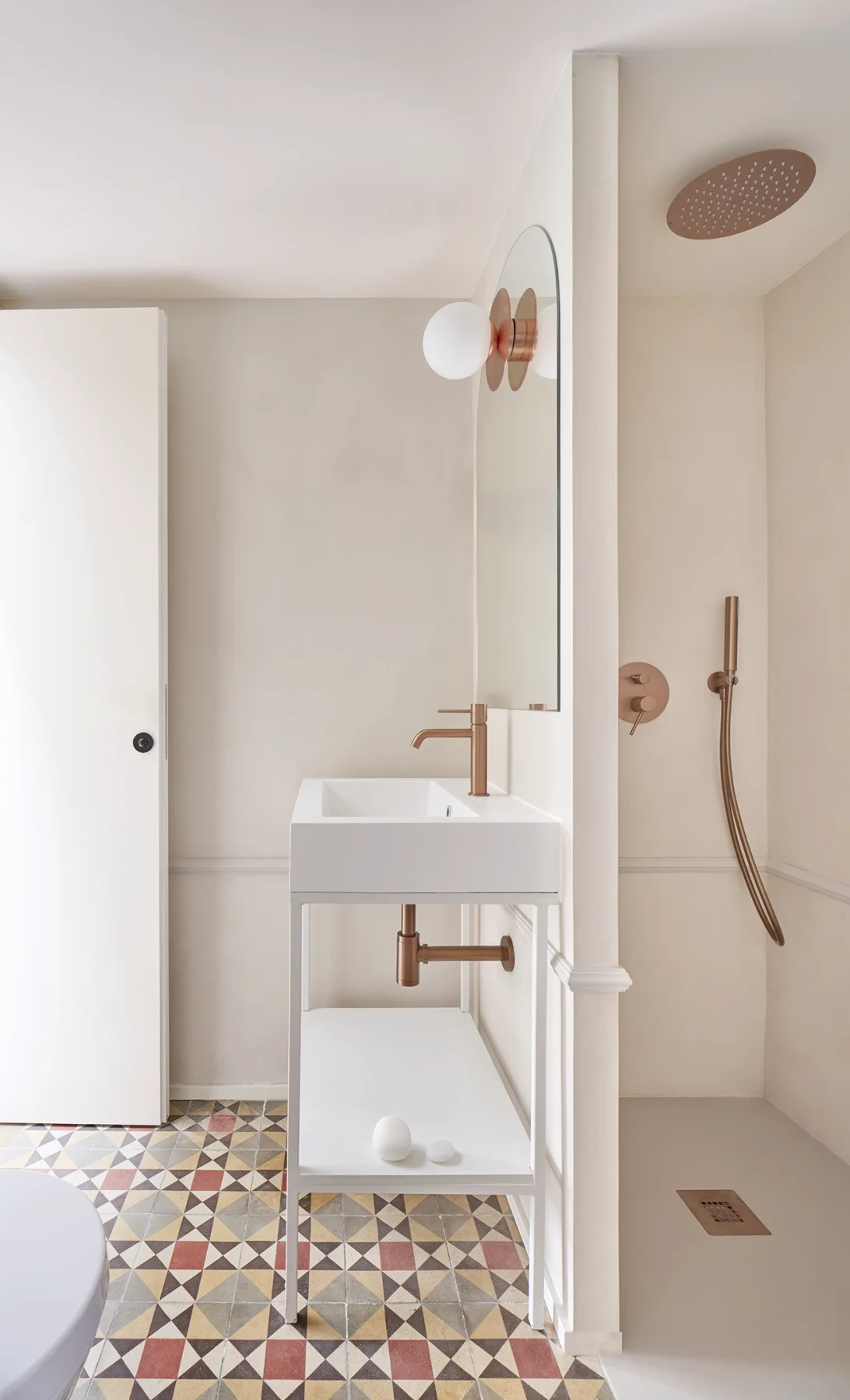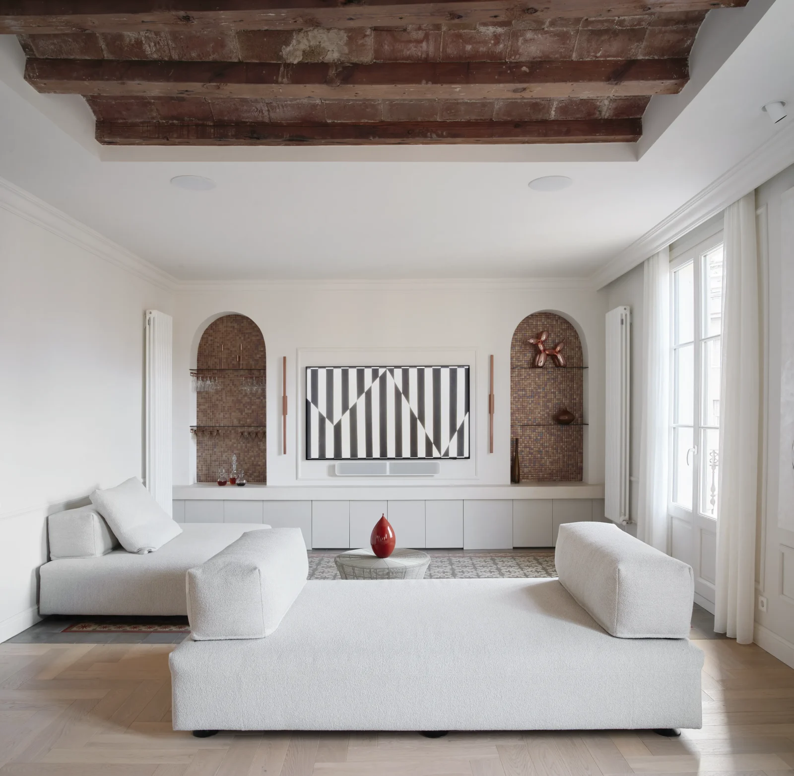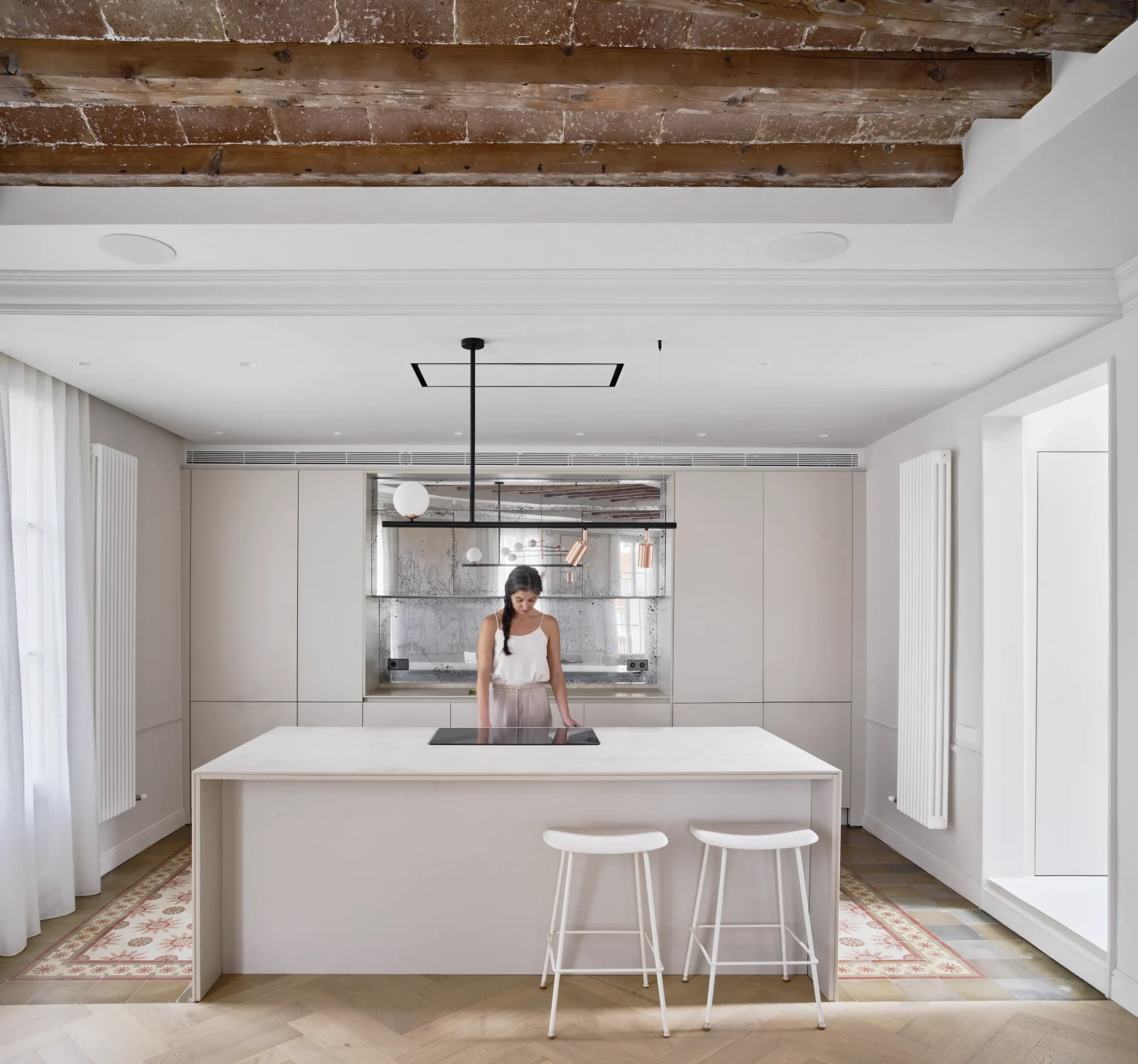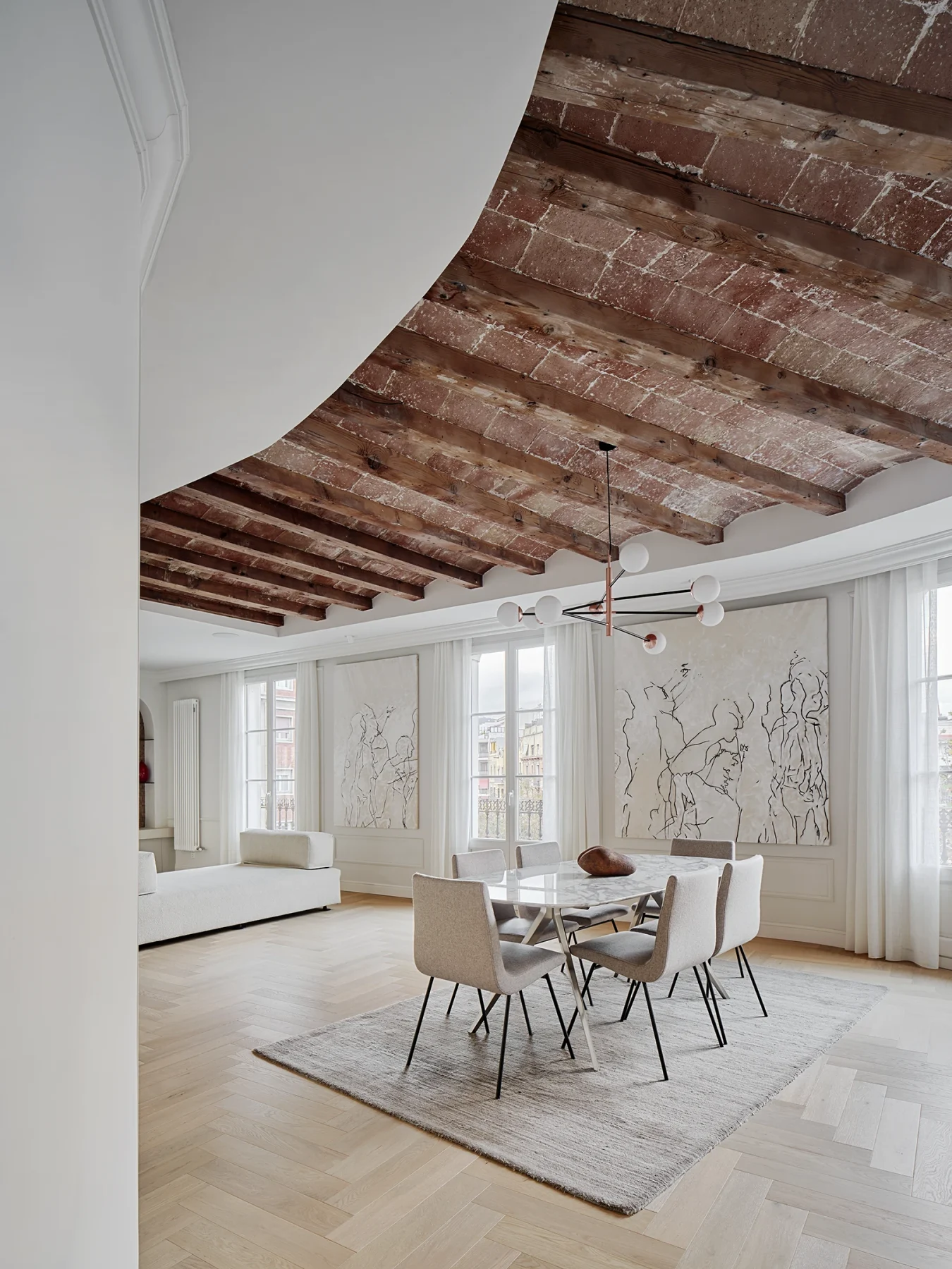 Light plays a defining role, entering through restored wooden openings and skylights, casting soft shadows across a palette of off-whites, pale oak parquet, and copper accents.