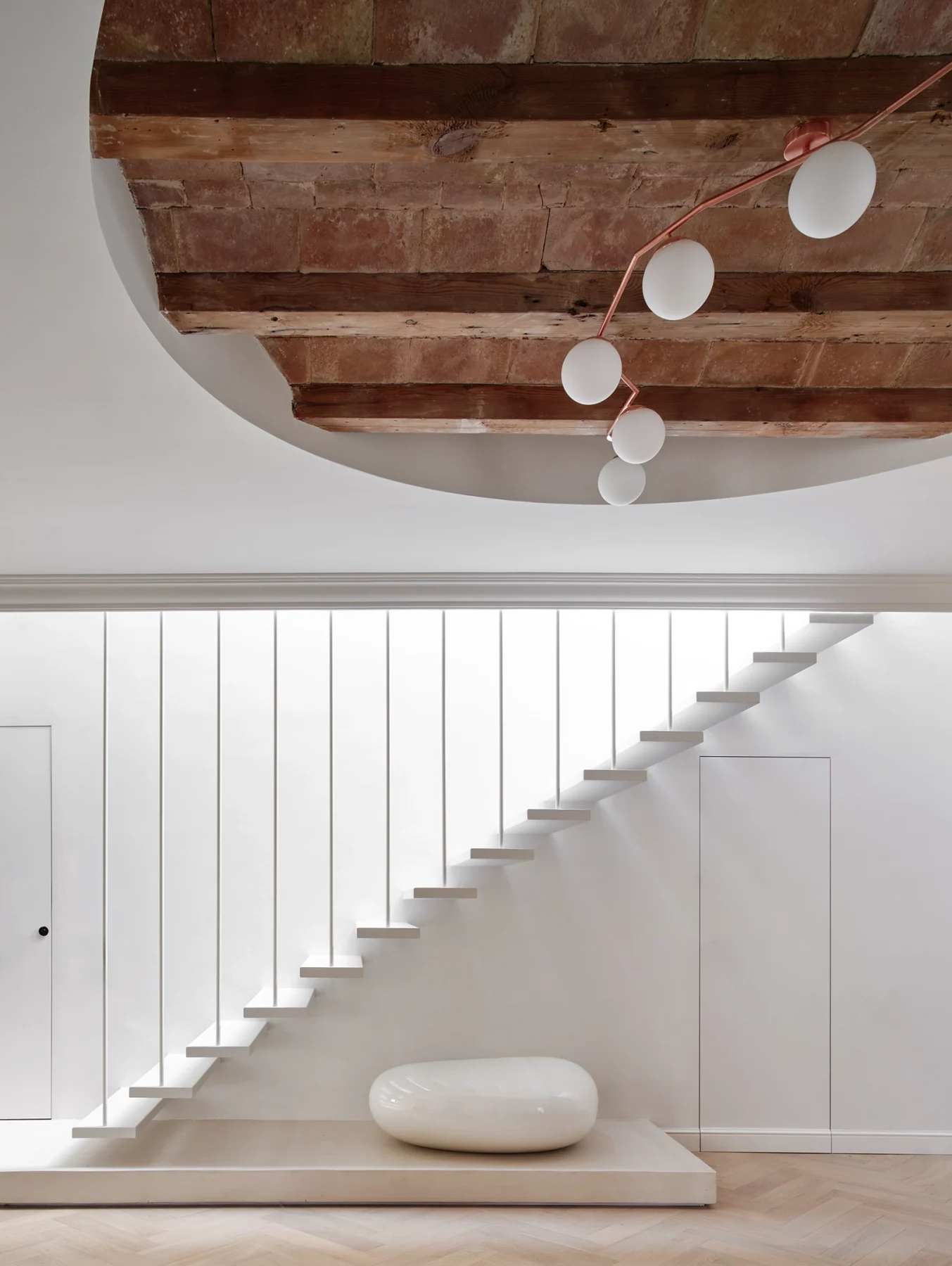 There, a custom-designed white staircase rises beneath a dramatic 7-meter-long automatized skylight, carved into the original roof. Suspended from slender vertical rods and poised above a pebble-like stone plinth, the staircase becomes both a vertical light well and the compositional anchor of the home. From this point, the apartment opens in a radial configuration, dissolving the corridor-room typology in favor of a flowing, interconnected sequence of spaces.