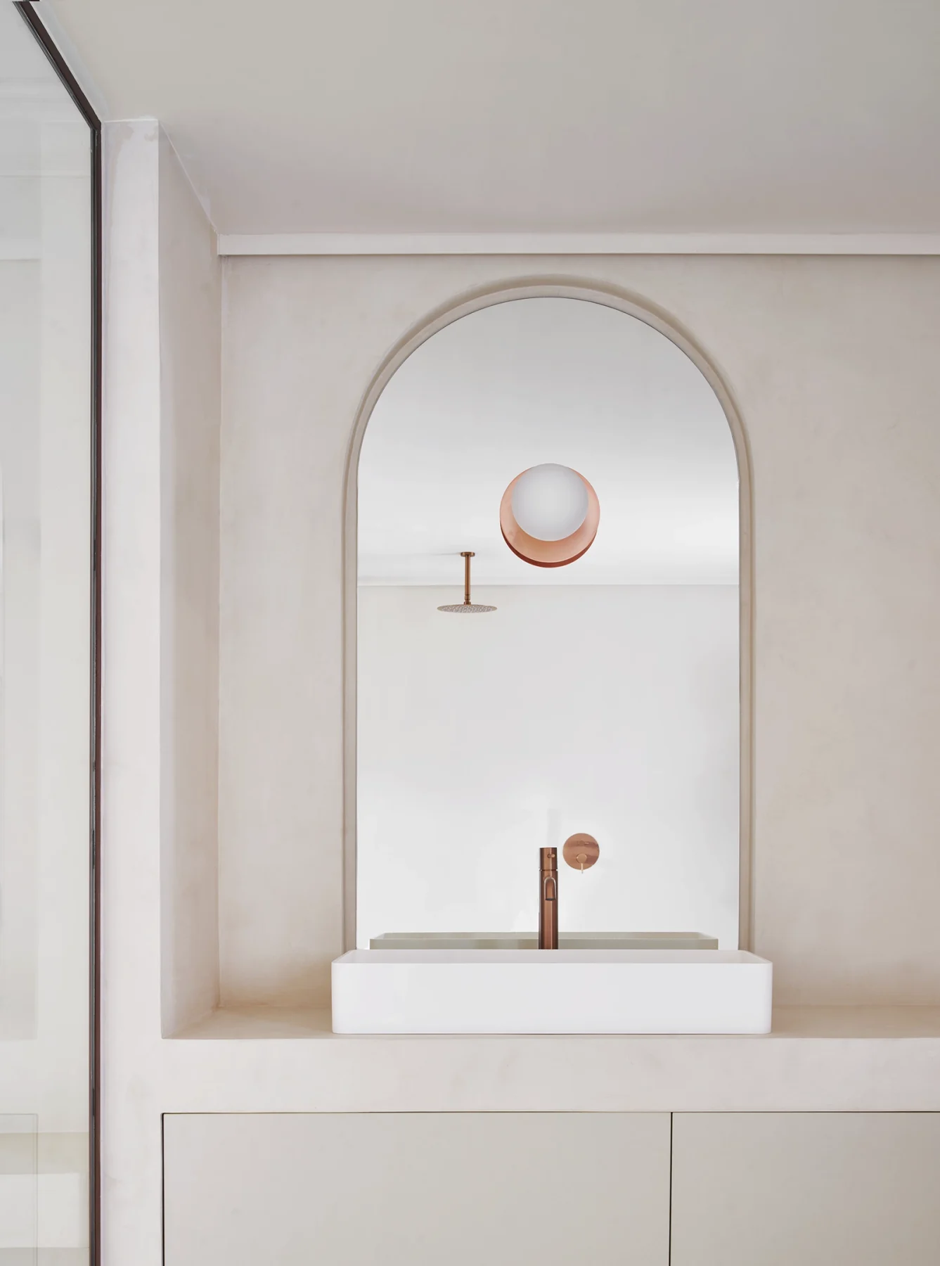 In the main living room, three monumental canvases etched with figurative line drawings animate the walls like contemporary echoes of classical friezes. A mirrored kitchen backsplash and matte copper fixtures establish a dialogue between old and new.