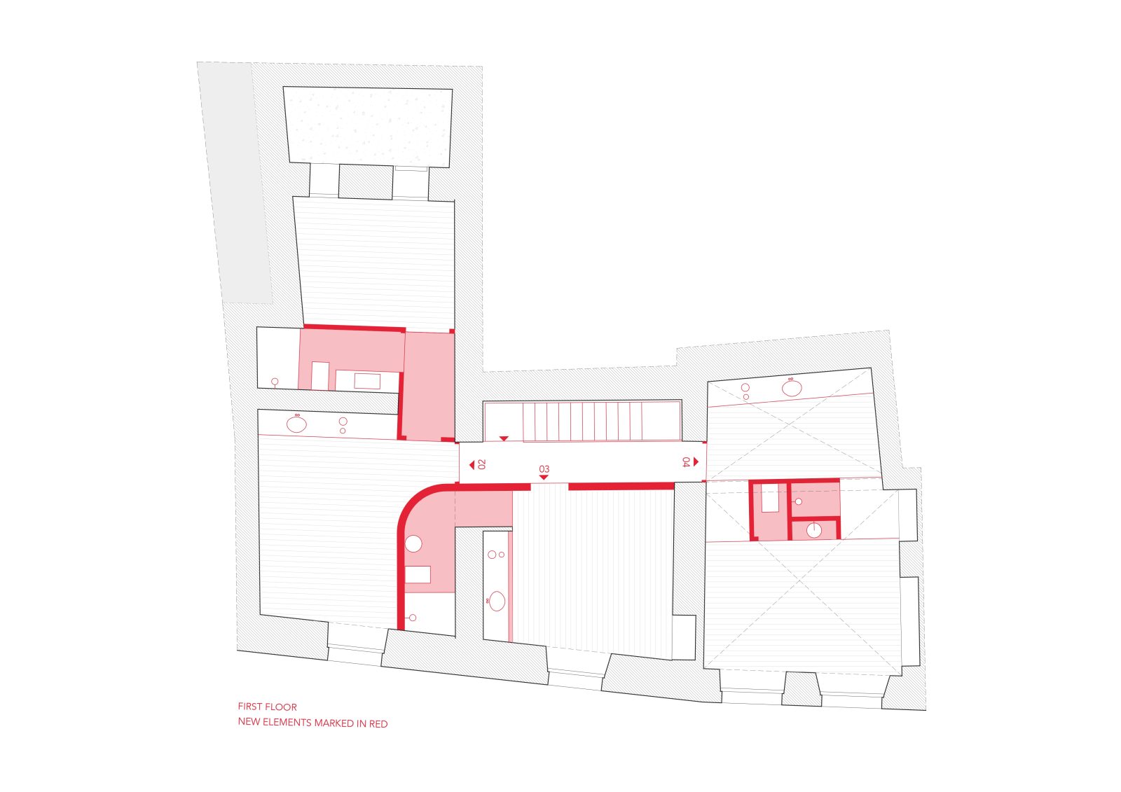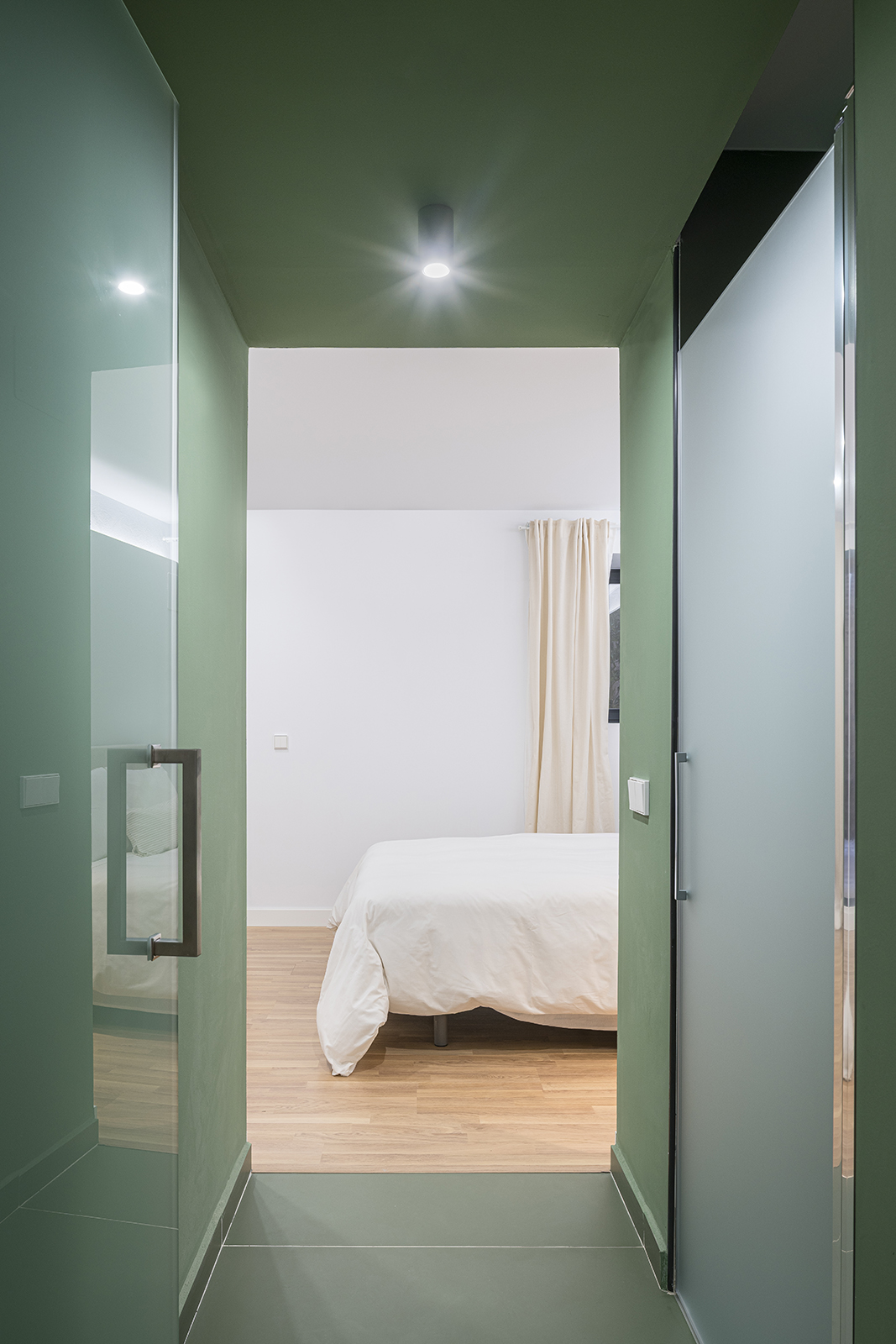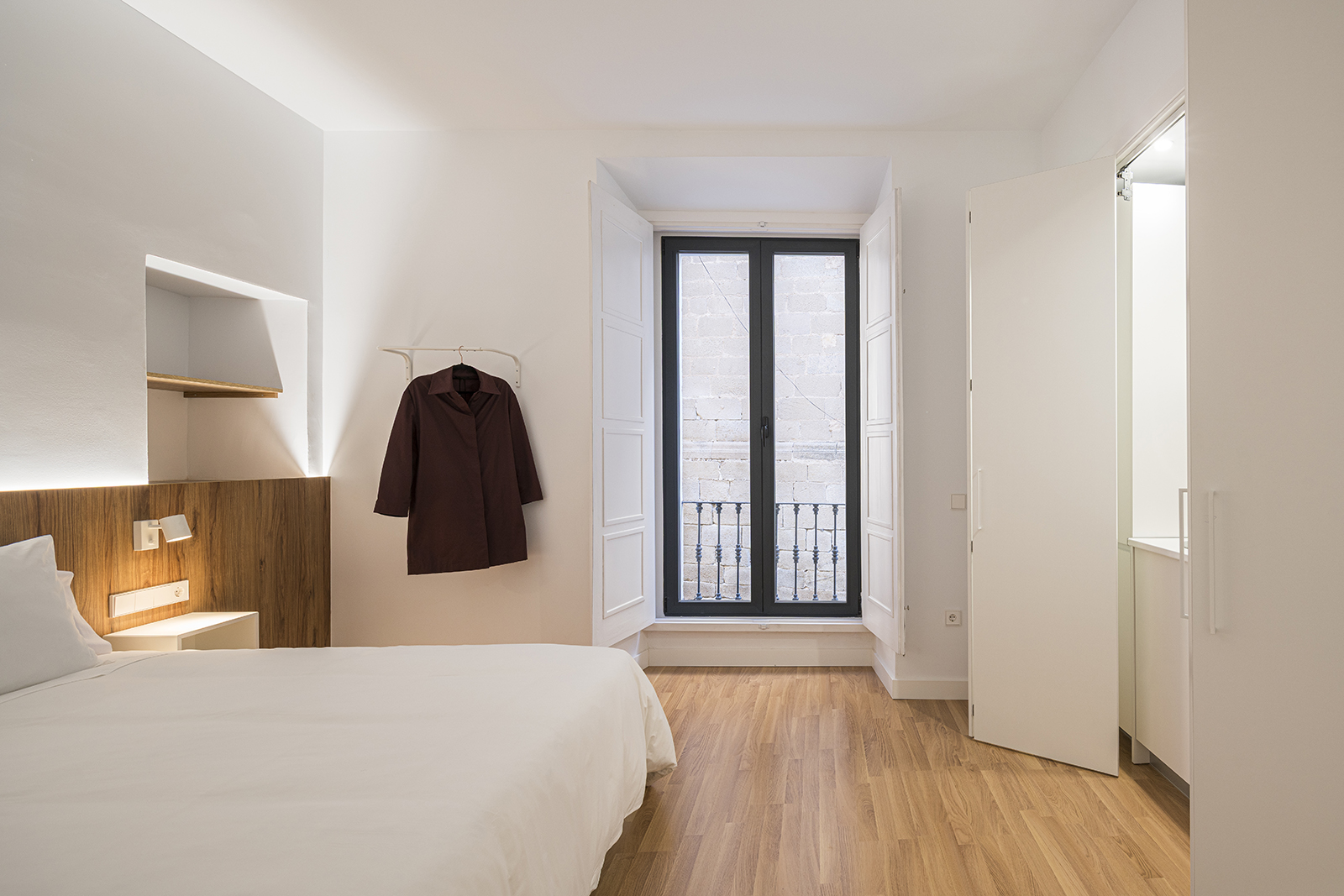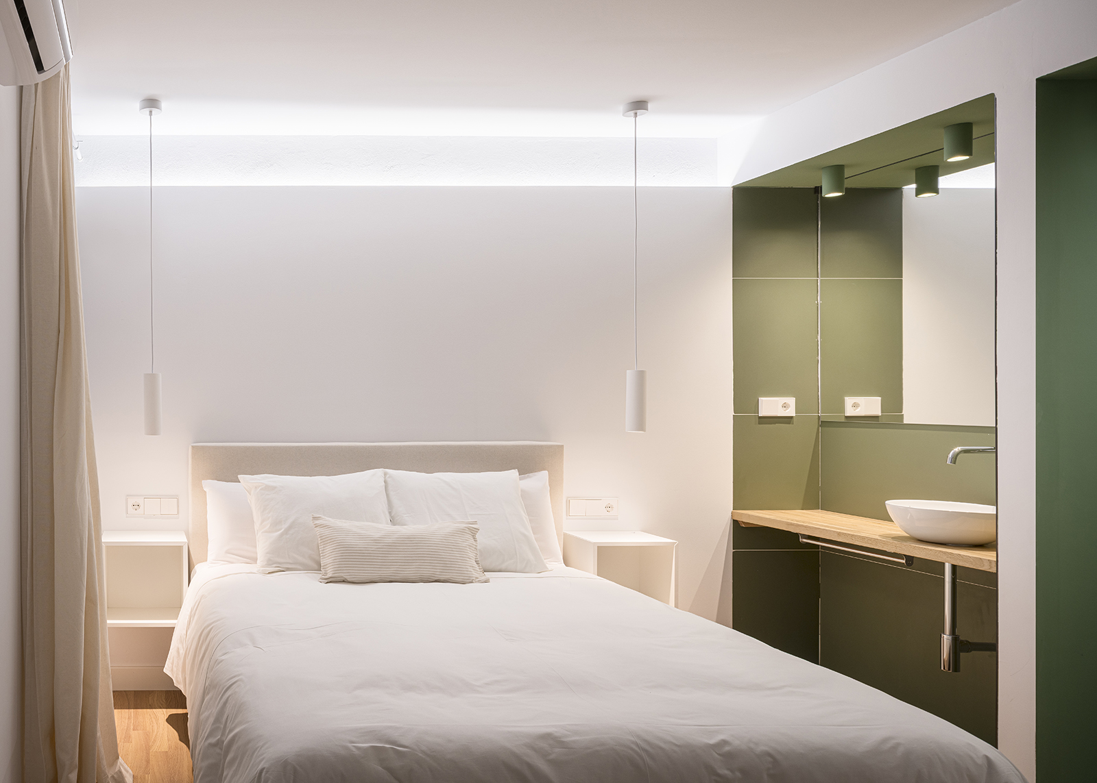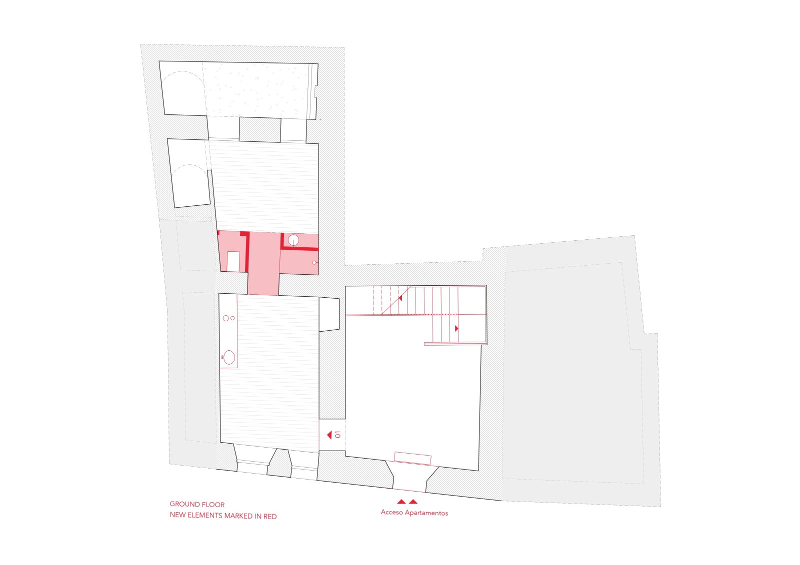 The ground floor is designated as the only and main access, independent from the rest of the flats, and a new staircase is incorporated in the central room. In this way, the number of server spaces is reduced to a minimum, optimising the surface area available for the different tourist apartments.