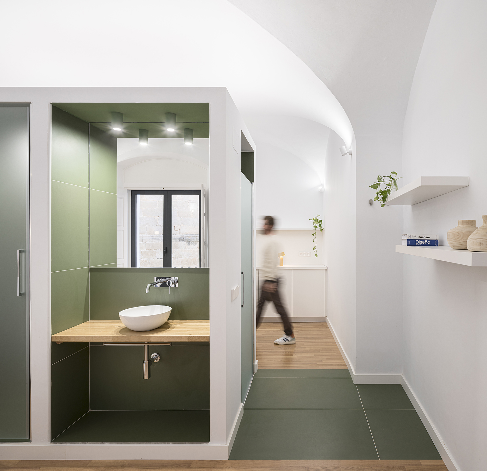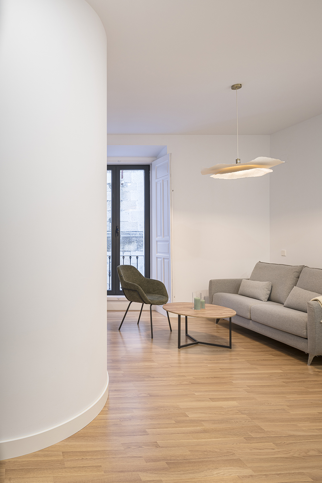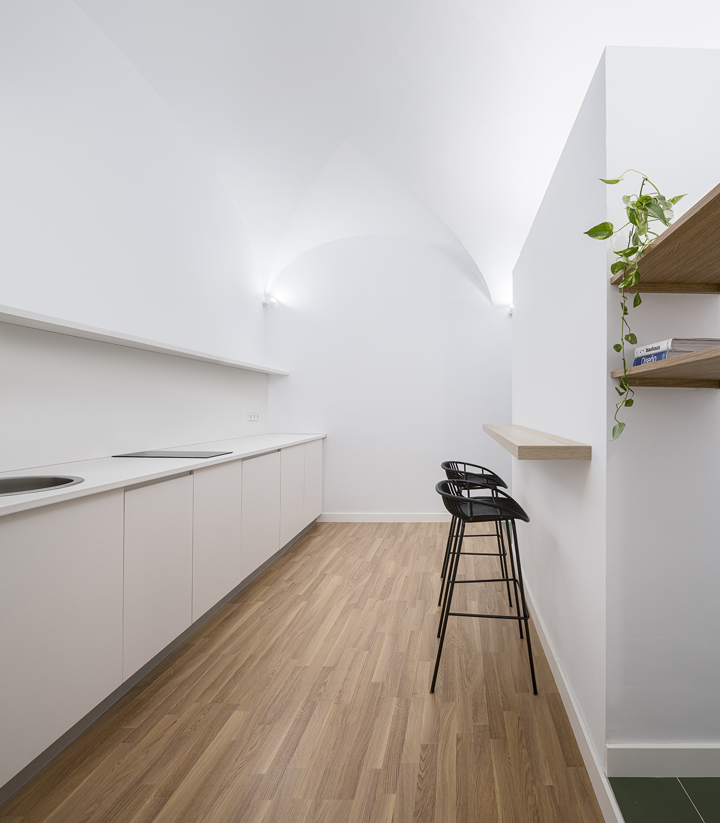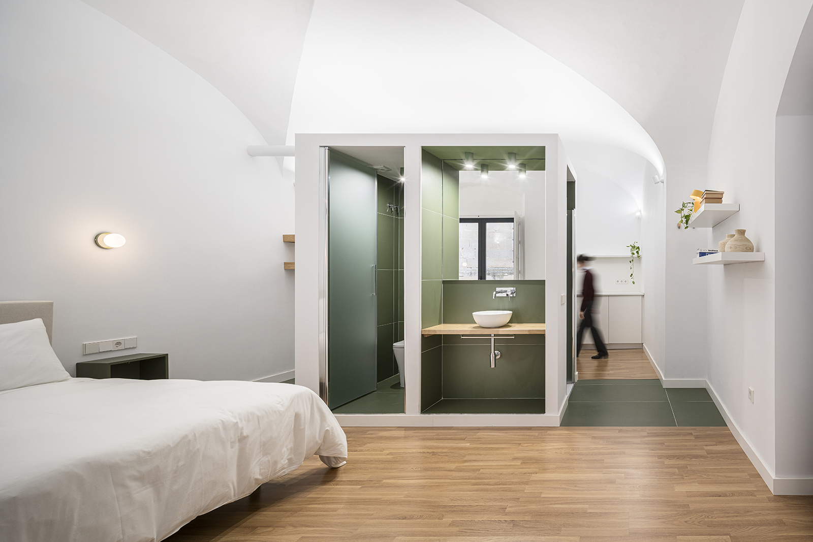 This is not the case in apartment four, whose walls enclose two groin vaults. In order to enhance the value of both vaults, the wet core is placed in the center of the room, without reaching the ceiling or touching the walls.