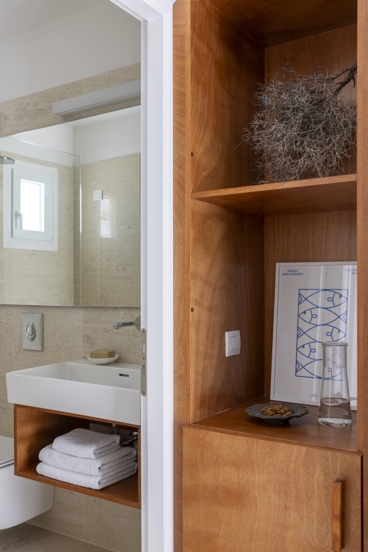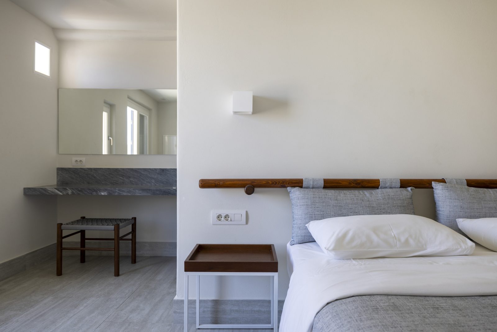 The recent renovation aimed to preserve the Cycladic character reflected in its exterior architecture, while introducing a fresh, contemporary interior design rooted in minimalism and tradition.